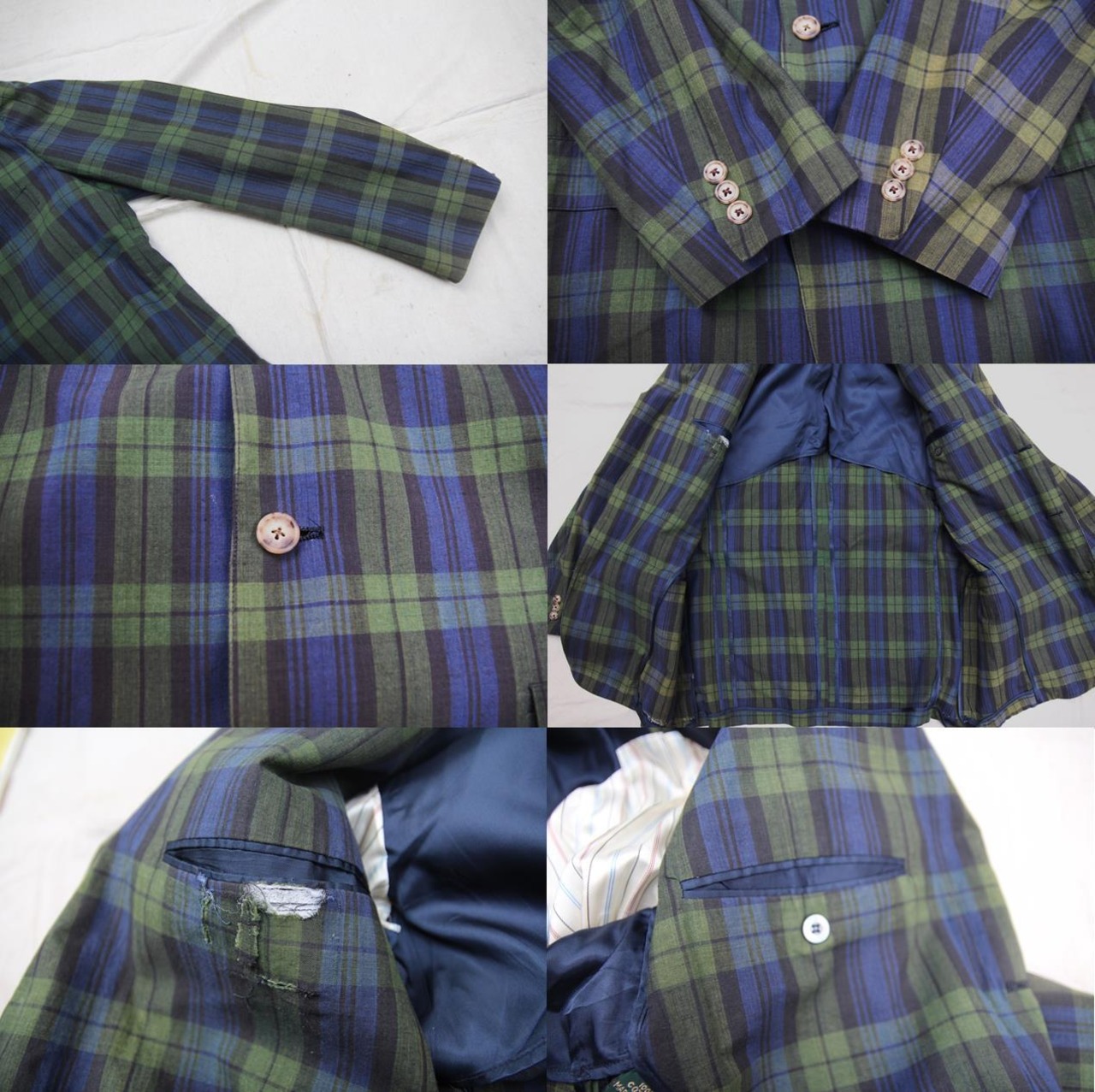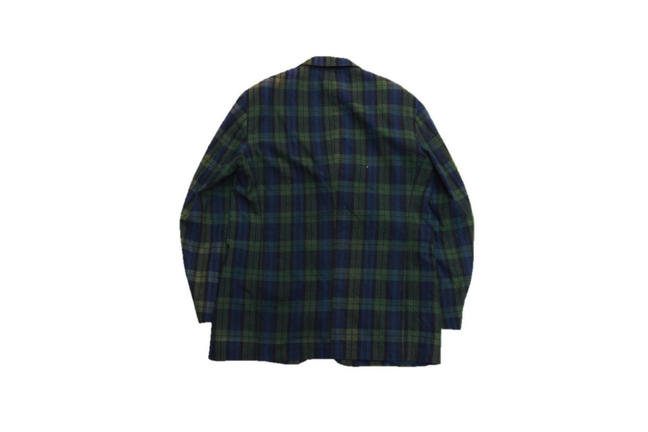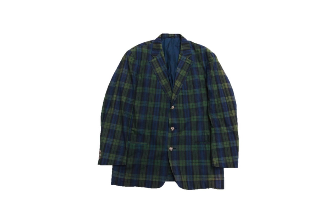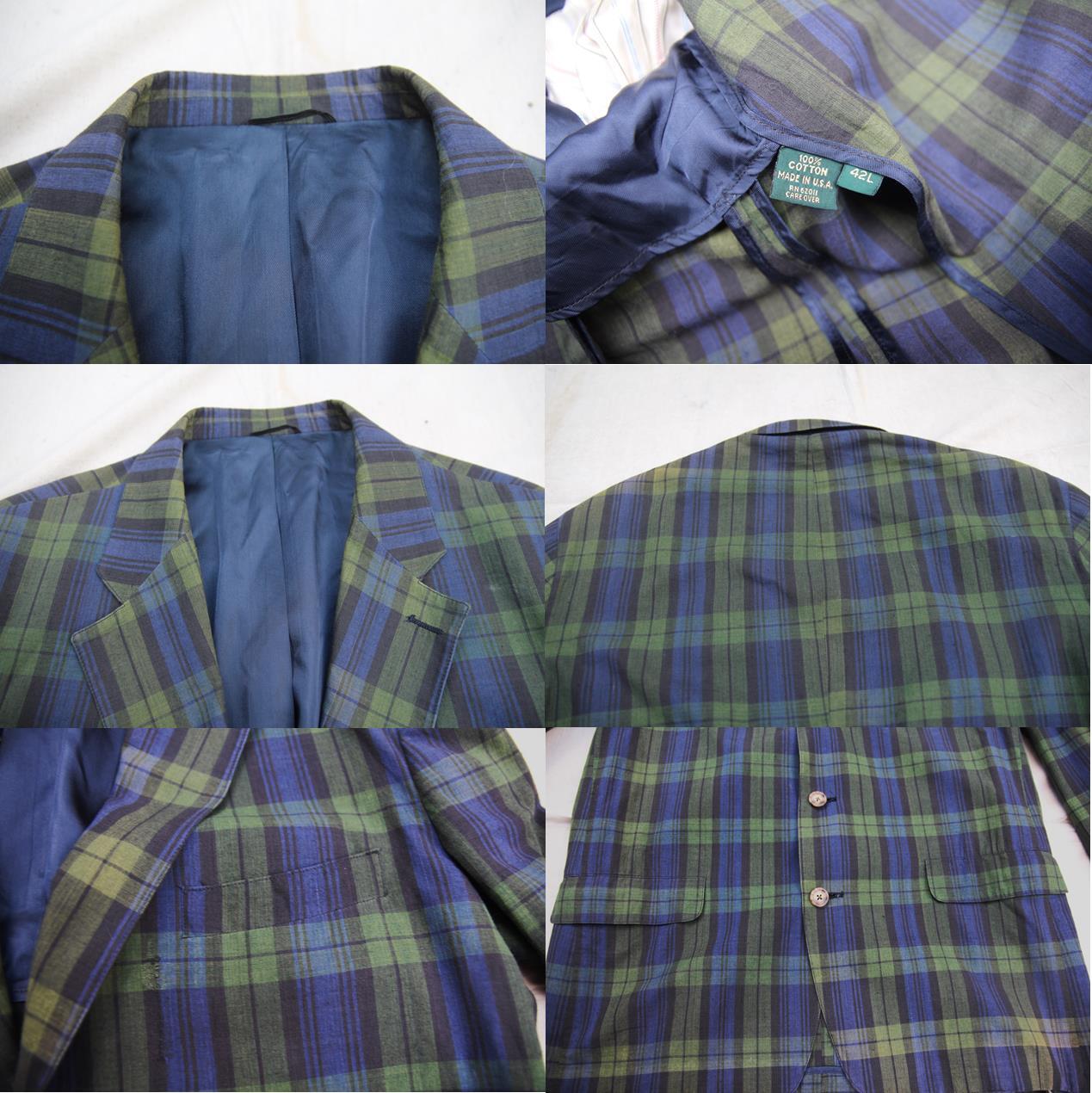 1980年代から90年代頃のコットンテーラードジャケットとなります。ブラックウォッチチェックのお洒落な柄で生地は薄手のコットン地となるのでどうしてもフォーマルになりがちなテーラードジャケットもカジュアルテイストに着用頂けるかと思います。裏脇付近にUSA製の表記タグ付きで左胸、ハンドポケット左右付きとなります。サイズ表記が42Lと大き目シルエットですのでビッグシルエットサイズで着用されたい方、サイズの合う方は是非ご検討下さい。