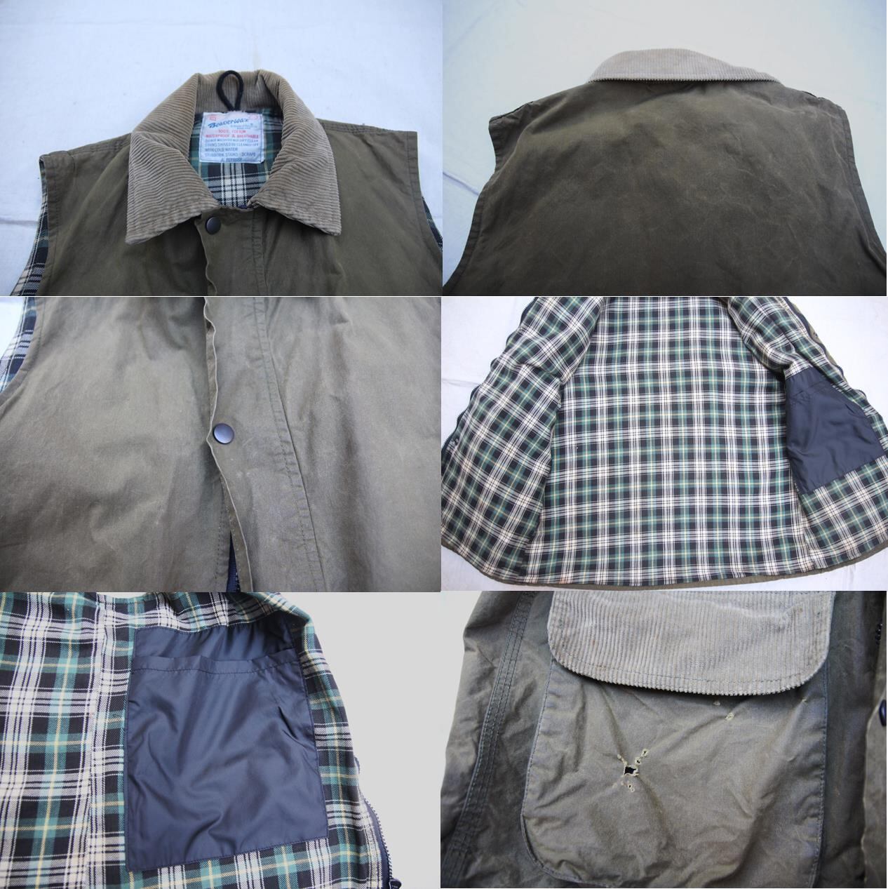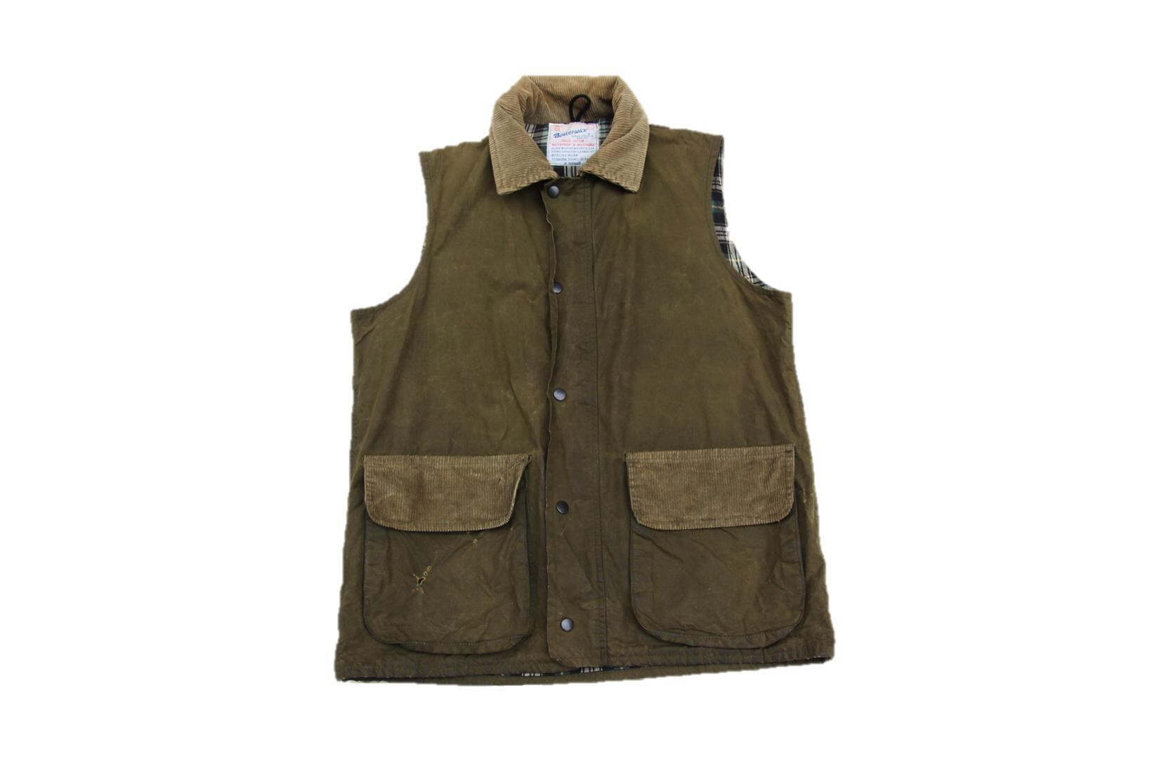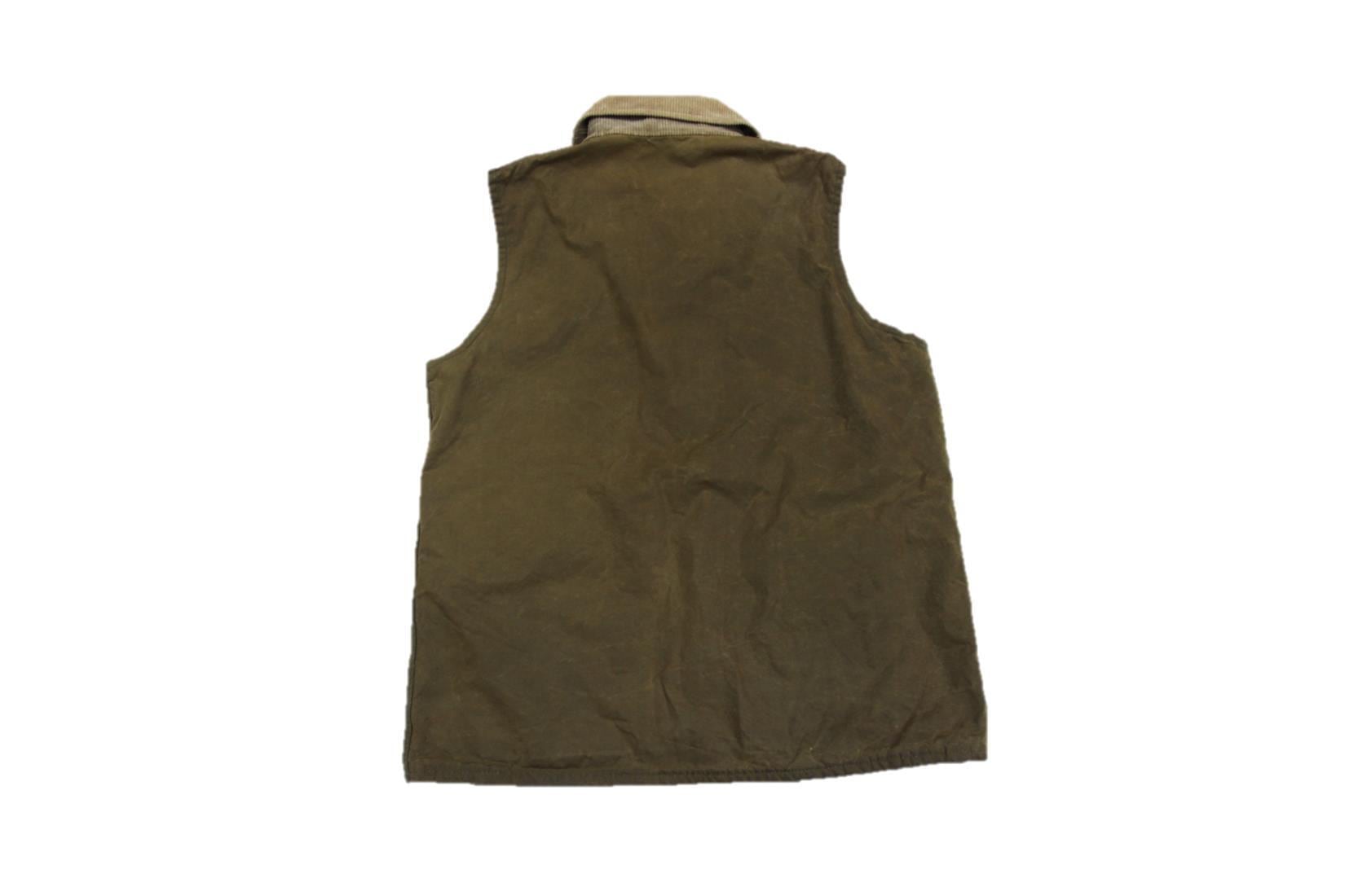 1990年代頃のBeaverwax製のコットンオイルドベストになります。バブアーやベルスタッフ等で有名なコットンオイルドウェアですが、こちらも伝統あるイングランド製となり、衿、ポケットフラップにはコーデュロイ貼り、フロントはボタンとジッパーの2wayタイプとなります。ライナーはイギリスらしいチェック柄パターンとなるのでリバーシブルで着用されても可愛いかと思います。サイズは40ですが程良い緩めなサイズ感ですのでインナーにスウェットやニット類等も問題無く着用頂けます。ジャケットはよく見掛けますがベストは玉数自体少ない為、お探しだった方は是非ご検討下さい。