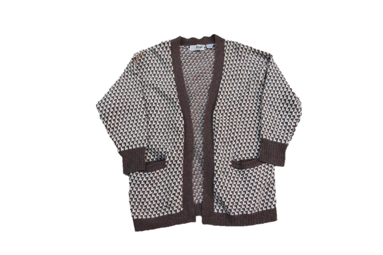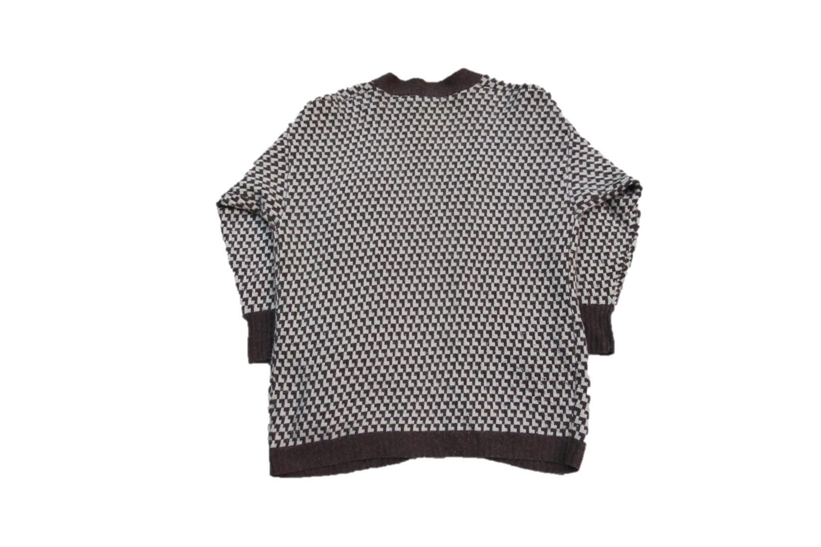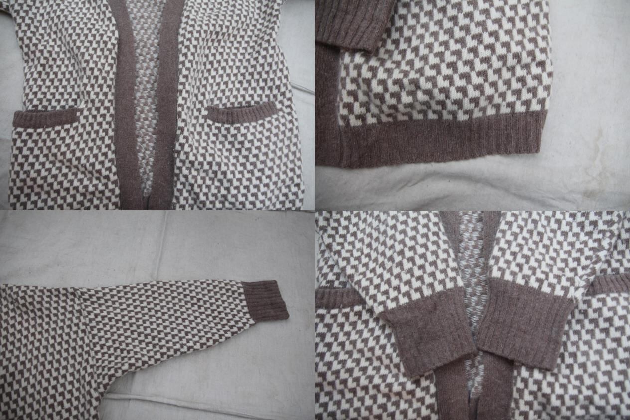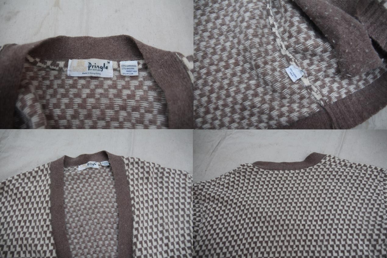 1980年代頃のPringle製ニットカーディガンとなります。素材がウール、ラビットヘアー、アンゴラミックスと豪華な高級毛使用で触り心地が大変柔らかく、着心地が良いカーディガンとなります。矢印の総柄の様な幾何学柄で左右にハンドポケット付きで前立て、袖、腰、ポケット縁部分が単色切り替えとなっております。ボタン、ホールが付かない前開きタイプとなりますので開けて羽織としてお使い頂ける方はご検討下さい。カシミア、モヘア含め高級素材は大分価格高騰しておりますのでこの手のカーディガンをお探しの方は是非ご検討下さい。