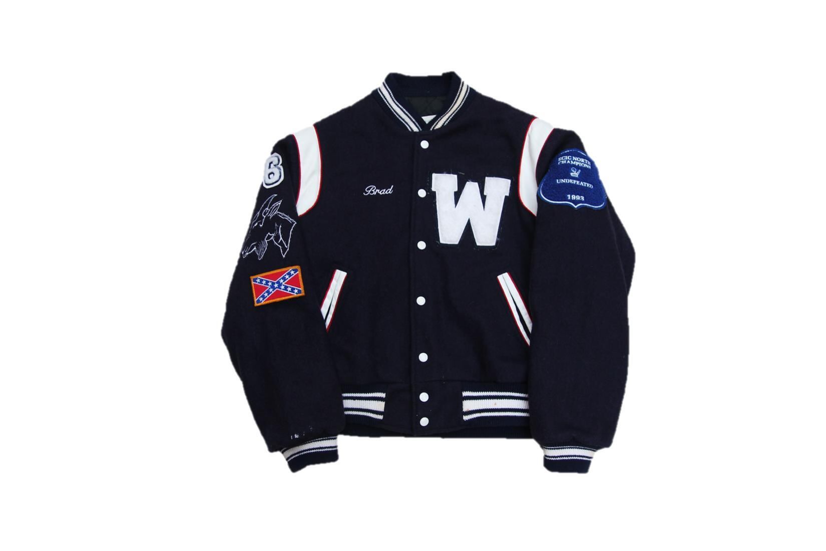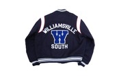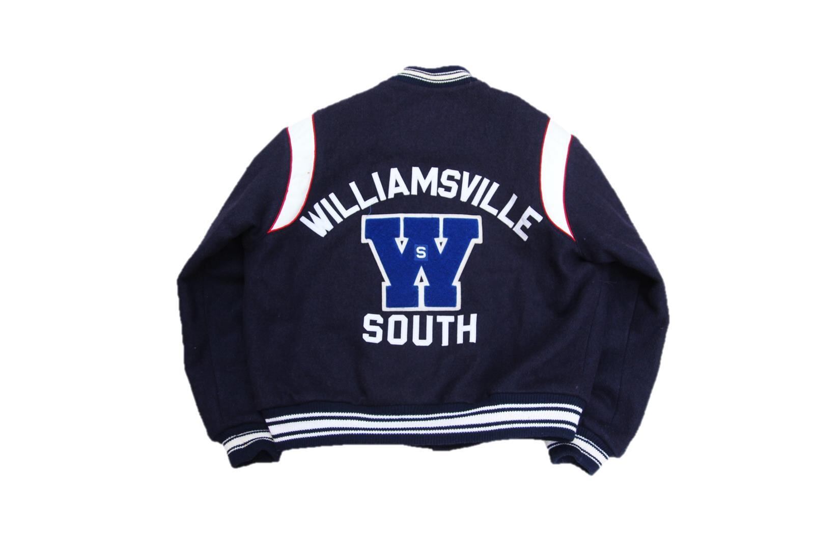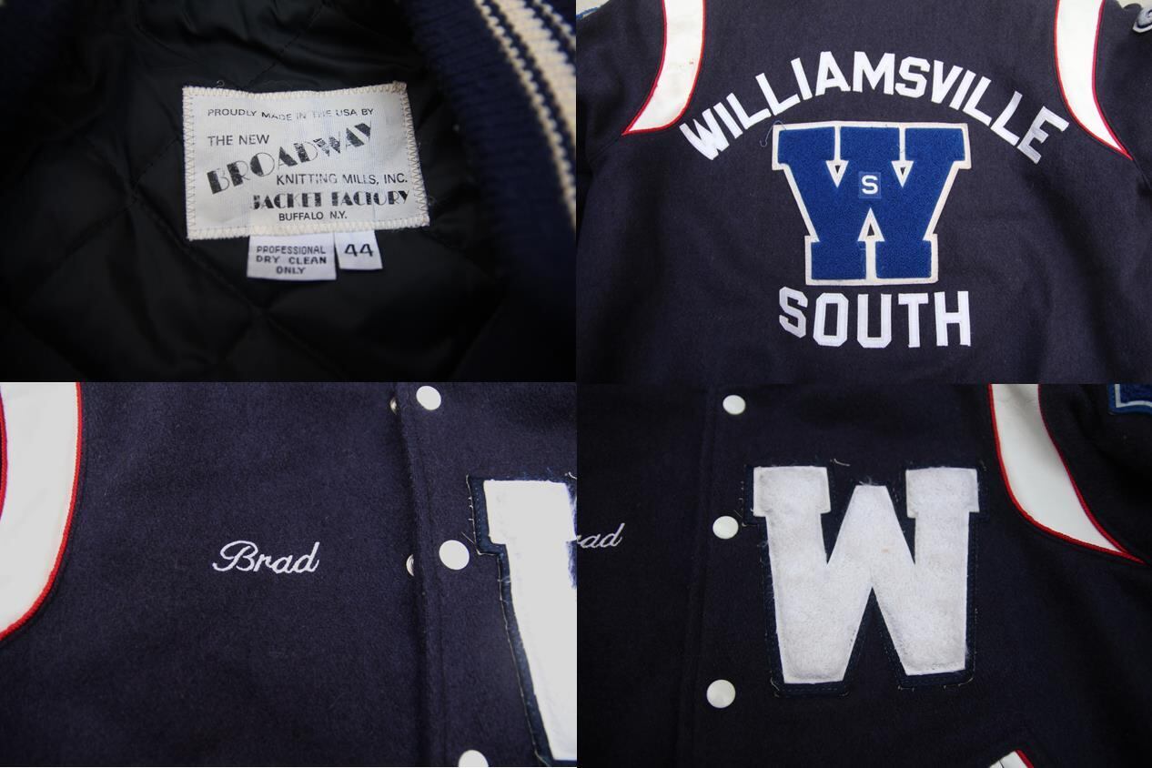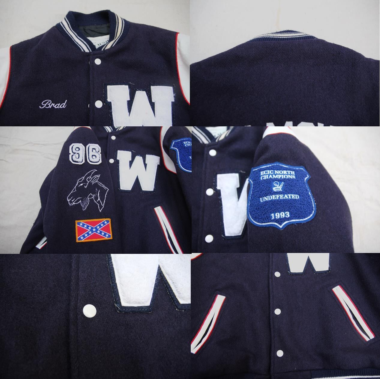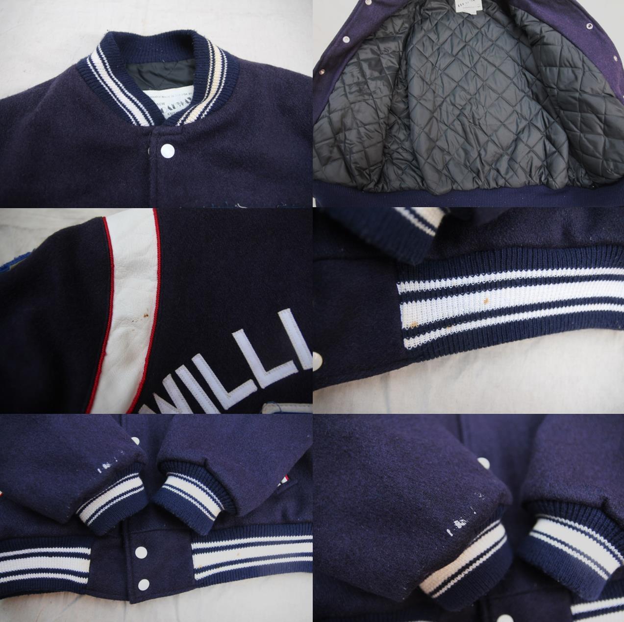 1980年代から90年代頃のThe New Broadway Knitting Mills製のウールスタジアムジャンパーです。両肩部分がショルダーインサートの様なレザー切り替えでポケット縁もレザーで赤白切り替えと細心部まで拘られているデザインです。とにかくワッペンが刺繍が全体的に豪華に入っており、両胸、両袖、バック迄にも入る費用が掛けられているデザインとなります。左袖のワッペンから恐らくゴルフ大会等で1993年から連覇した際のチャンピオンジャケットとして製作されたスタジャンでしょうか。サイズも44表記とどうしても小さ目サイズもしくは丈感が短すぎる物が多いイメージですが、こちらはインナーにも着込めますし、丈感もレイヤードし易いサイズとなっております。近年古着でも大変人気の高いスタジャンですのでお好きな方、探されていた方は是非ご検討下さい。
