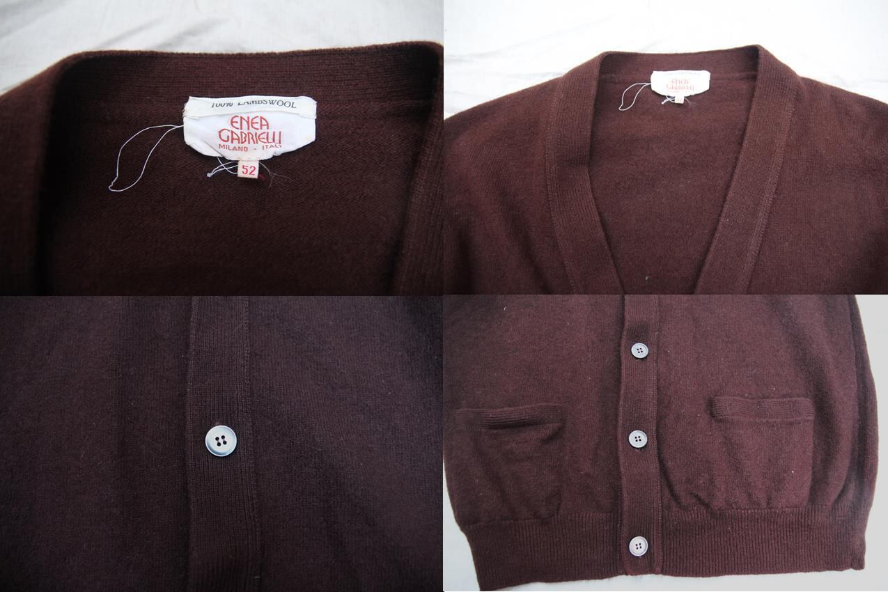 1980年代頃のEnea Gabrielli製ウールカーディガンとなります。イタリア製で質感も上品で柔らかいウールが使用されております。サイズ表記は52ですが、縮んでいるのか多少タイト目なサイズ感で実寸のM程度のサイズ感となります。嬉しい左右にハンドポケット付きでカラーも意外と古着では見掛けないダークブラウンですのでお好きな方、お探しの方は是非ご検討下さい。
