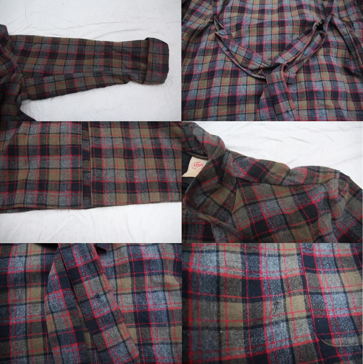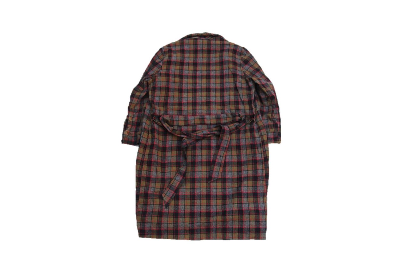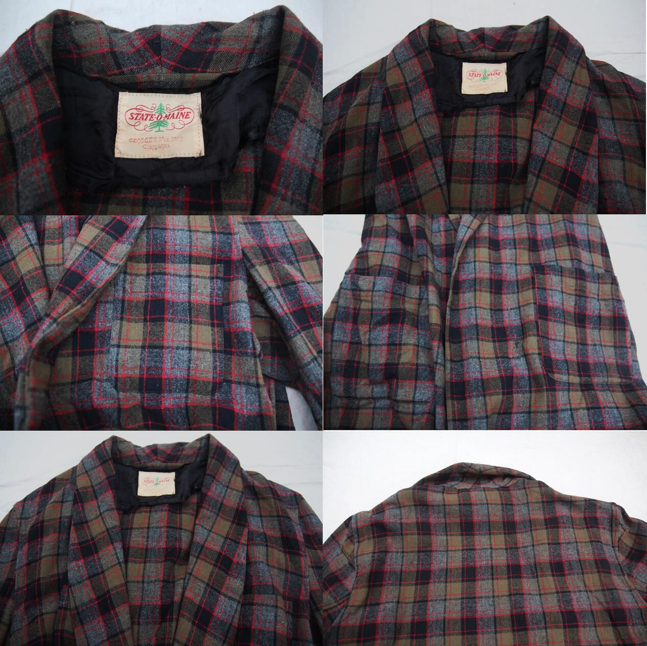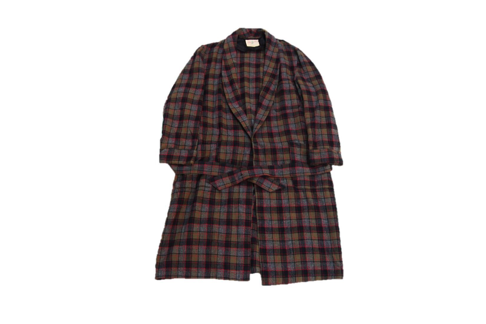 1950年代から60年代頃のState-o-Maine製のウールガウンとなります。比較的細かい格子状のチェック柄となり、ショールカラー、片胸、左右ハンドポケット付きで欠損しがちな腰ベルトも現存しております。サイズ表記等は見当たりませんが、実寸でL程度とガウンでは良い緩めなサイズ感となります。配色もダークベースで使い勝手が良いと思いますのでお好きな方は是非ご検討下さい。
