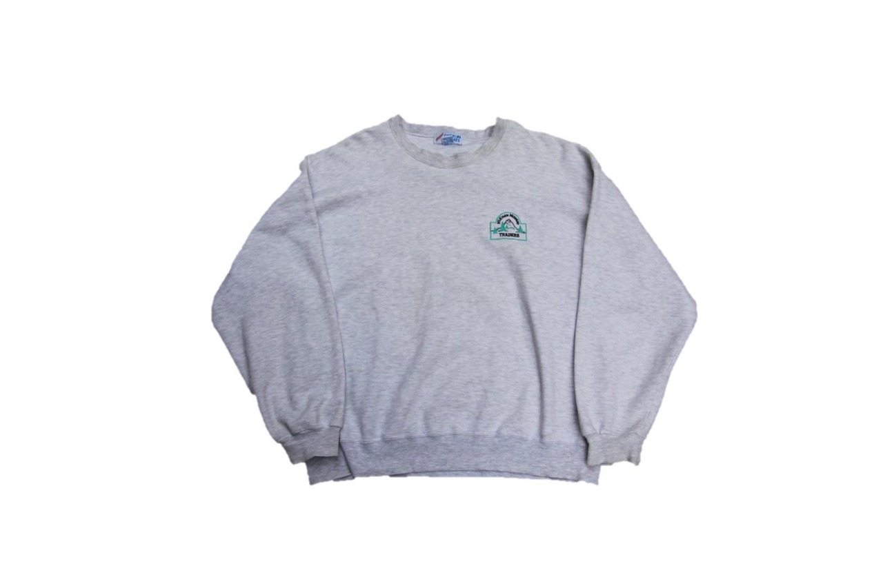 1990年代頃のJerzees製胸刺繍入りスウェットシャツとなります。コットンが強めの8対2でポリエスター特有のテロッ感が少なく着心地の良い素材感となります。胸にはMountain Tradersのと山の刺繍が入る事から登山コーチもしくは専門家等用に生産された物でしょうか。シンプルなデザインでお色も杢グレーでサイズもXLと人気の緩めなサイズ感です。お好きな方は是非ご検討下さい。