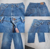 両裾はカットオフ仕様、フロント太腿から脛に掛けて色落ちと擦れ、バックポケット表面部分にも生地擦れ、内部タグ欠損、紙パッチ擦れ、タブに多少のよれ、全体的に色落ち、生地擦れ、使用感が見られます。