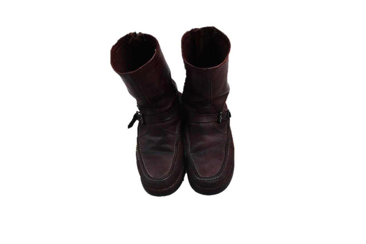 右足ヒールジッパーの故障有り、アッパーからシャフト部分に掛けて革擦れ、剥がれ有り、アウトソールサイド部分に汚れ有り、左右アウトソール減り有り、ストラップに変形有り、全体的に革擦れ、色褪せ、使用感が見られます。