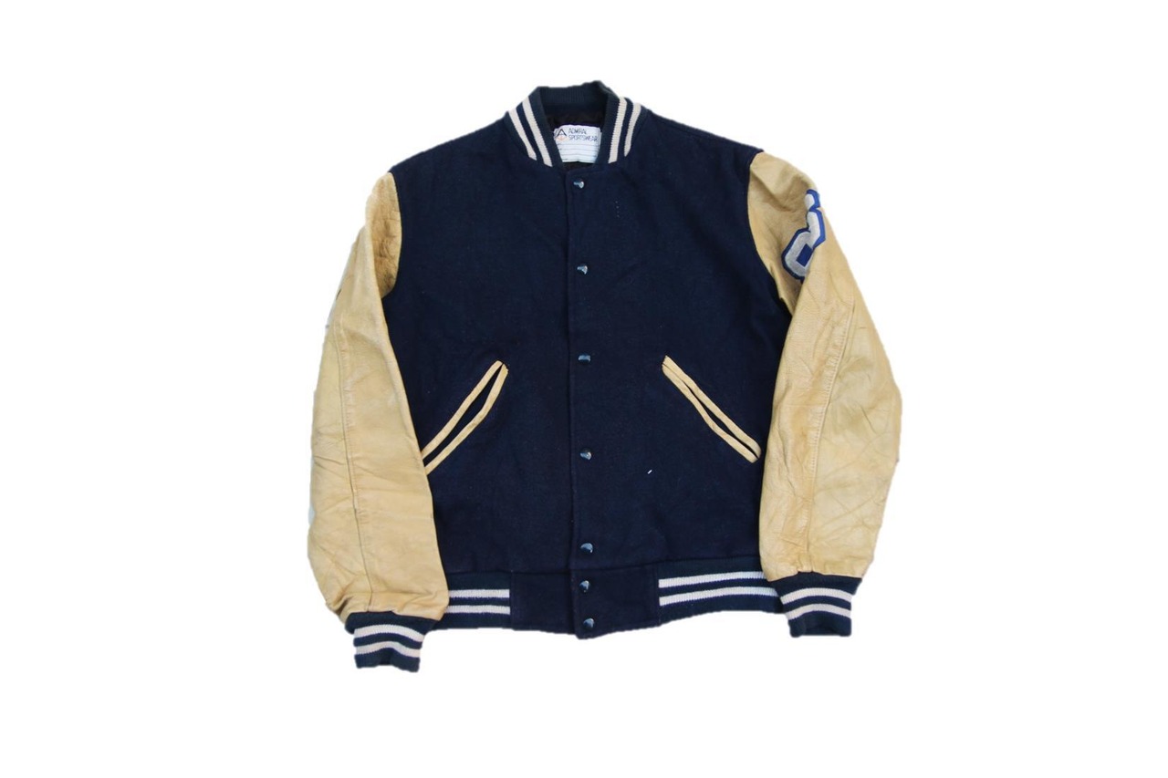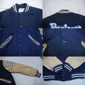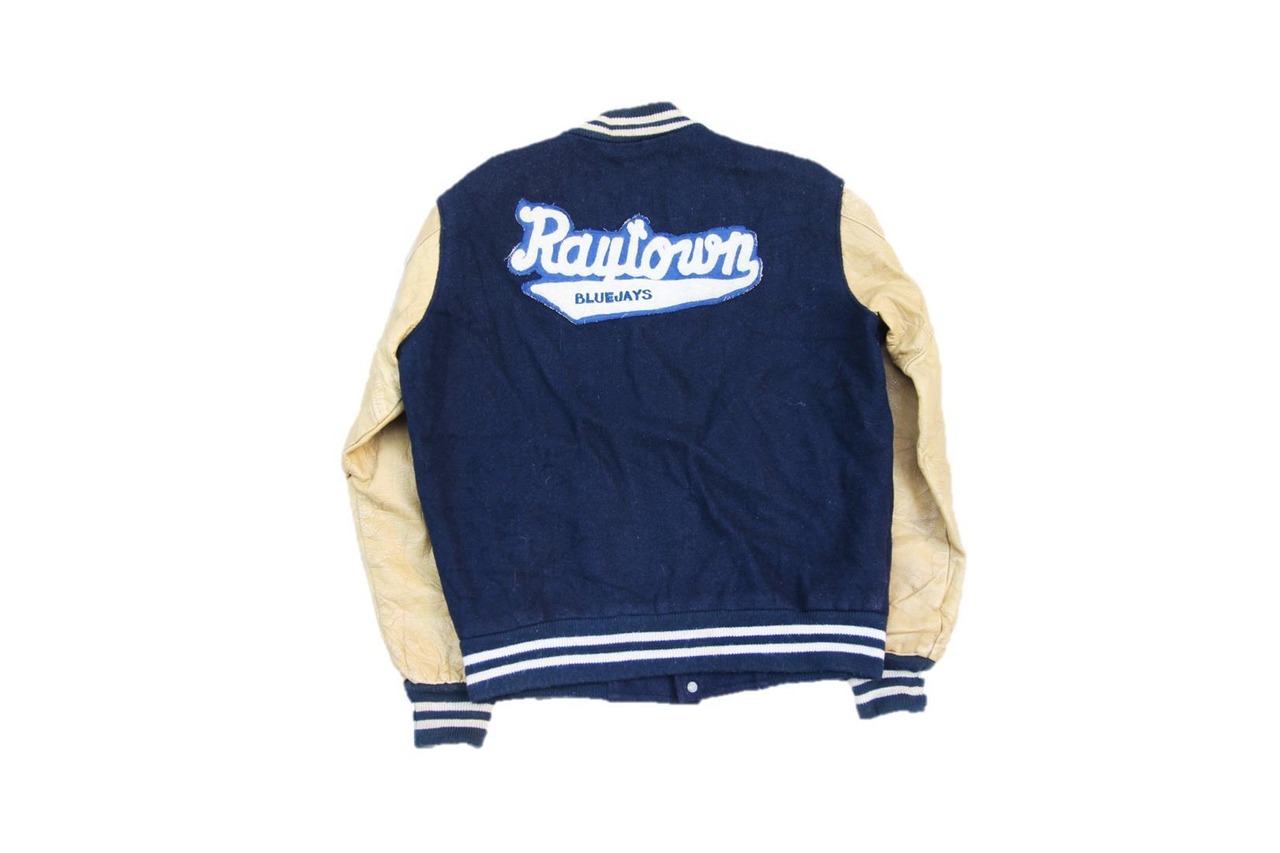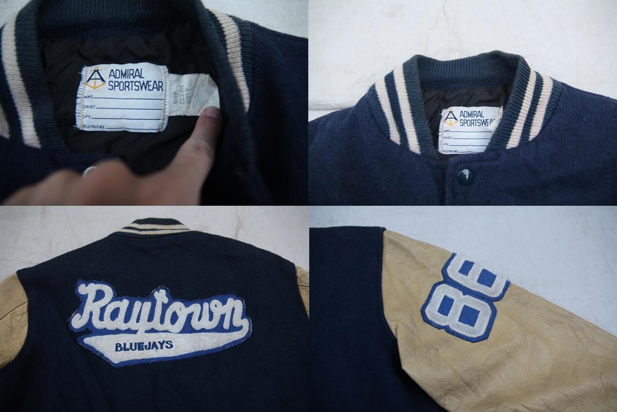 1980年代頃のAdmiral Sportswear製のウールと袖レザー切り替えのスタジアムジャンパーとなります。フロントはスナップボタン仕様、左袖とバックにワッペン付きで袖には恐らく年号の数字ワッペン、バックにはRaytown High SchoolのフットボールチームであるBlue Jaysのワッペンが張られている事からチームグッズもしくは関係者に配られていた物かと思われます。ネイビーベースにレザー切り替えとスタンダードなスタジャンで近年人気高騰の短丈ジャケットですのでお好きな方は是非ご検討下さい。