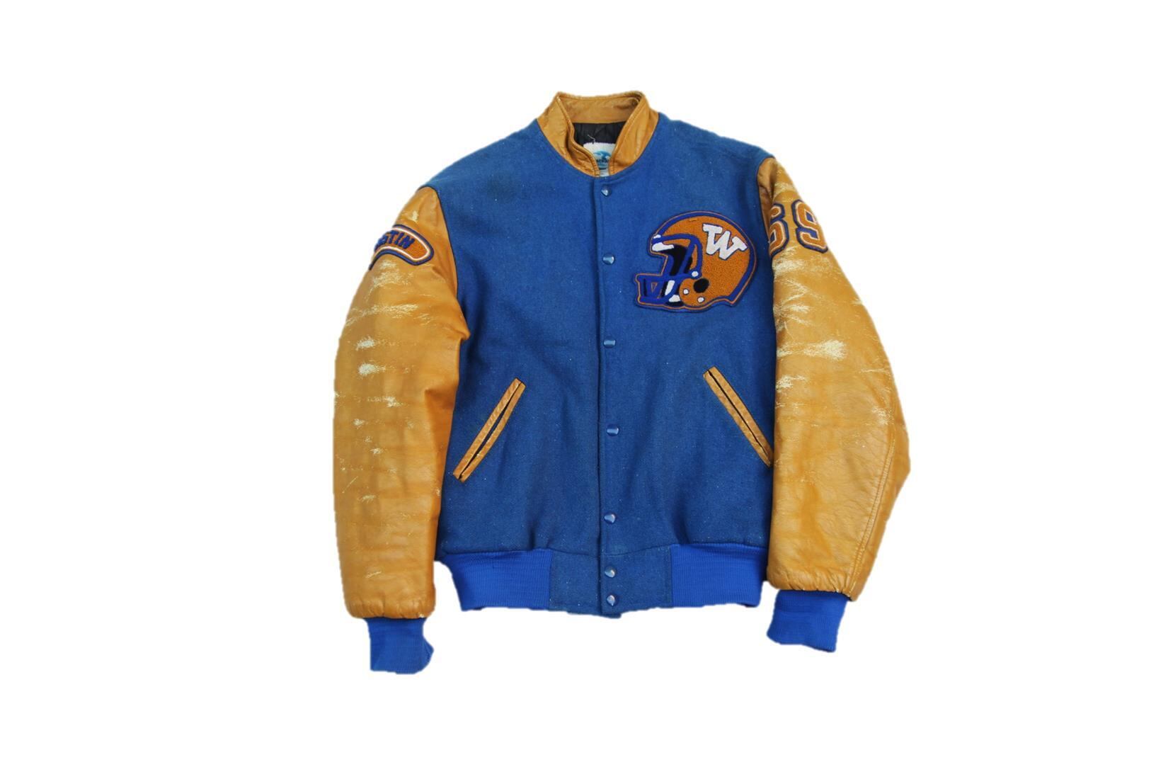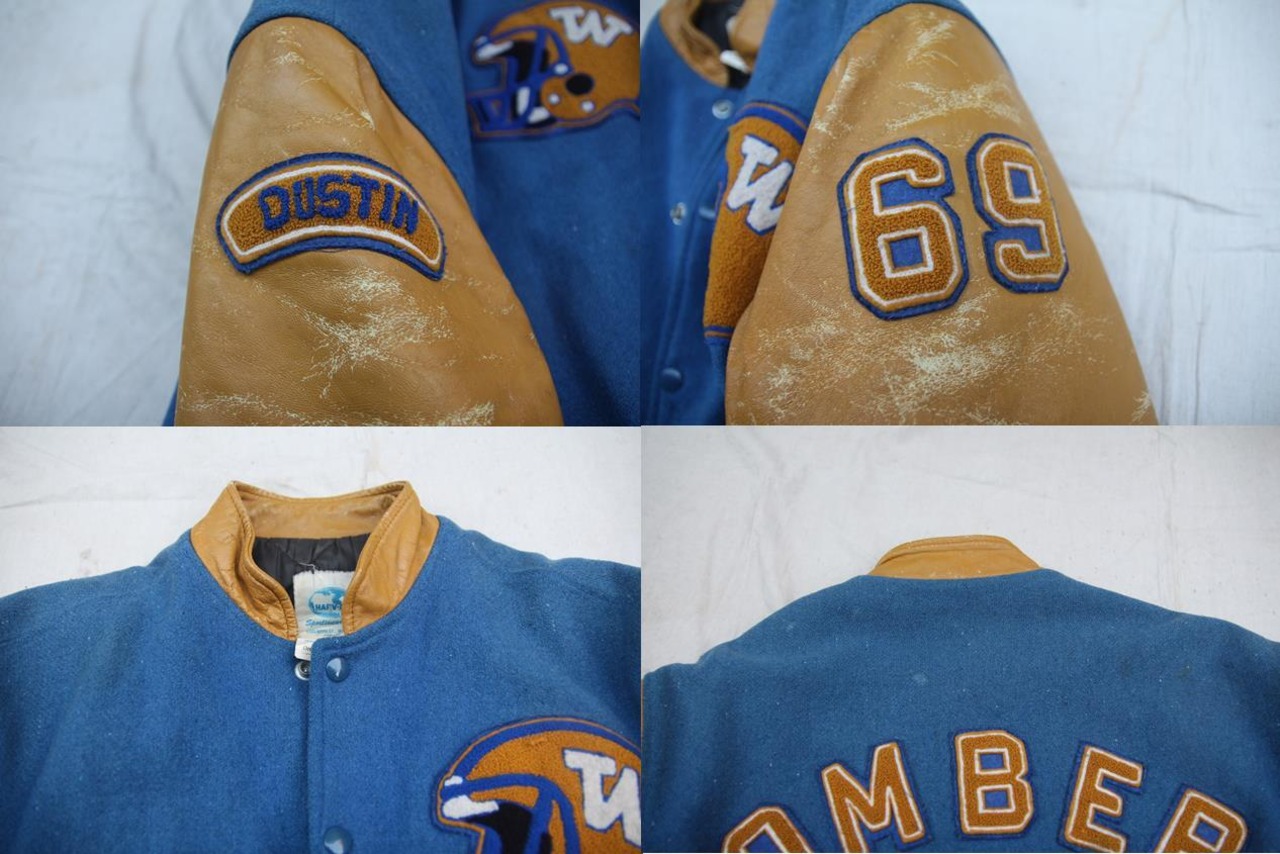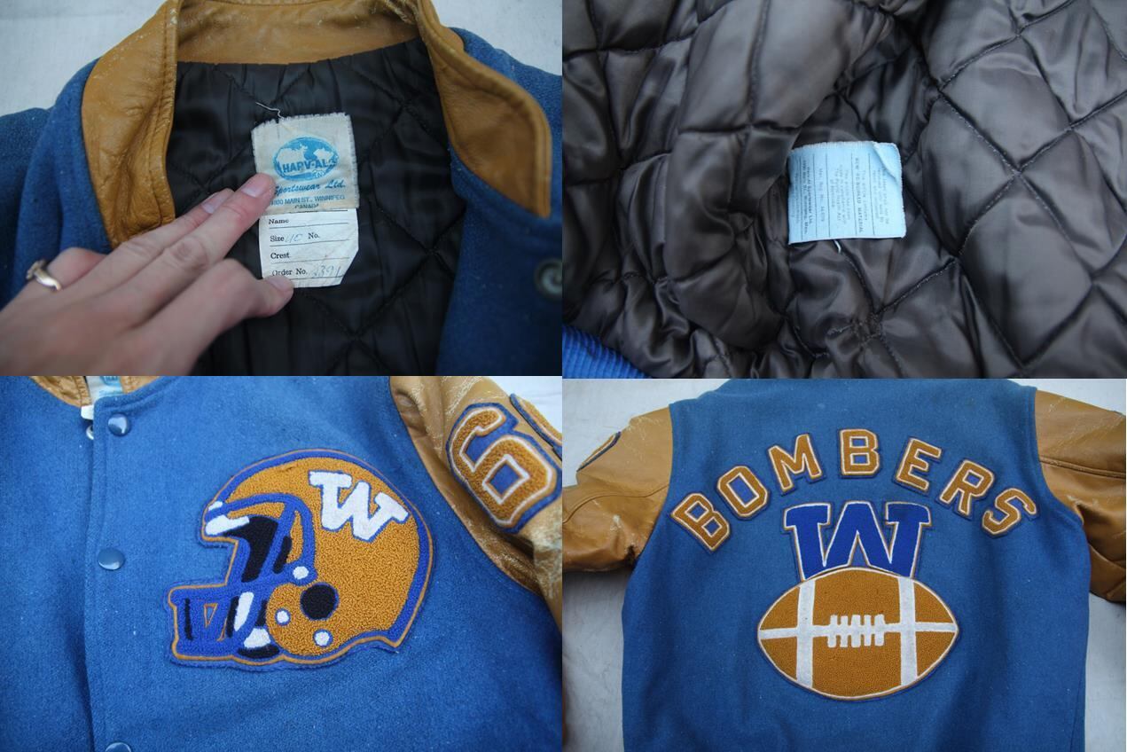 1980年代頃のHerv-AL製のスタジアムジャンパーとなります。フロント胸、バック、両袖と各所に豪華ワッペン付きでワッペンから恐らくCFL所属のアメフトチームWinnipeg Blue Bombersのグッズ販売もしくは何かの記念で作られたジャケットでしょうか。袖、衿、ポケット縁がレザー切り替えとなります。これぞスタジャンと呼べるデザインですのでアメカジスタイルがお好きな方は是非ご検討下さい。