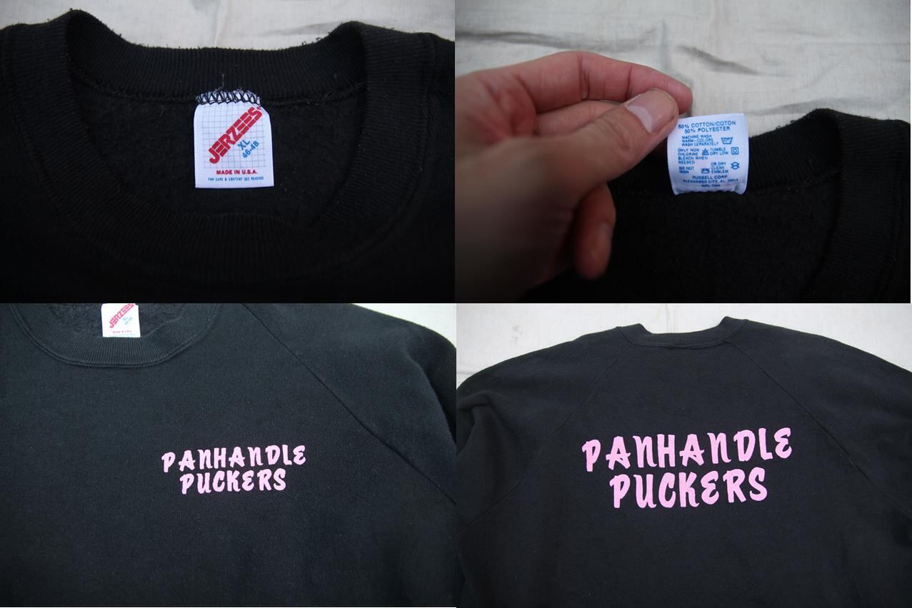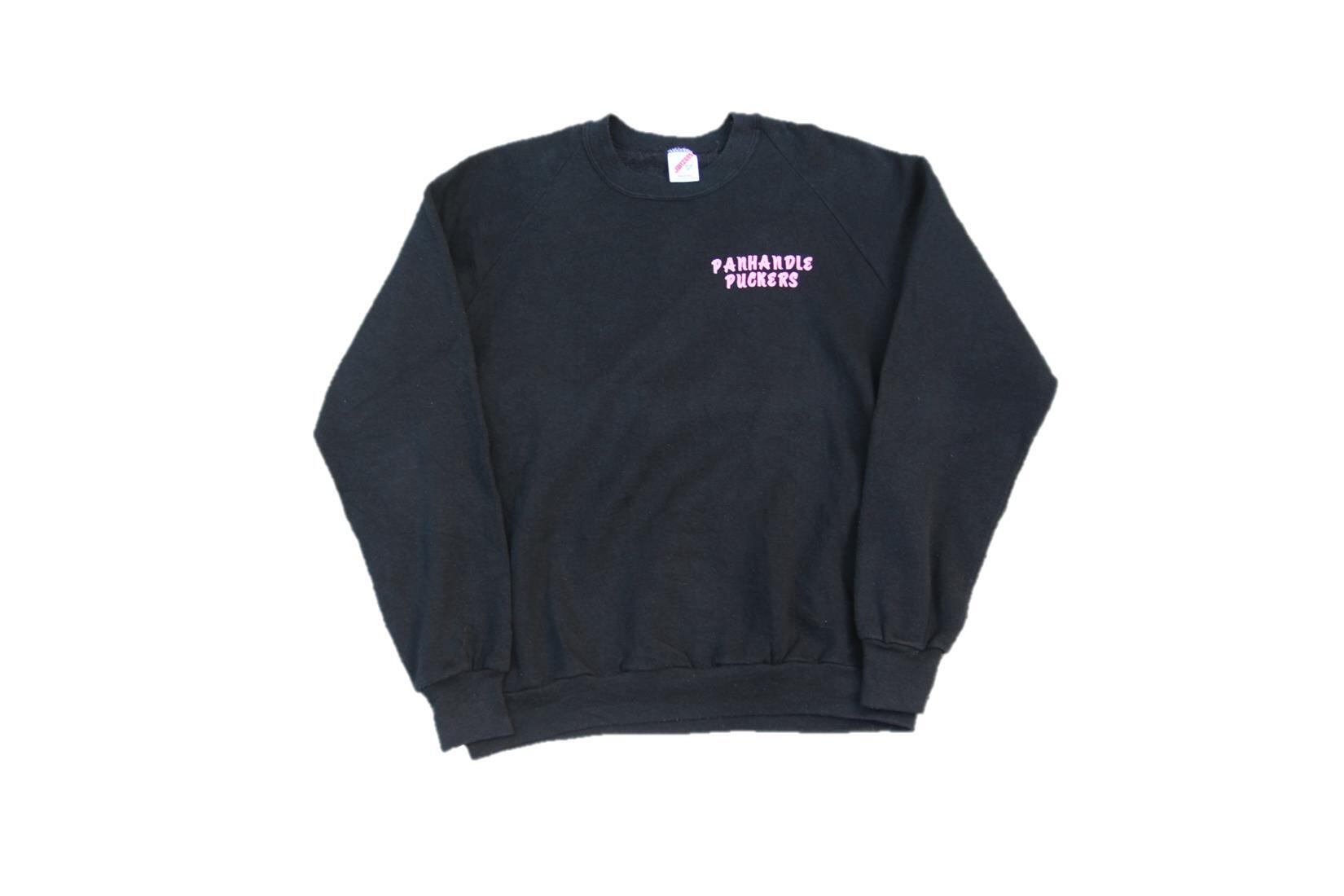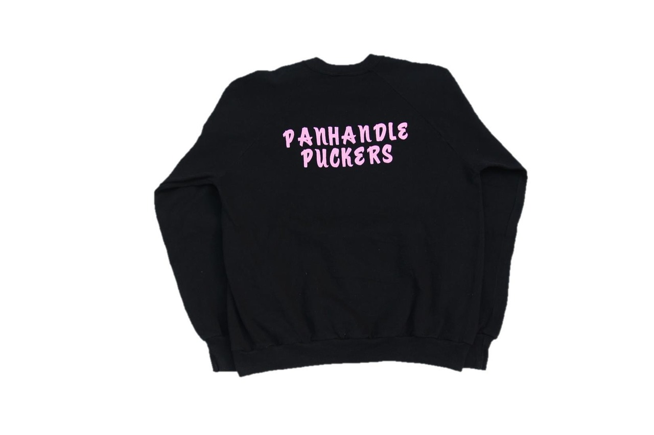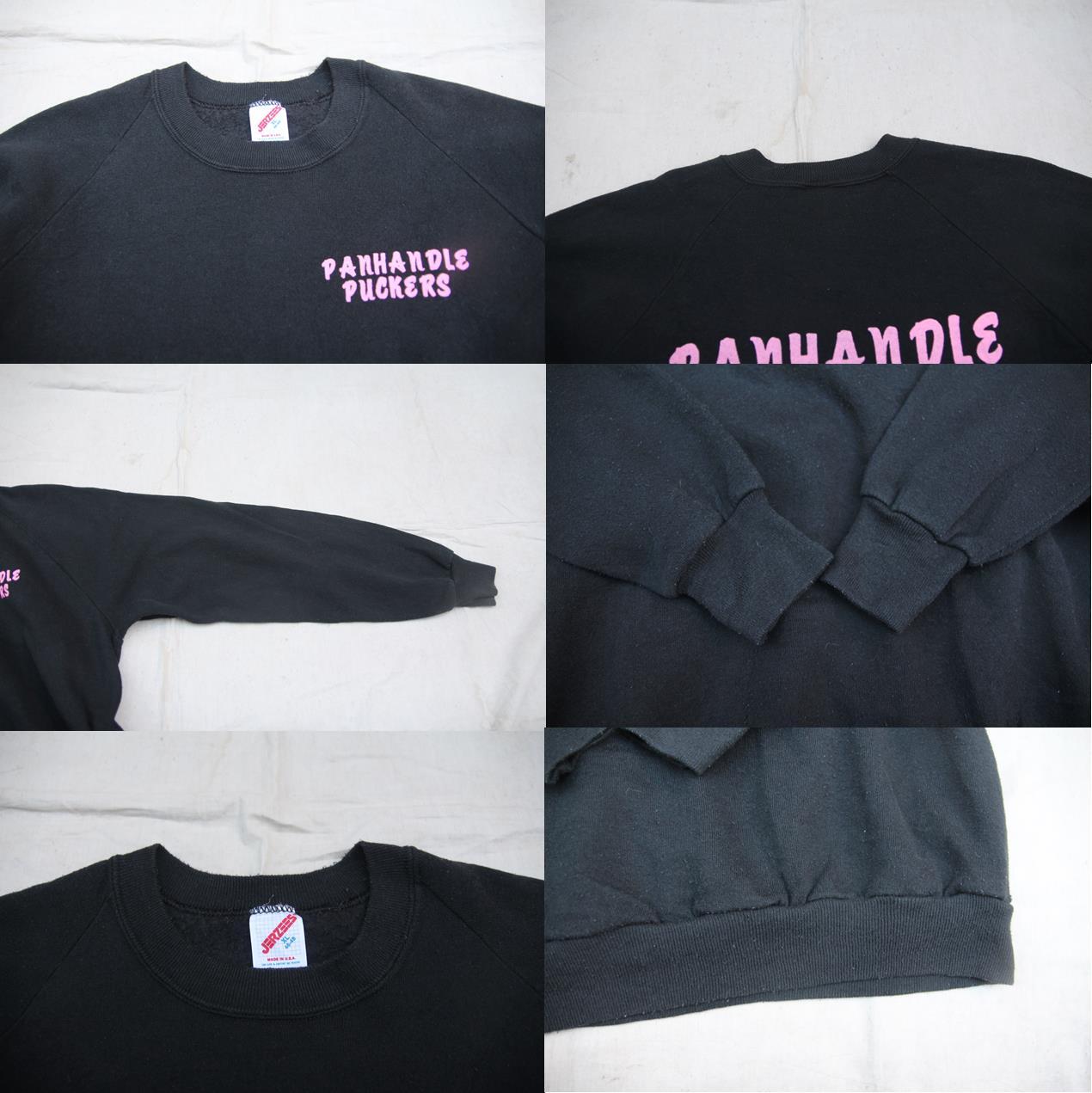 1990年代頃のJerzees製プリントスウェットシャツとなります。黒ベースにフロント左胸、バックにピンクプリントが入り、Panhandle Puckersとプリントが入る事から恐らくスポーツチームやバイカーチーム等何かのチームグッズとして生産されたスウェットでしょうか。プリントのフォトもPOPですし、黒ピンのバランスも大変良いですね。サイズもXLと大き目サイズですのでお好きな方は是非ご検討下さい。