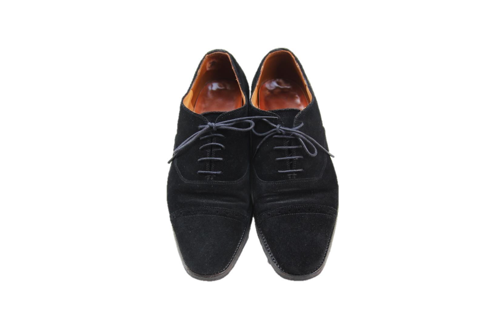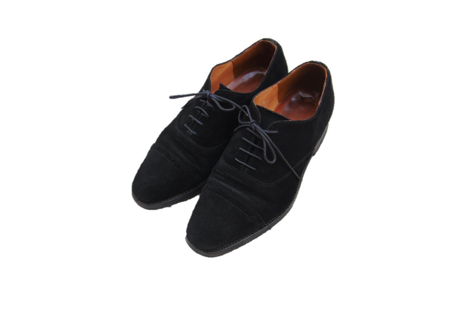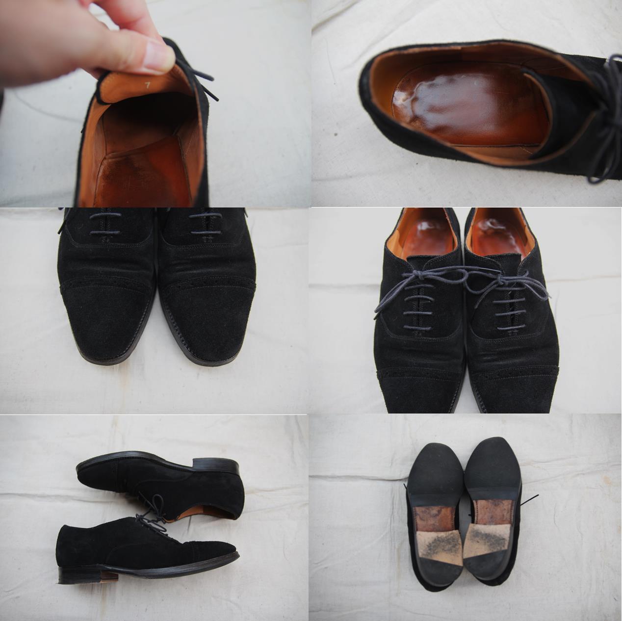 1990年代以降頃のブランド不明スエードレザーカップトゥドレスシューズとなります。ストレートチップとも呼ばれるトゥで黒スエードレザーとなります。ユーロシューズの様なワイズの細さで綺麗なフォルムとなります。アウトソールにはビブラムソールが使用されております。サイズ表記は7ですが、実寸では25.5cmから26cm程度の方なら問題無く履いて頂けるかと思います。人気の黒ベースドレスシューズですのでサイズの合う方は是非ご検討下さい。