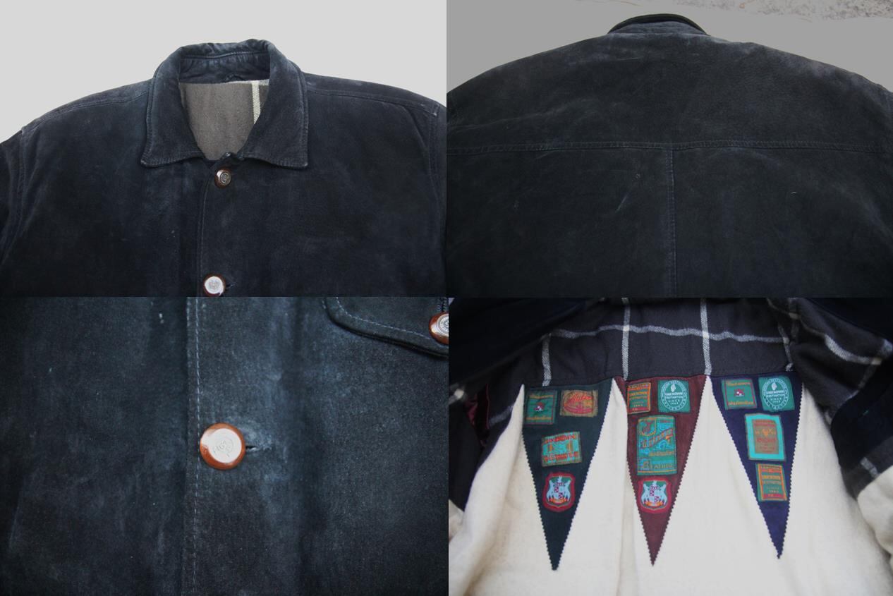 1990年代以降頃のUnknown Distination製のマイクロスエードジャケットとなります。一見スエードレザーに見えるこちらは恐らくマイクロスエード生地となり、左胸と左右ハンドポケット付きフロントは刻印入りのボタン留めとなります。ライナーが大変凝ったデザインで各ワッペンの様なタグが多数付き、上部チェック柄に下部ボアの切り替えデザインとなり裏ポケットも付きます。フォルムも丸めでPOPながらもお洒落なシルエットですのでサイズの合う方は是非ご検討下さい。
