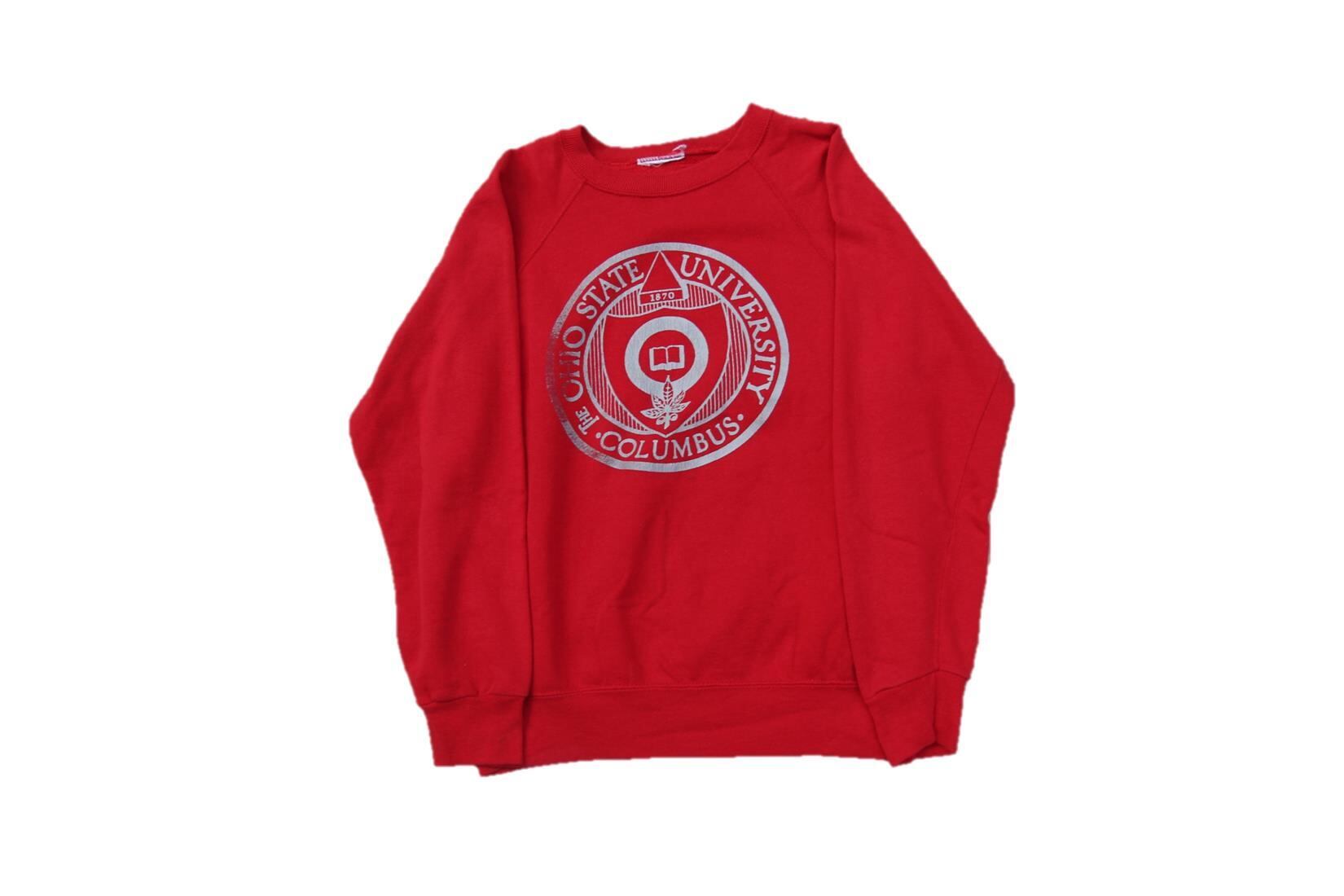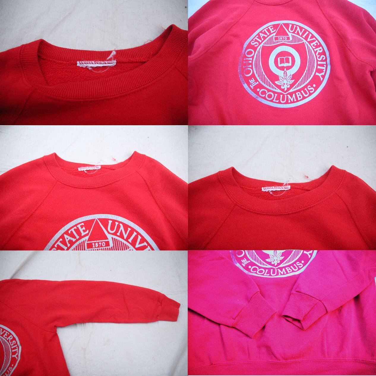 1990年代頃のブランド不明プリントスウェットシャツです。プリントはフロントのみでオハイオ州のコロンバスにキャンバスを構えるアメリカ最大規模の州立大学でもあるオハイオ州立大学のプリントで恐らく大学内で使われていたもしくは販売されていたスウェットかと思われます。スタンダードなカレッジプリントで使い易いですし、サイズも表記は見当たりませんが実寸ではM程度の多少大き目サイズとなります。発色の良い赤ですので気になる方は是非ご検討下さい。