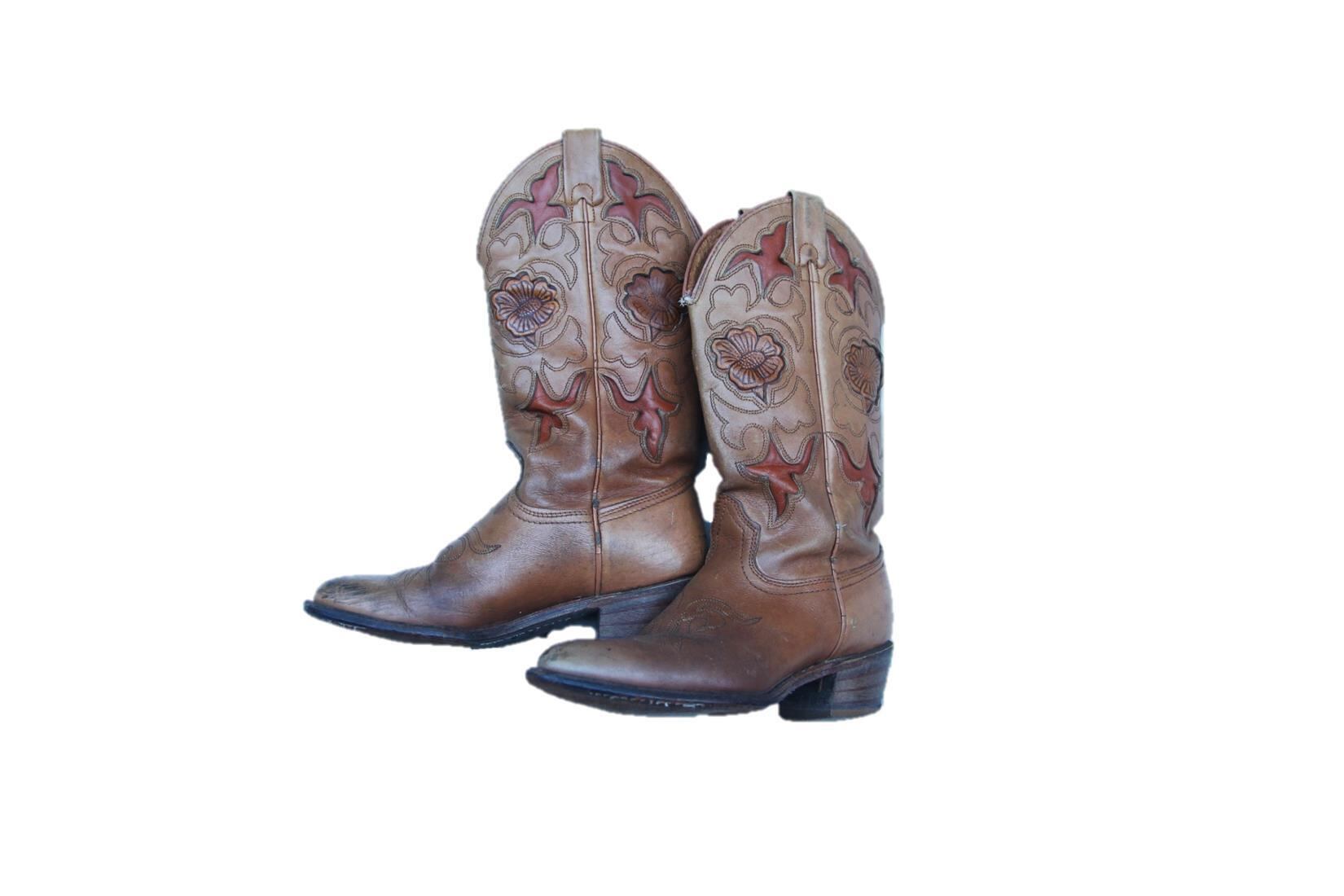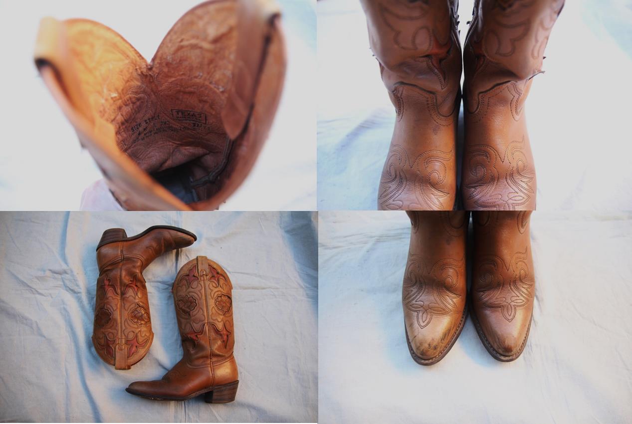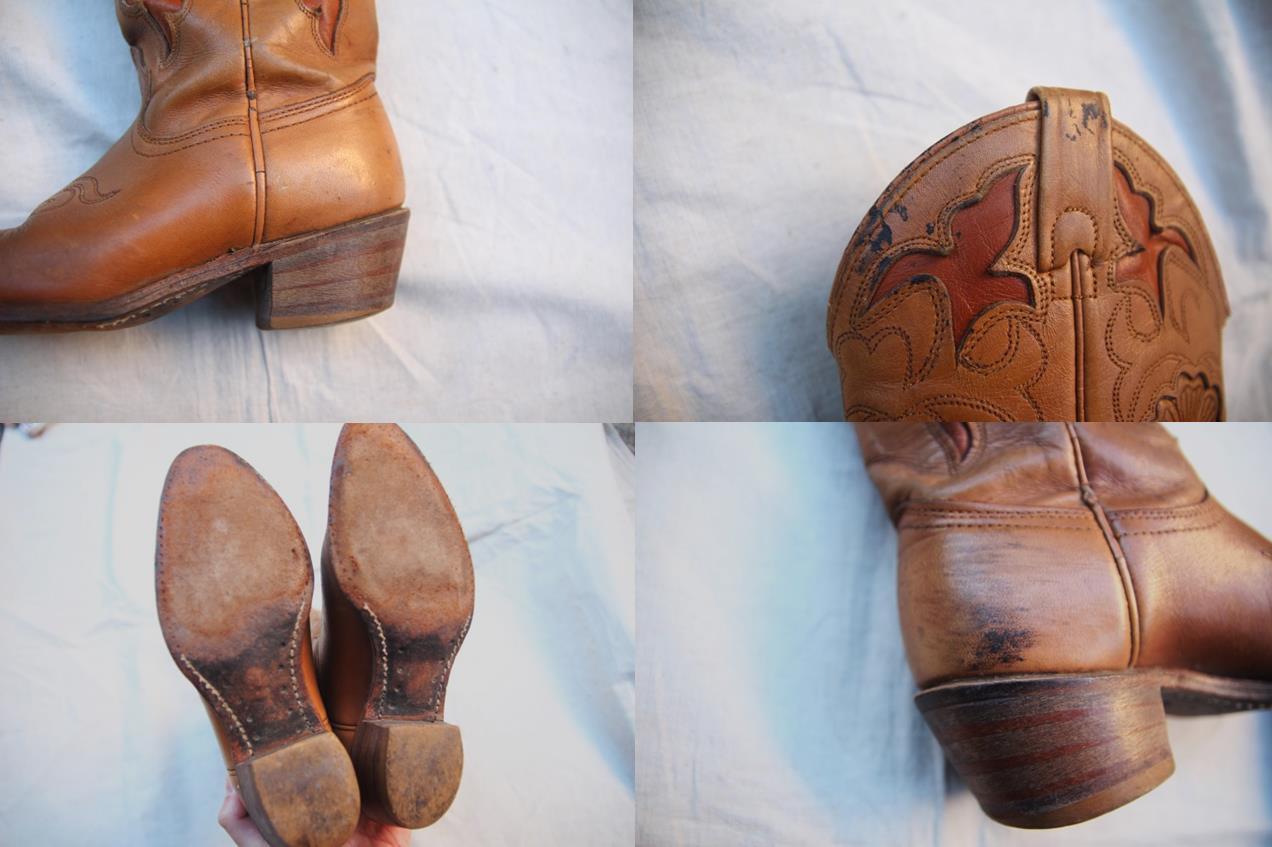 1970年代以降頃のブランド不明ウエスタンブーツです。全体的に型抜き、刺繍が入る豪華なデザインで内側にプリント表記入りでTexas、USA製とサイズ表記6がプリントされております。サイズ的には23.5cmから24cm程度なので女性の方でサイズの合う方にお勧めです。スカートでもパンツでも可愛く使用頂けるブーツですのでオールドウエスタンブーツをお探しの方は是非ご検討下さい。