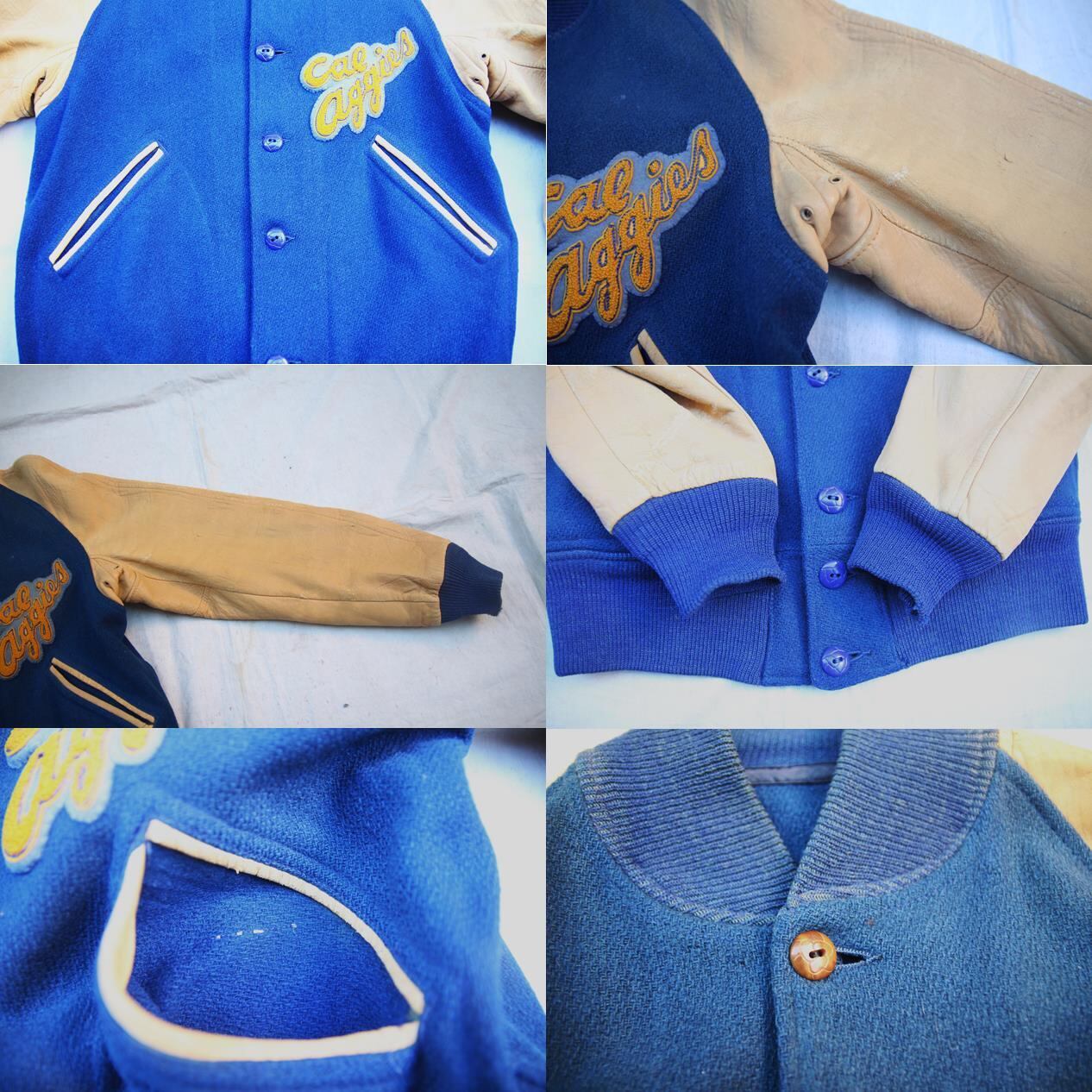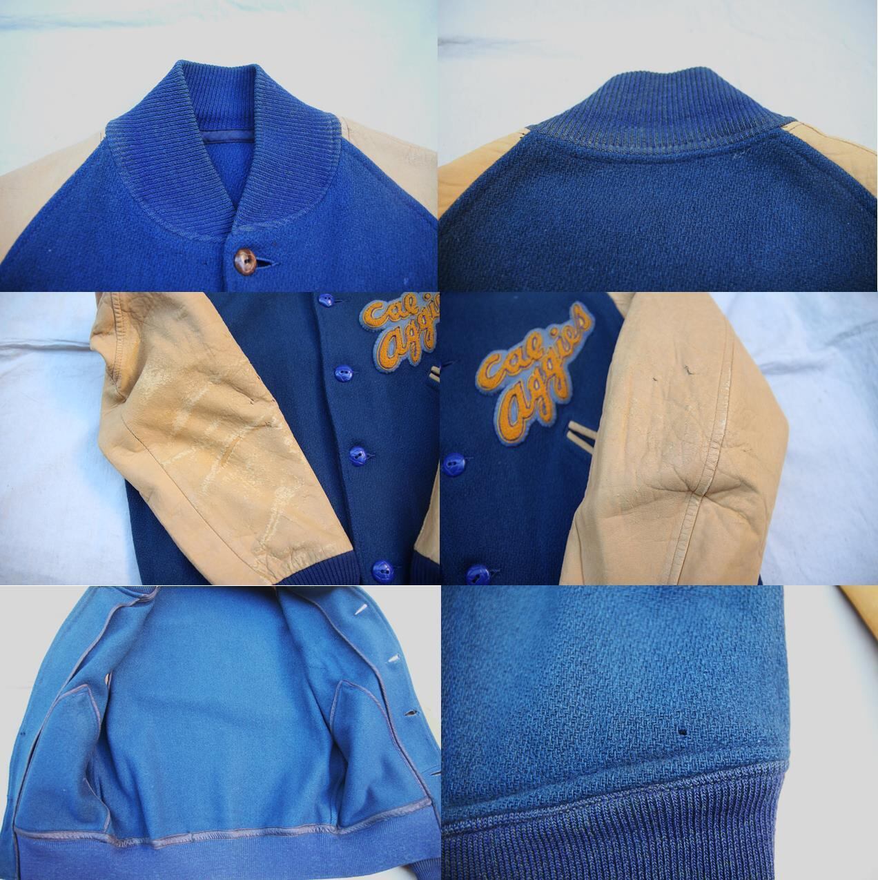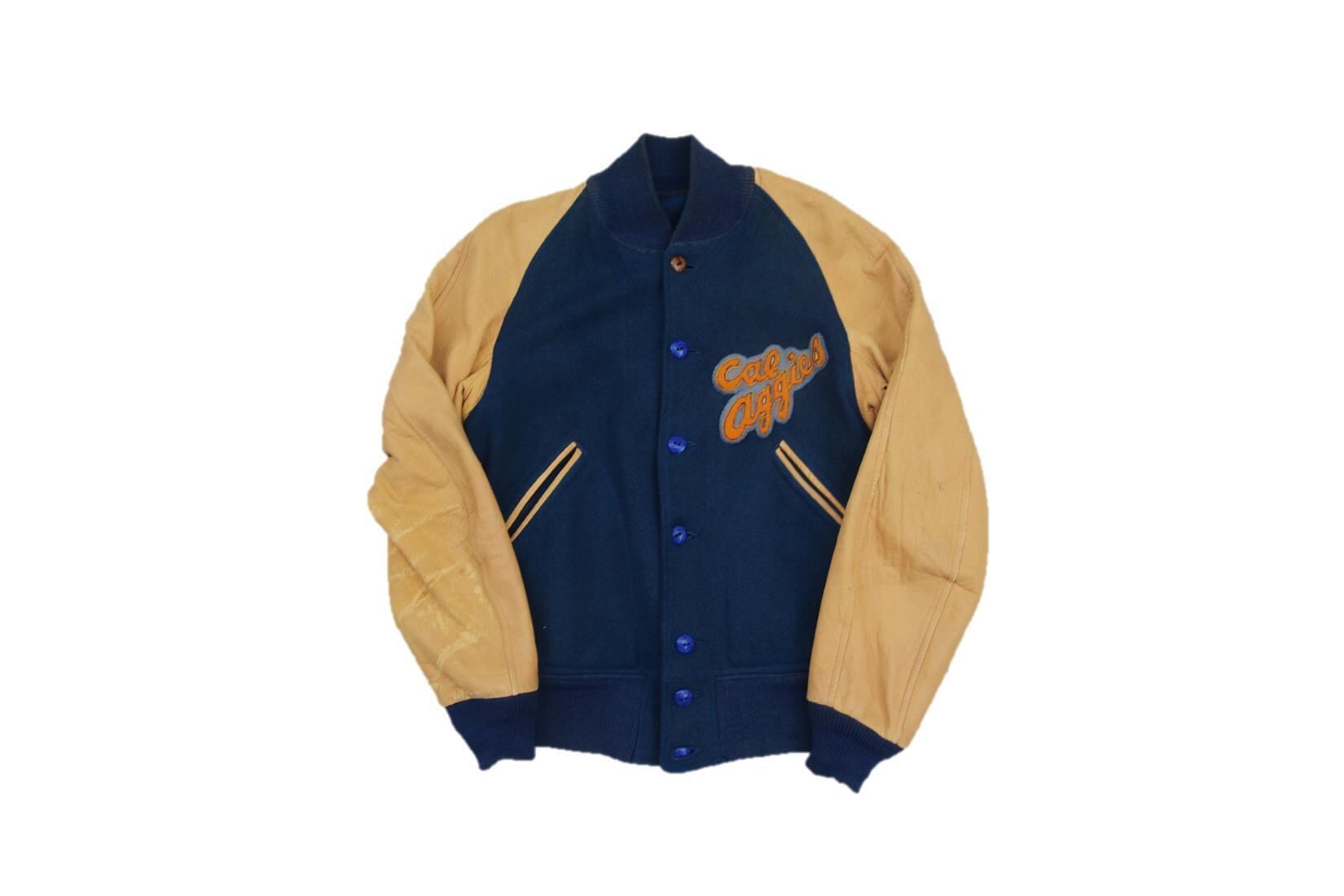 1940年代頃のブランド不明ボタンスタジアムジャンパーとなります。50年代以前頃に見られるボタンスナップボタンでは無く、ホール留めとなる通称ボタスタでヴィンテージスタジャンらしいシェル、リブのウール質感で袖もディアスキンが使われている為、柔らかく着心地抜群となります。胸部分にワッペンが付き恐らくカリフォルニア大学デイビス校のフットボールチーム物の可能性が高いかと思われます。サイズも実寸36程度と多少タイト目なサイズ感で人気の短丈ジャケットですので配色も良いヴィンテージボタスタをお探しの方は是非ご検討下さい。