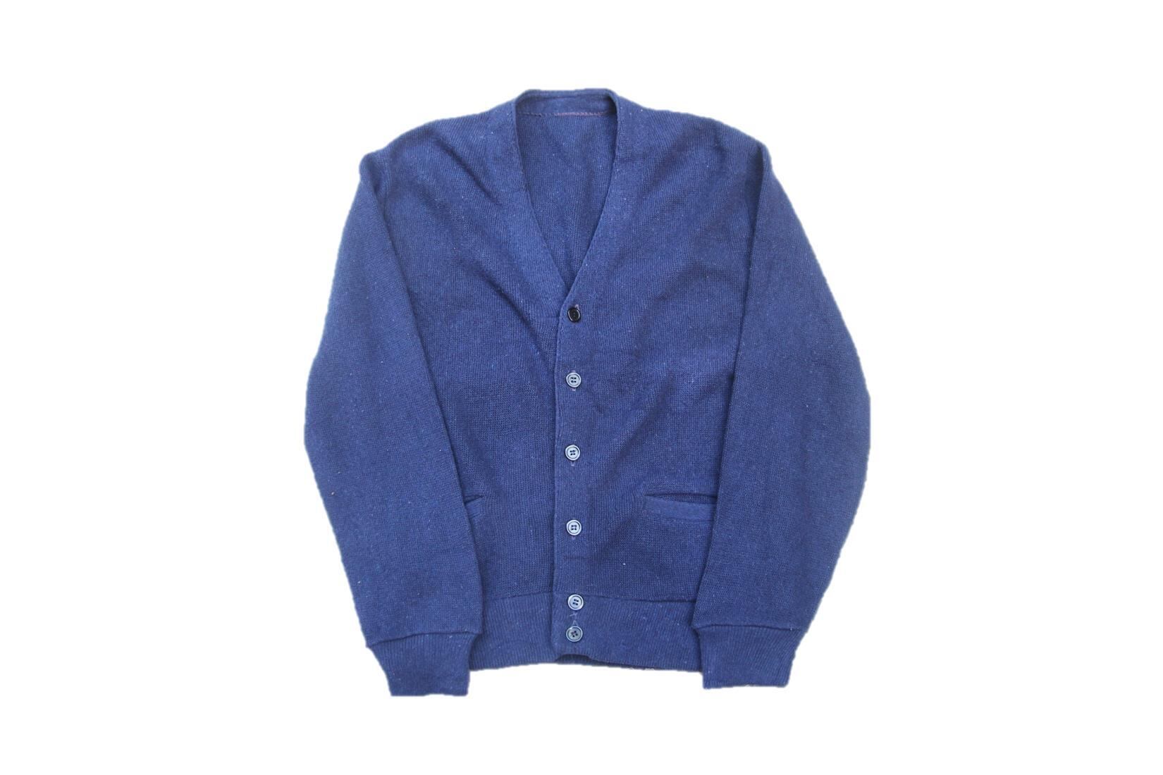 1980年代から90年代頃のブランド不明アクリルカーディガンです。嬉しいポケット付きでお色も使い易いネイビーとなります。シンプルなデザインと形でインナーにシャツTシャツ等合わせる幅も広いアイテムですのでサイズの合う方は是非ご検討下さい。