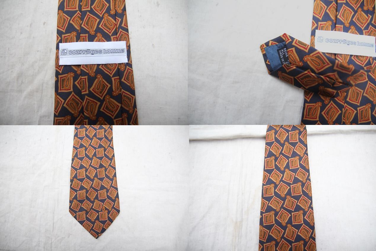 Courrcgcs Homme製のシルクネクタイとなります。ペイズリーとスクエアが重なった様なお洒落な柄で幅も太過ぎず細すぎずの適度な幅感となります。オールシルク素材なので高級感のある光沢です。古着ならではの1点物度の高いネクタイを是非ご検討下さい。