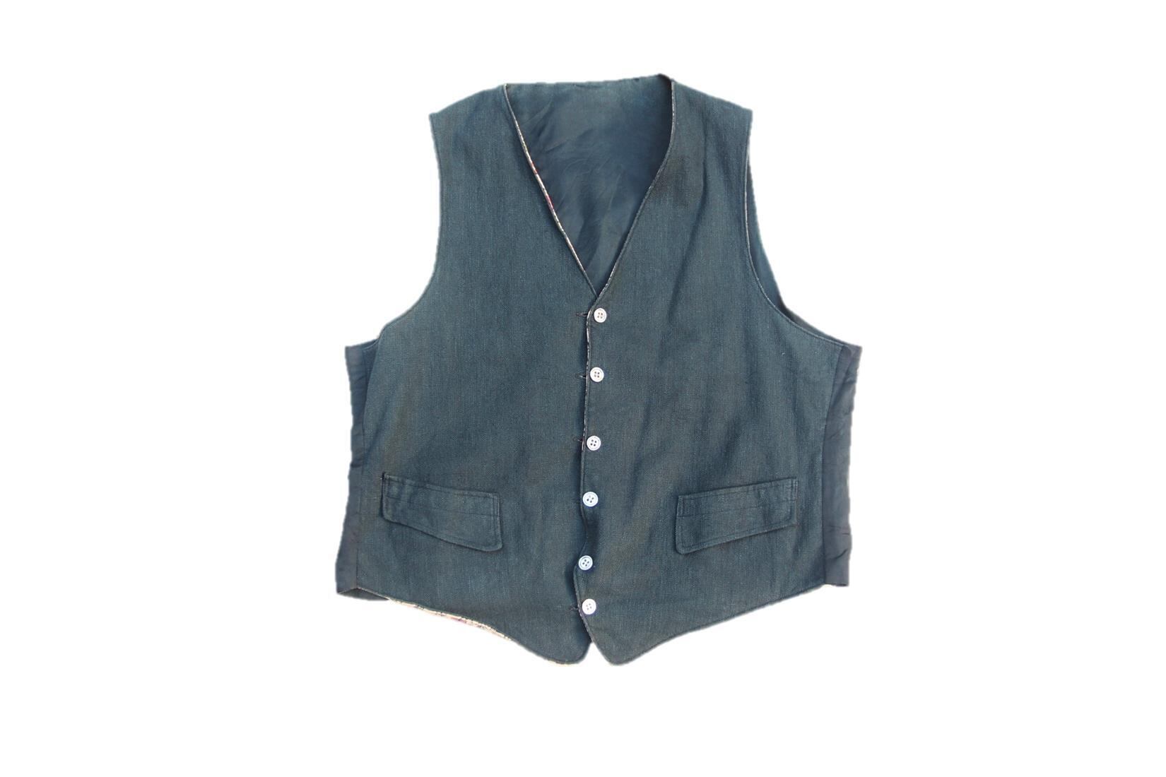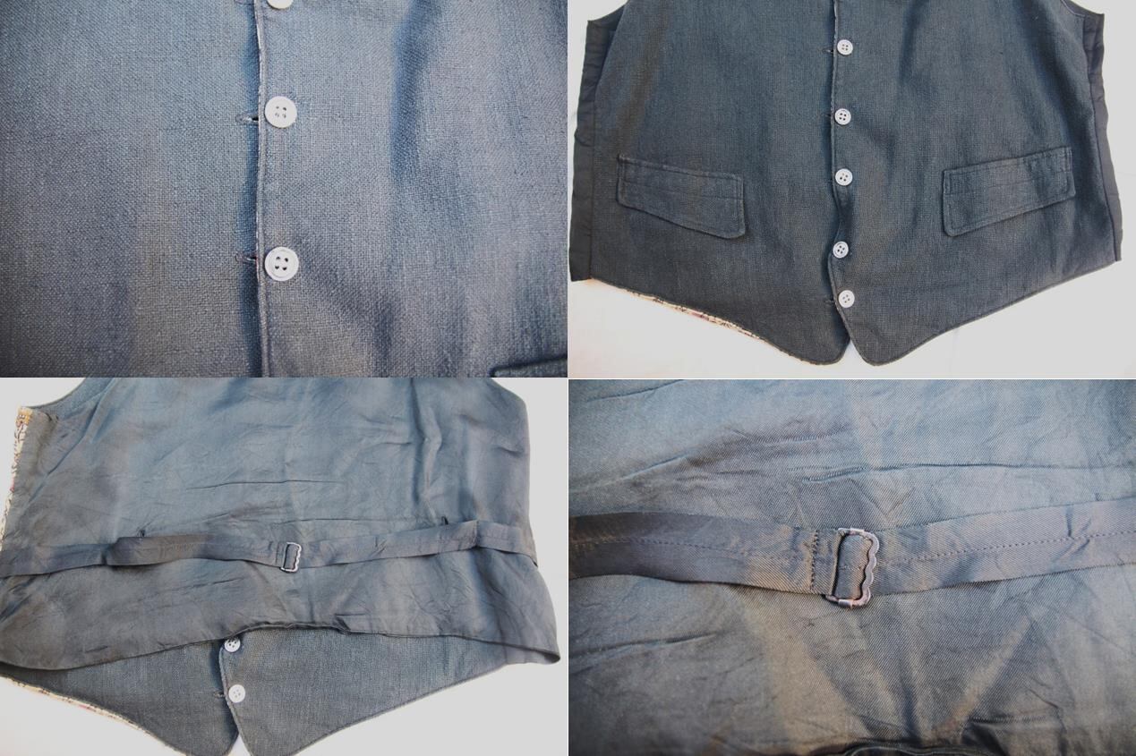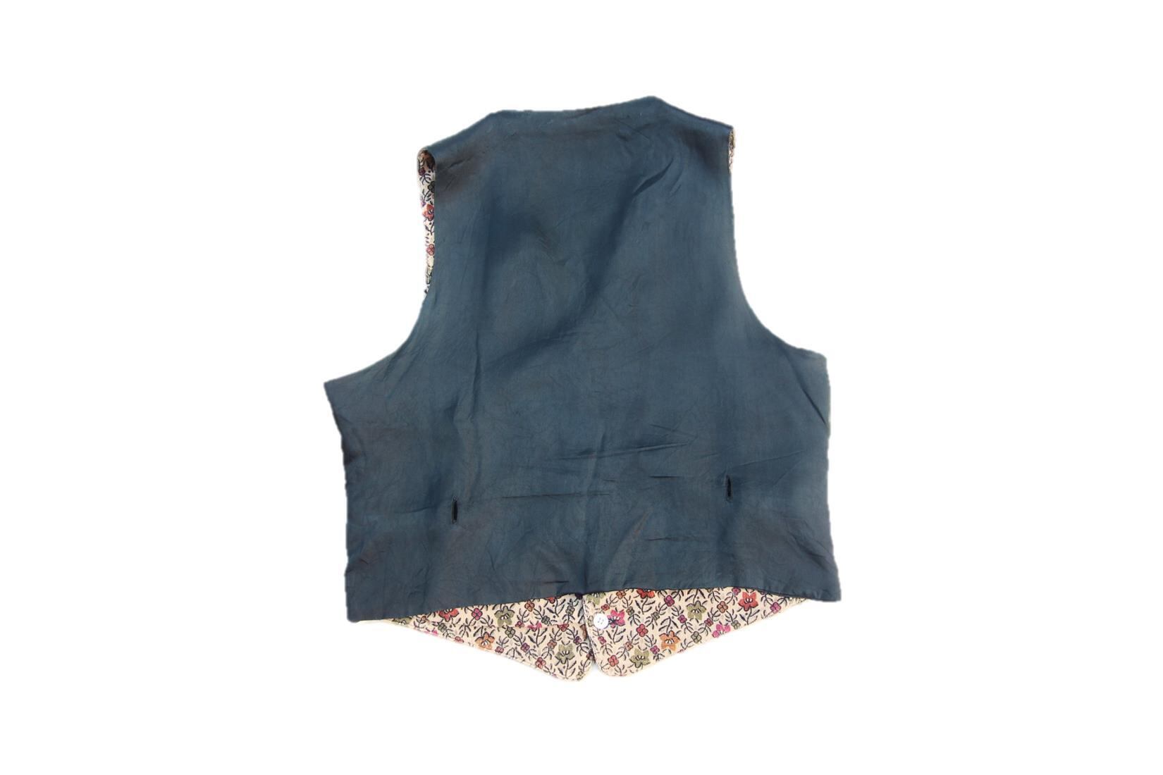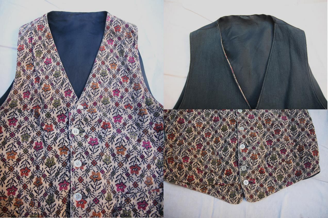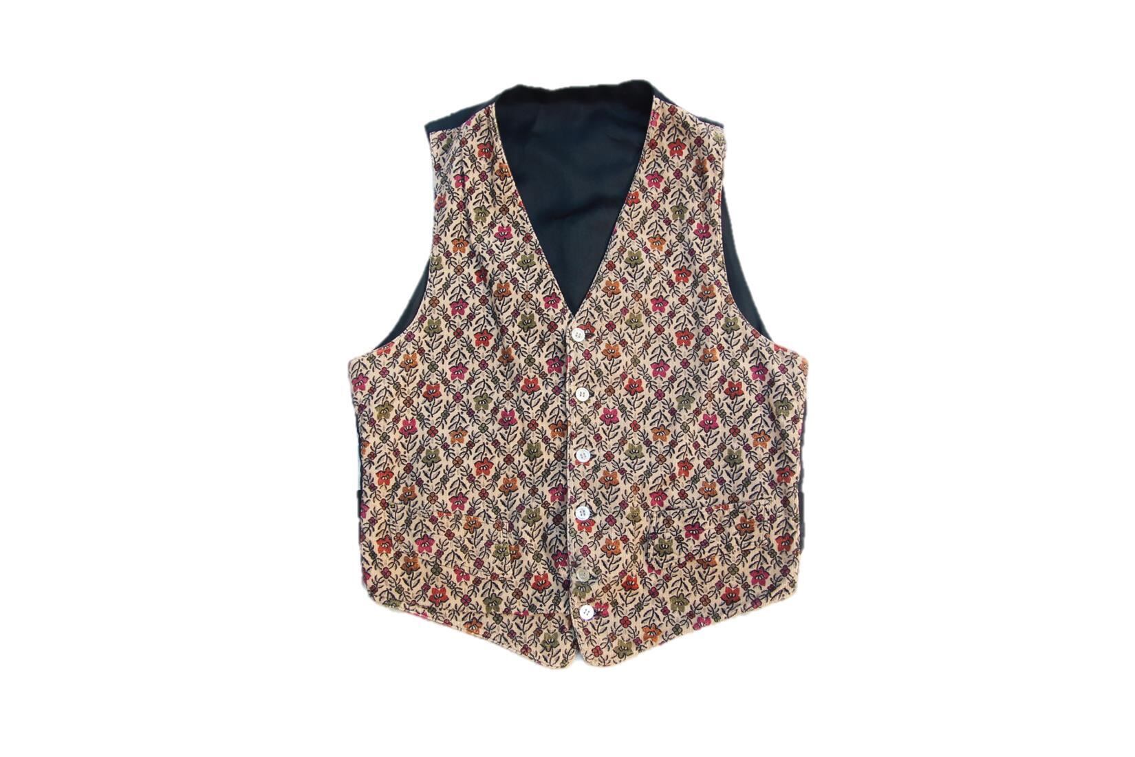 1980年代以降頃のリバーシブル仕様ベストとなります。表面がコーデュロイ地の花柄、裏面がリネンの様な凹凸感のあるコットン地で人気の黒ベースとなります。両面共に嬉しいポケット付きで表面バックにシンチバックも付きます。どちらの面で着用されても様になる嬉しいデザインですし、サイズもMの大き目程度とベストとしては着易いサイズ感かと思います。春先等のレイヤードとしても活躍するベストですので気になる方は是非ご検討下さい。