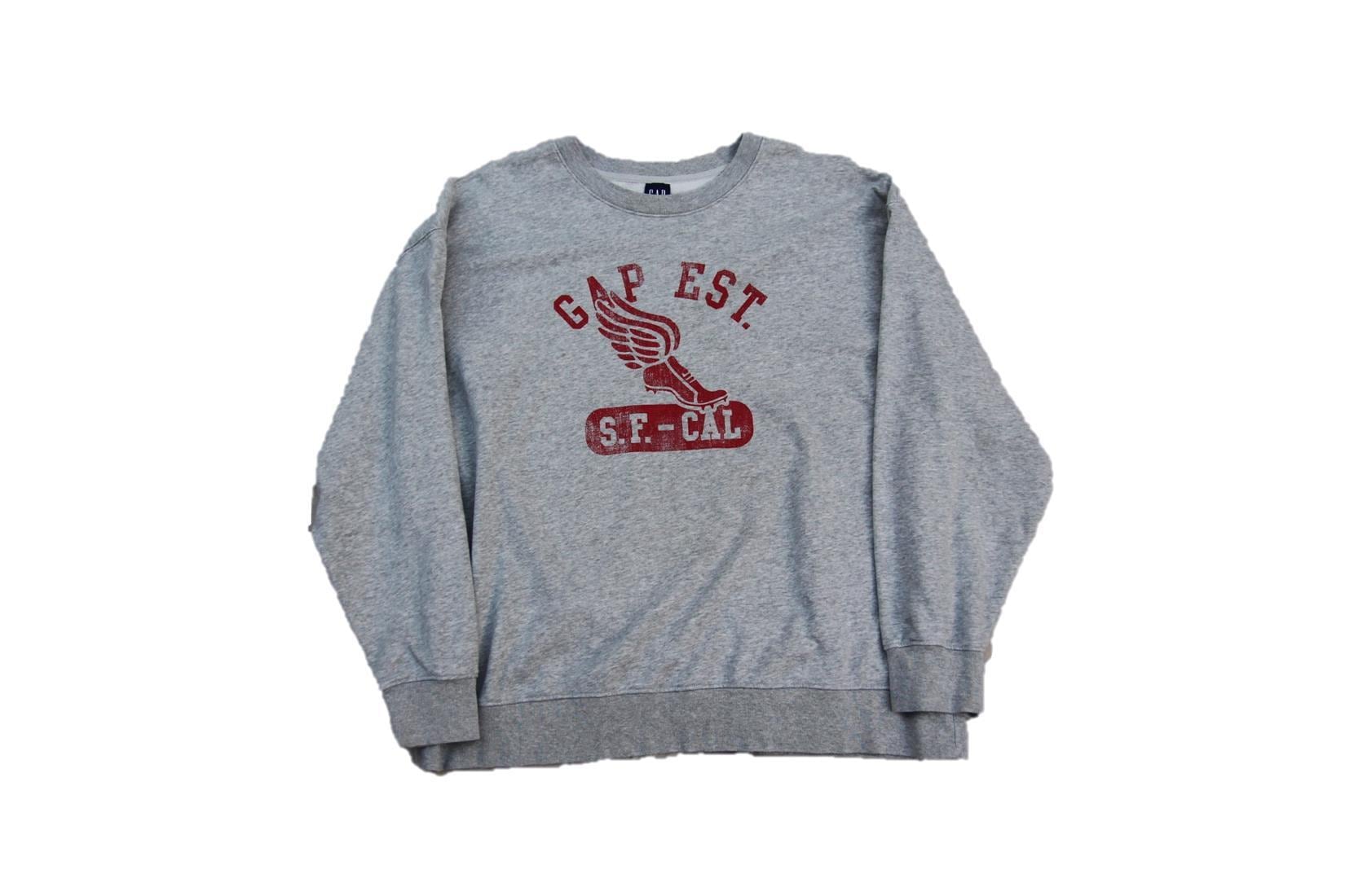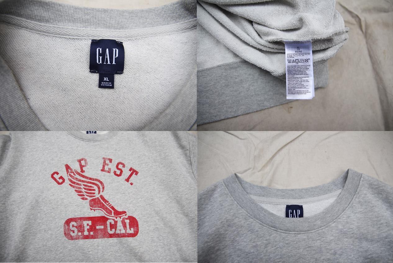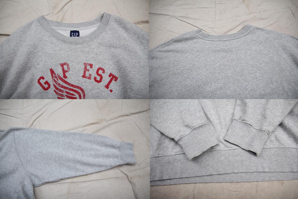 Gap製のプリントスウェットシャツとなります。杢グレーベースにカレッジ風のプリントが入ります。袖、裾リブ共に伸びてスウェット特有の締め付け感が感じられず着易いシルエットとなります。サイズもXLと大き目サイズですのでサイズの合う方、オーバーサイズがお好きな方は是非ご検討下さい。