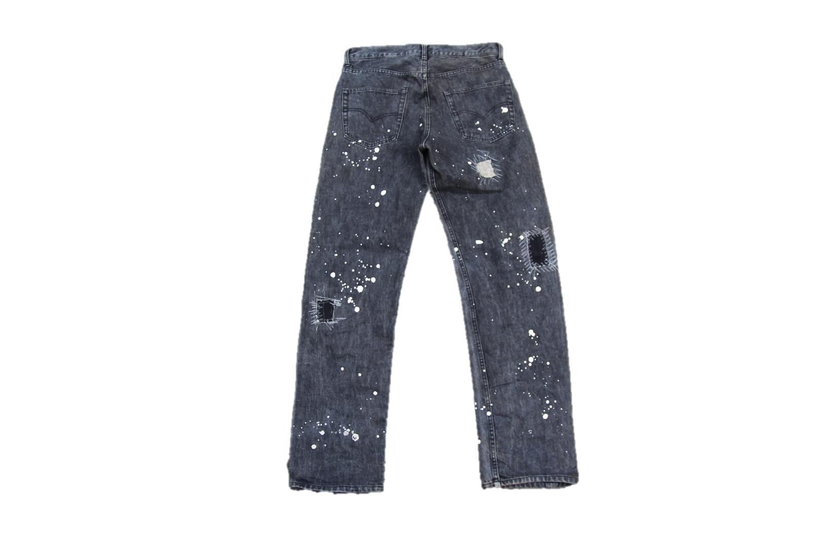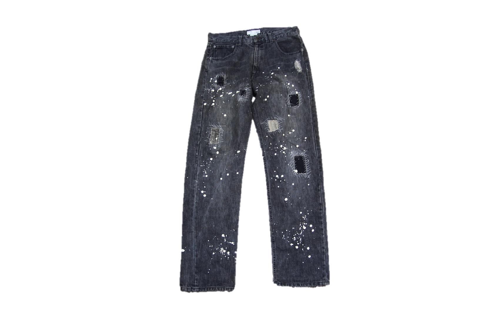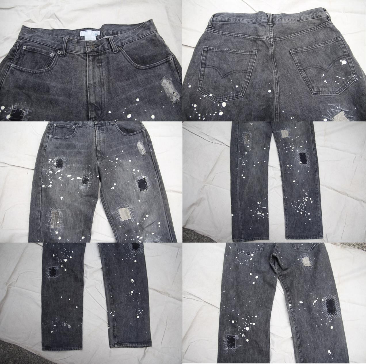 TTU製のダメージ加工ブラックデニムパンツです。全体的にペンキ飛び、リペアデザインが施されたダメージ加工でこれも良いデザインとして好んで穿かれている方も多いかと思います。こちらも全体にバランス良くペンキ飛び、リペアが施されておりますのでデザインとして大変格好良い加工かと思います。綺麗なテーパードストレートでウエストも32インチと大変良いサイズ感ですのでこの手の加工物がお好きな方は是非ご検討下さい。