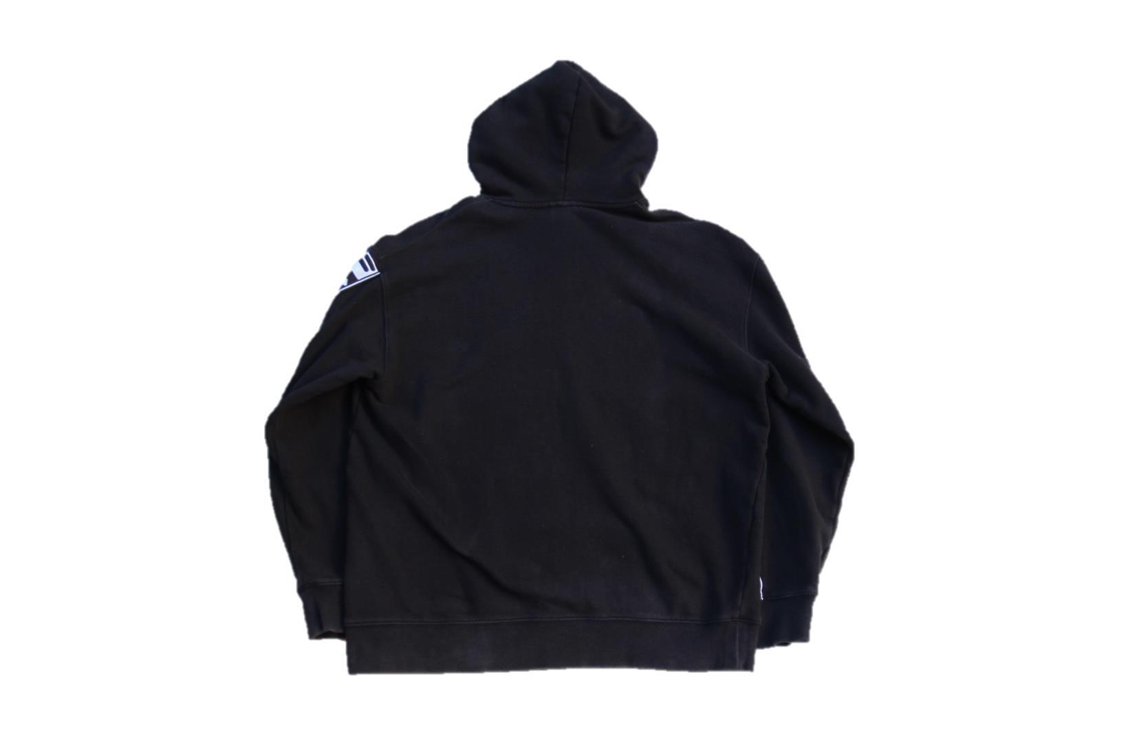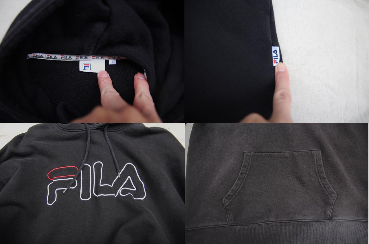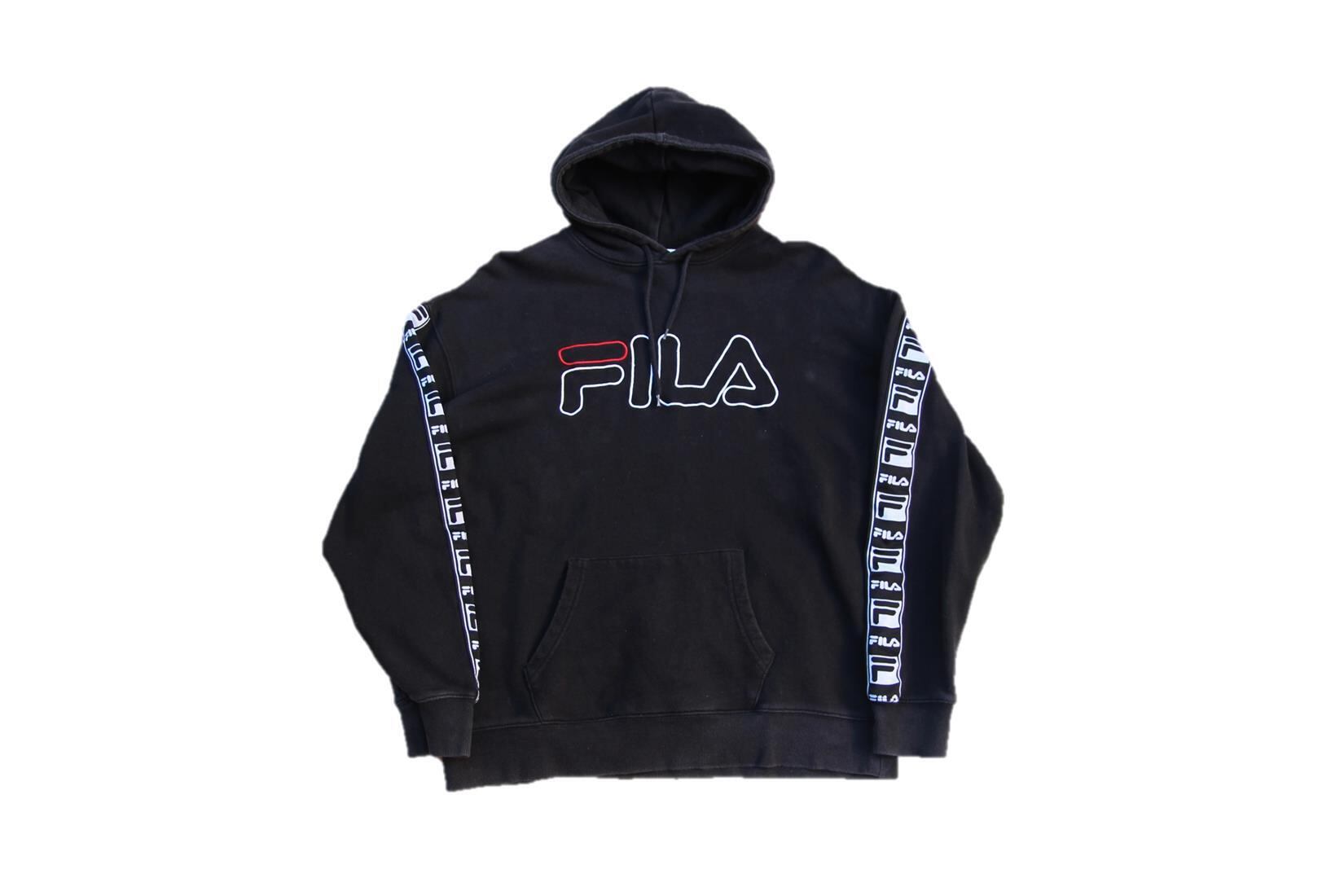 2000年以降のFila製スウェットパーカーです。フロントにはブランド刺繍、両袖にFマークとブランド名が交互に入るテープライン付きとなります。スポーツウェアらしいデザインでお色も黒でサイズもLとお使いやすいカラー、サイズですので是非ご検討下さい。