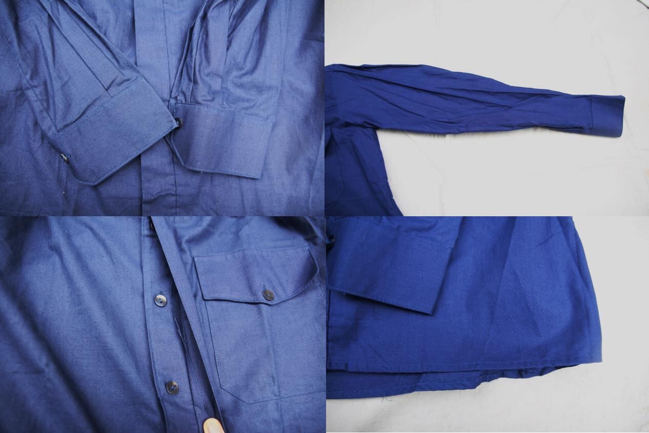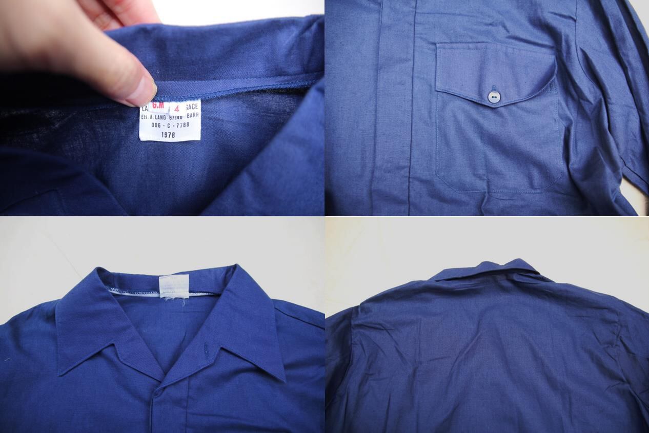 1978年官給のフランス軍ユーティリティーシャツとなります。恐らくフランス空軍使用のシャツとなり、濃いめのブルーカラーで素材はコットンポプリンの様なさらっとした着心地の良い素材です。衿の独特な形状や胸ポケットフラップの形、比翼仕様の前立て部分等シンプルな単色シャツかつ高級感や細かい拘りディテール等洋服好きの方の心擽るシャツかと思います。サイズも4表記で大き目なサイズ感ですので大人っぽいシンプルなシャツでオールド物をお探しの方は是非ご検討下さい。