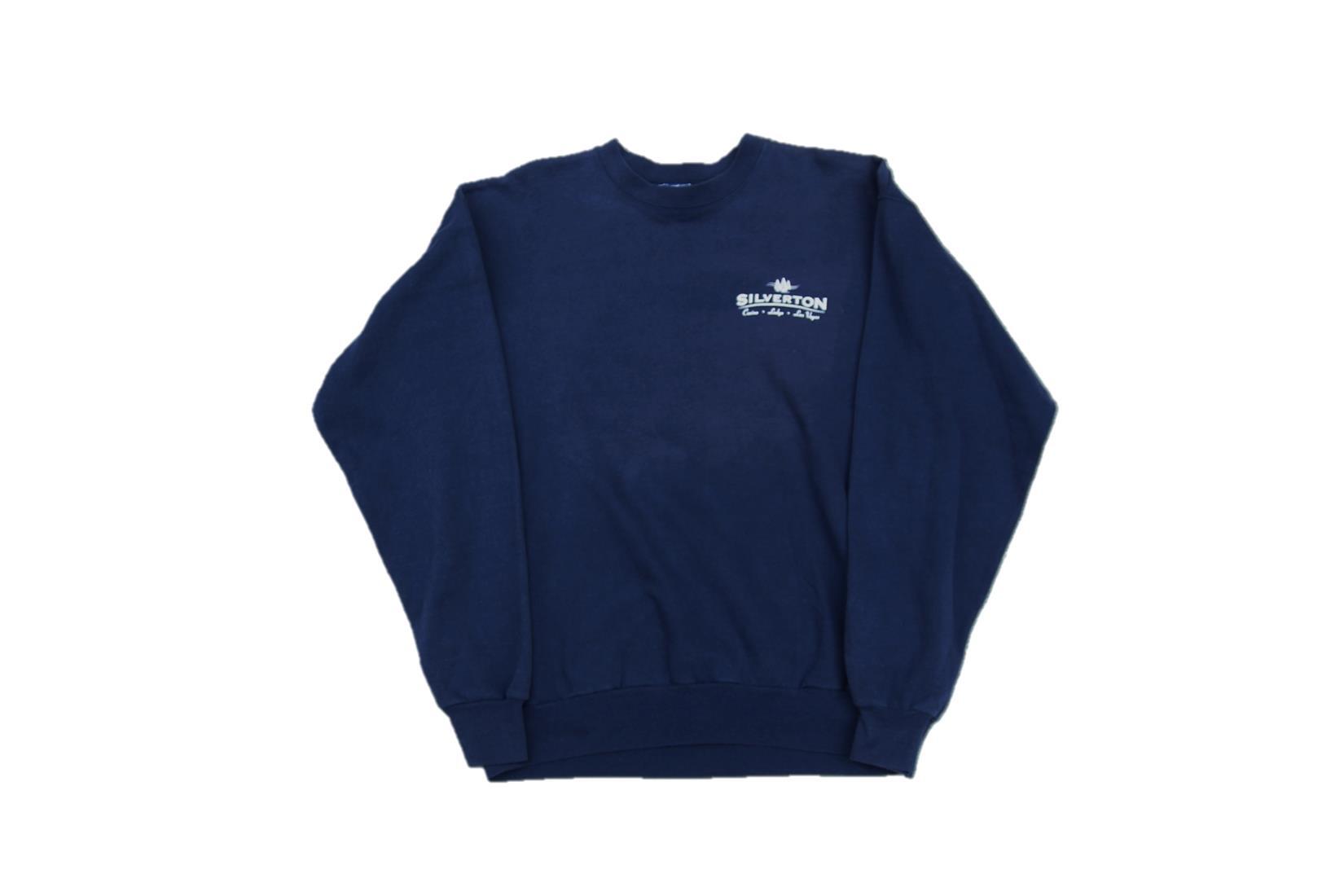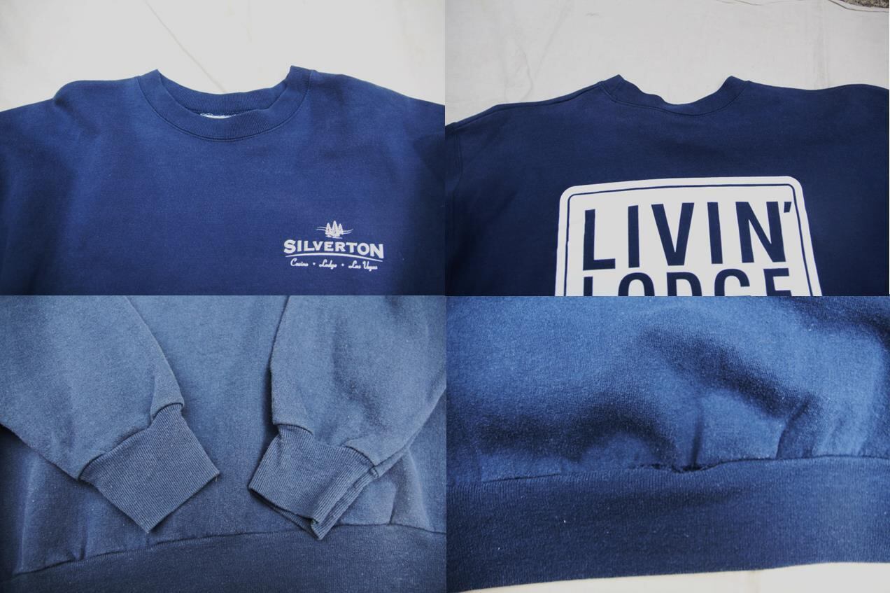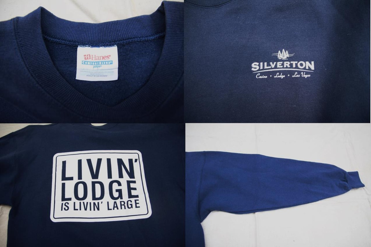 2000年以降頃のヘインズ製プリントスウェットシャツとなります。フロント左胸、バックプリント入りでプリントからアメリカラスベガスにあるカジノリゾートホテルのSilvertonのプリントが入る事からホテルのオリジナルグッズとして生産された物でしょうか。ネイビーボディにホワイトプリントでバックのボックスプリントもPOPで大変良いデザインです。サイズ表記はMですが、多少大き目なサイズ感ですのでLの小さ目サイズ程度かと思います。お好きな方は是非ご検討下さい。