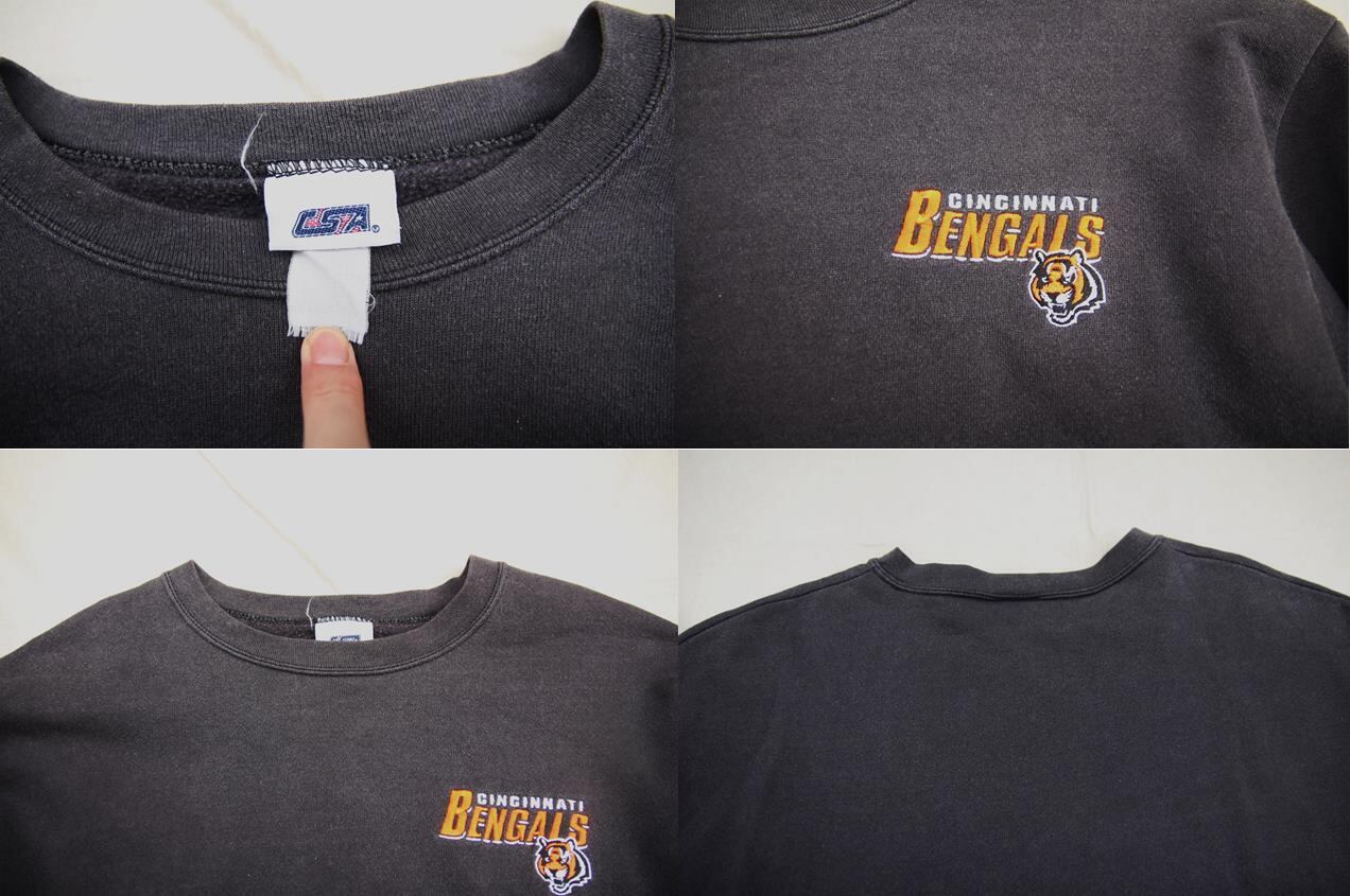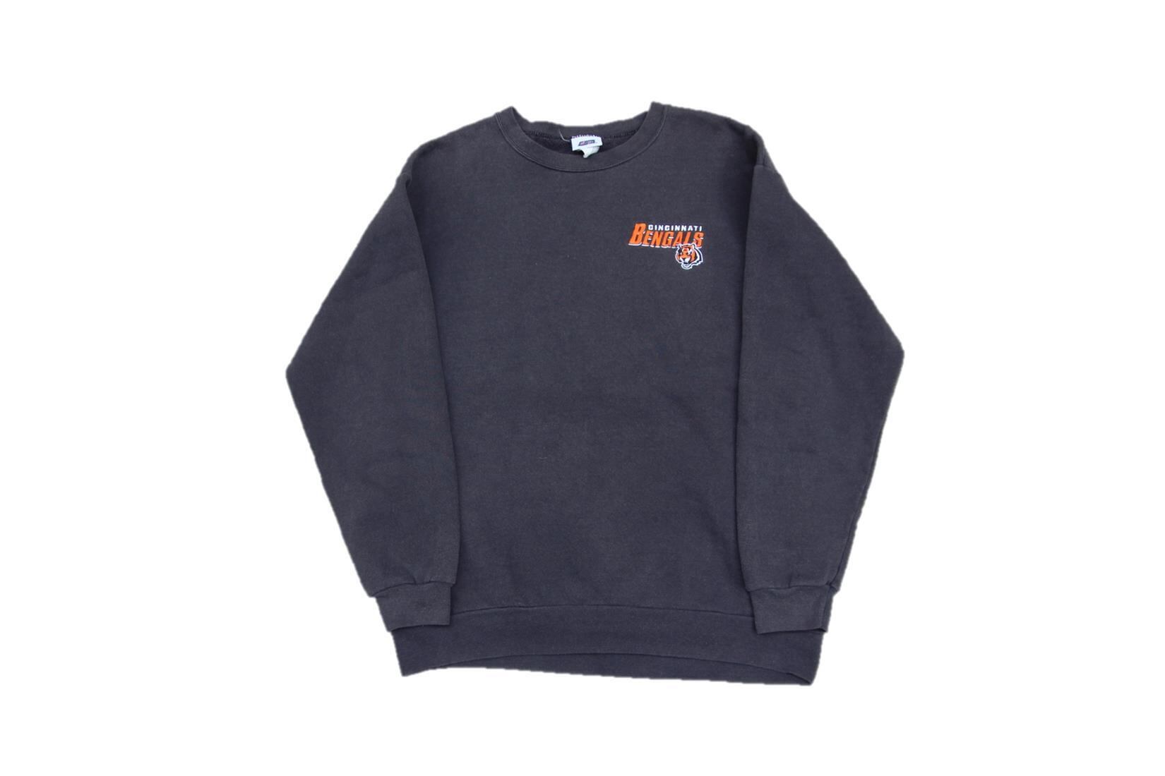 2000年以降頃のCSA製スウェットシャツとなります。元色がブラックかチャコールグレーか分かり難い程フェード感が強いお色で胸にワンポイントで刺繍が入り、刺繍はアメリカシンシナティに本拠地を置くNFL所属のチームCincinati Bengalsの刺繍が入る事からチームグッズとして販売されていた物でしょうか。サイズもL程度の緩めのサイズ感で程良いシルエットにて着て頂けます。お好きな方は是非ご検討下さい。