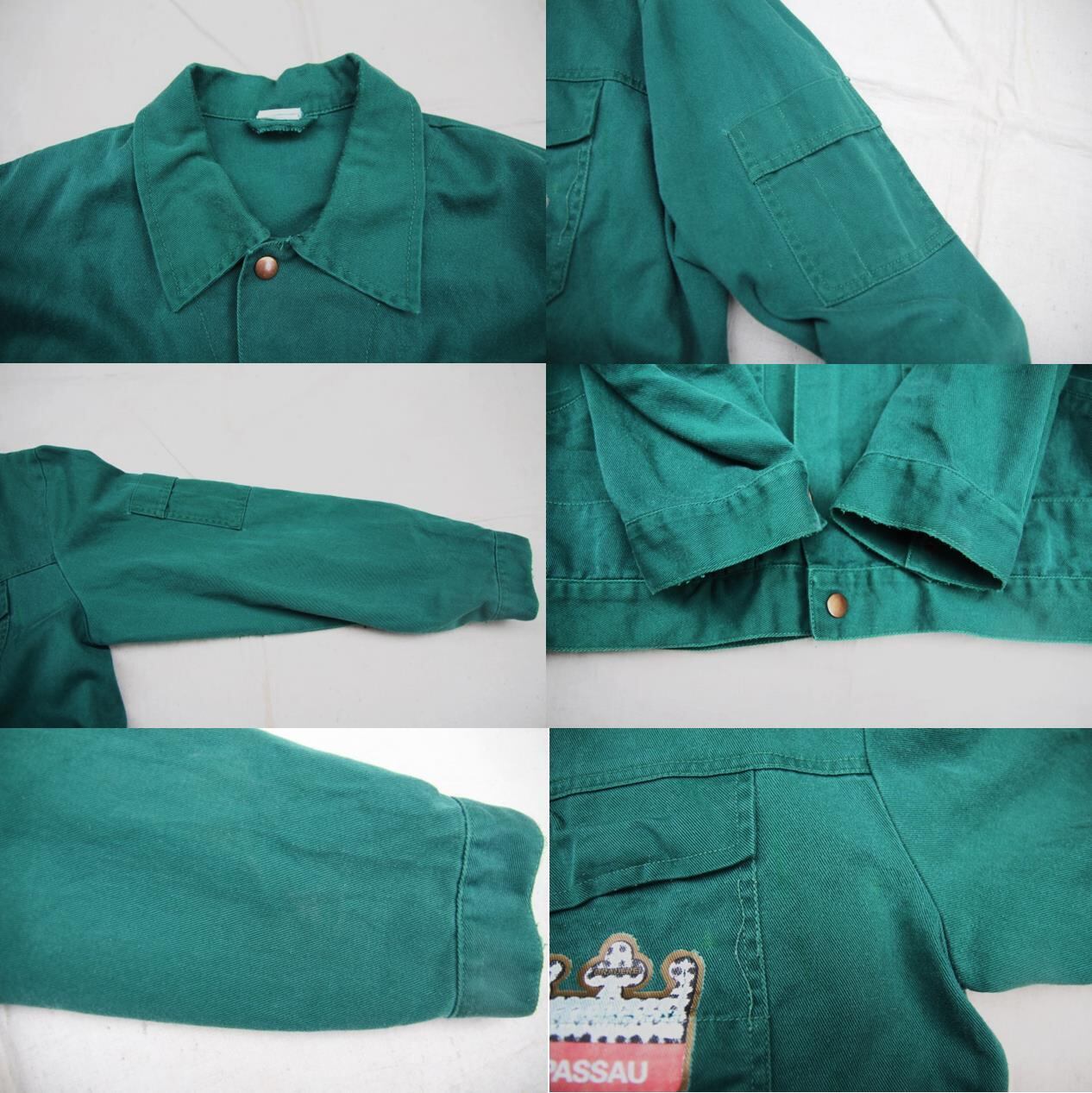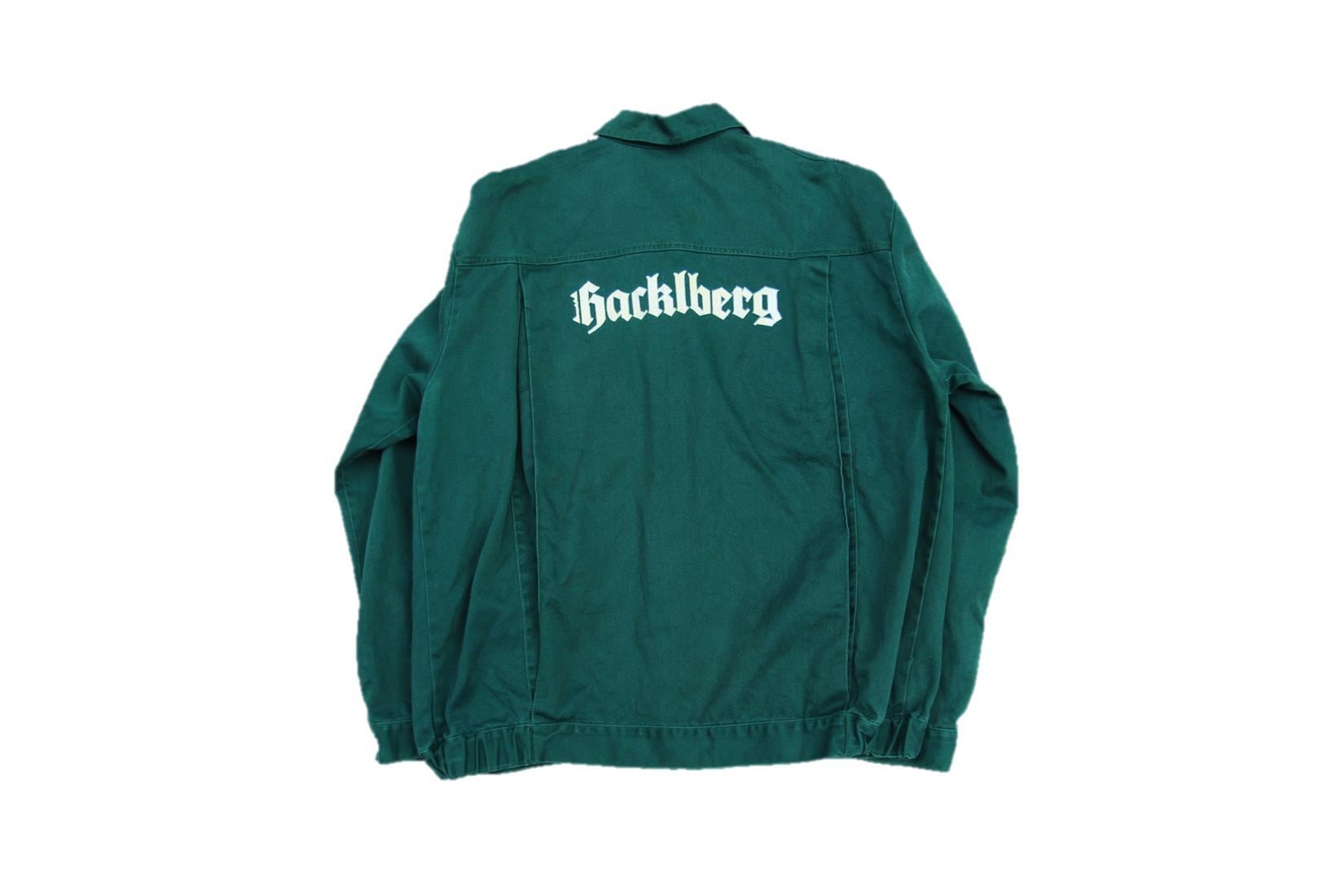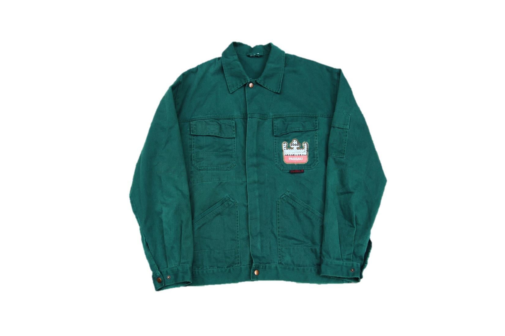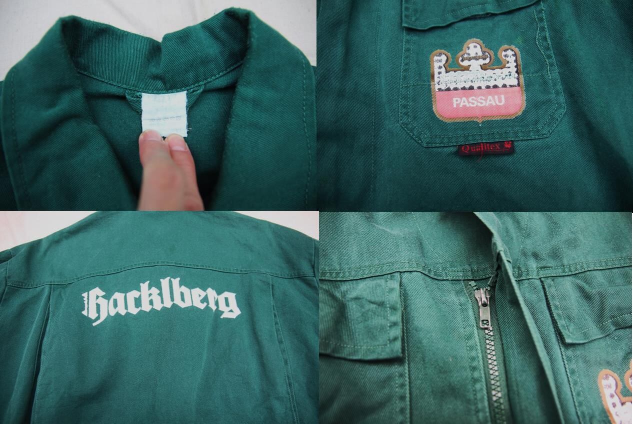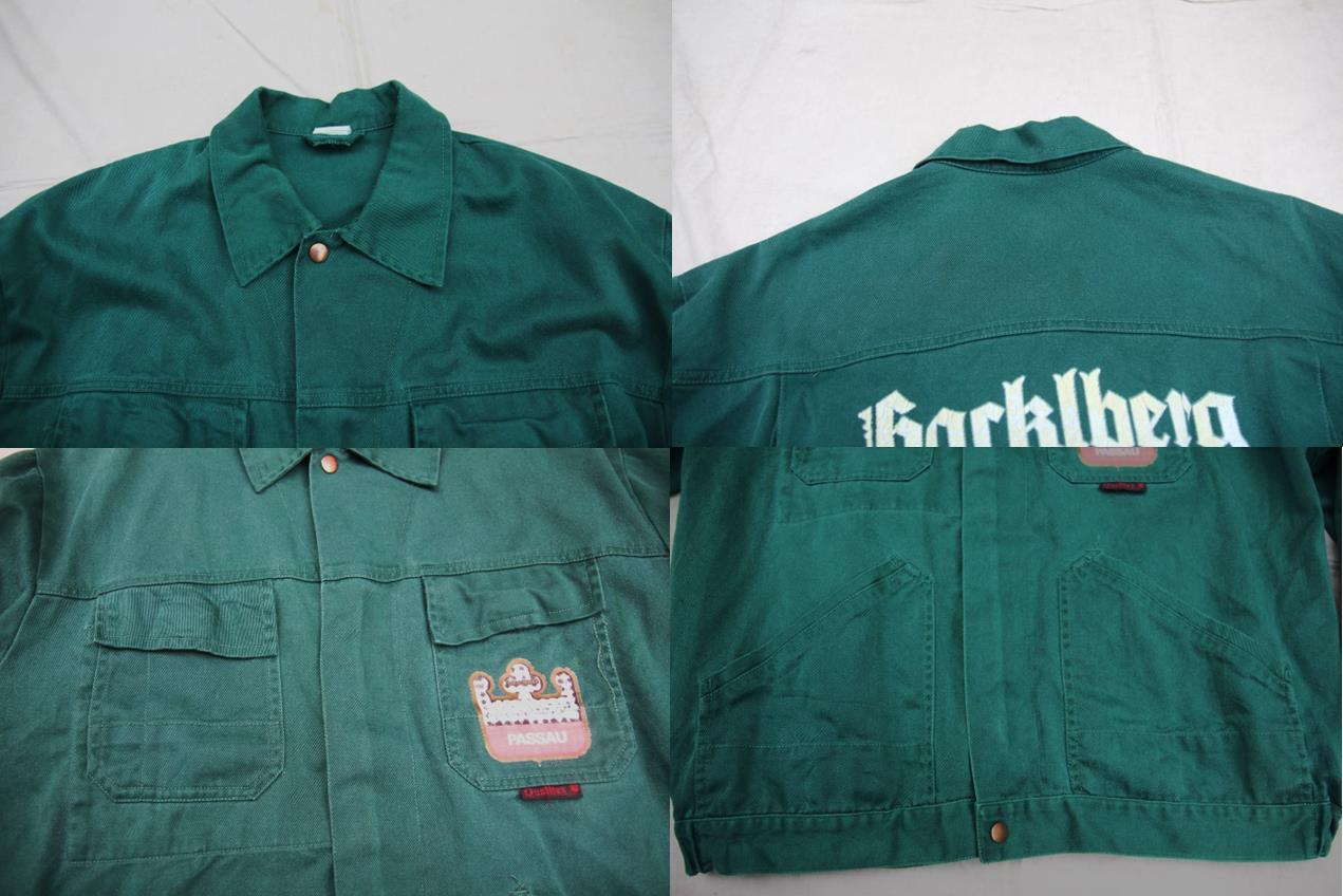 1980年代から90年代頃のQuolitex製コットンユーロワークジャケットとなります。フロントはジッパーとボタン留めの2重仕様となり、左右に胸、ハンドポケットが付きます。左胸、バックにプリントが入り、バックプリントからドイツとオーストリアの国境の町PassauにあるブルワリーのHacklberg Brewery内の作業着として使われていたジャケットでしょうか。サイズもL~XL程度と人気の大き目サイズでカラーも使い易いダークグリーンとなります。古着のワークジャケットは人気も高いのでお好きな方は是非ご検討下さい。