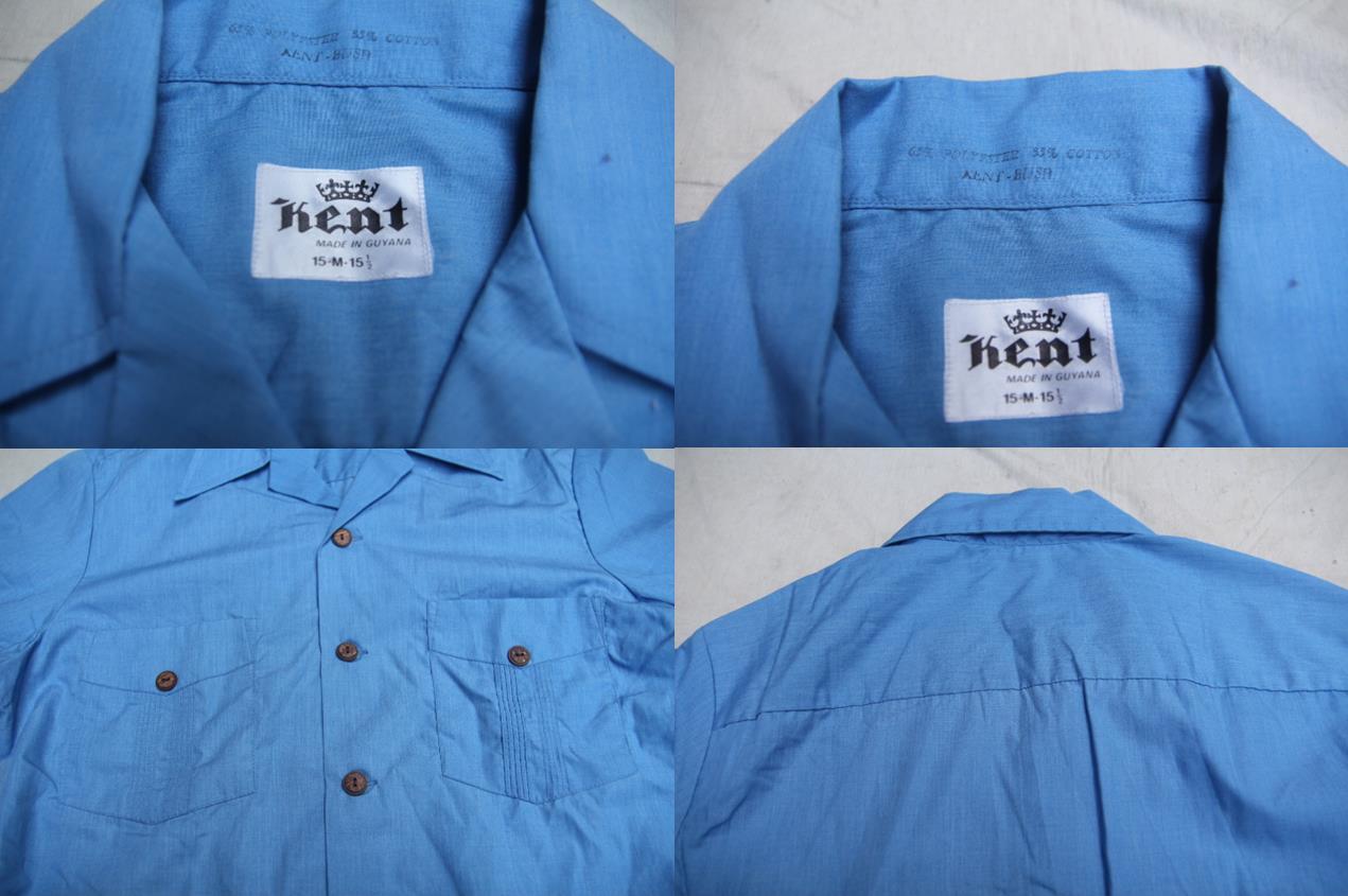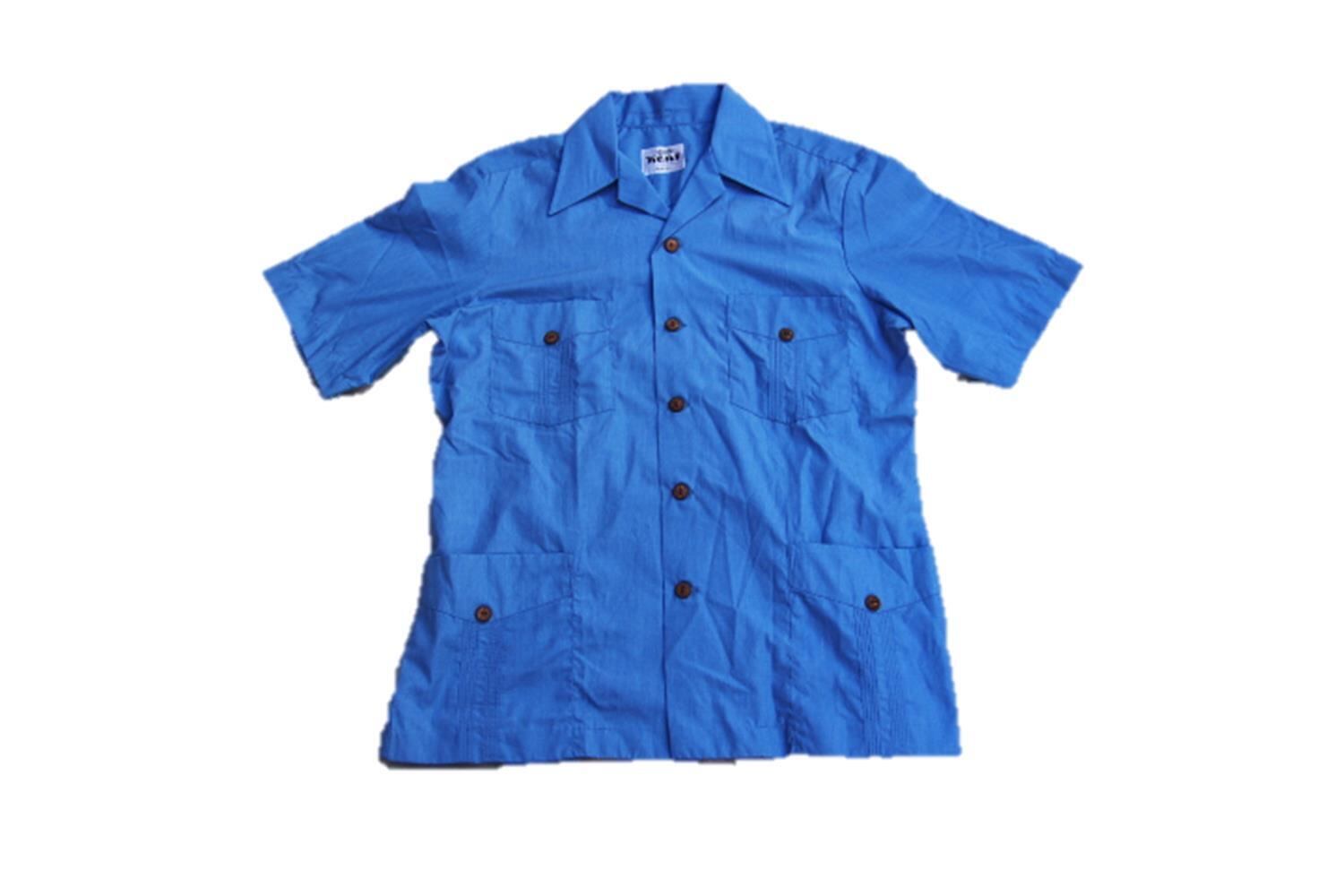 1970年代から80年代頃のキューバタイプシャツとなります。このタイプの4つポケット型タイプシャツでは珍しいガイアナ共和国製となり、恐らくガイアナ共和国内でお土産品等のリゾートシャツの様な形で生産された物でしょうか。キューバシャツの様な派手な刺繍が入らず比較的シンプルなデザインとなります。バック裾部分はベンチレーションタイプとなります。サイズ表記はMとなり表記通りの程度のサイズ感となります。カラーも発色の良いブルーですのでお好きな方は是非ご検討下さい。
