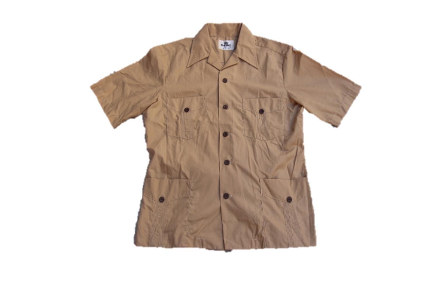 1970年代から80年代頃のキューバタイプシャツとなります。このタイプの4つポケット型タイプシャツでは珍しいガイアナ共和国製となり、恐らくガイアナ共和国内でお土産品等のリゾートシャツの様な形で生産された物でしょうか。キューバシャツの様な派手な刺繍が入らず比較的シンプルなデザインとなります。バック裾部分はベンチレーションタイプとなります。サイズ表記はMとなり表記通りの程度のサイズ感となります。カラーも合わせ易いベージュですのでお好きな方は是非ご検討下さい。