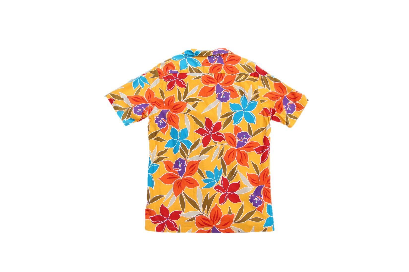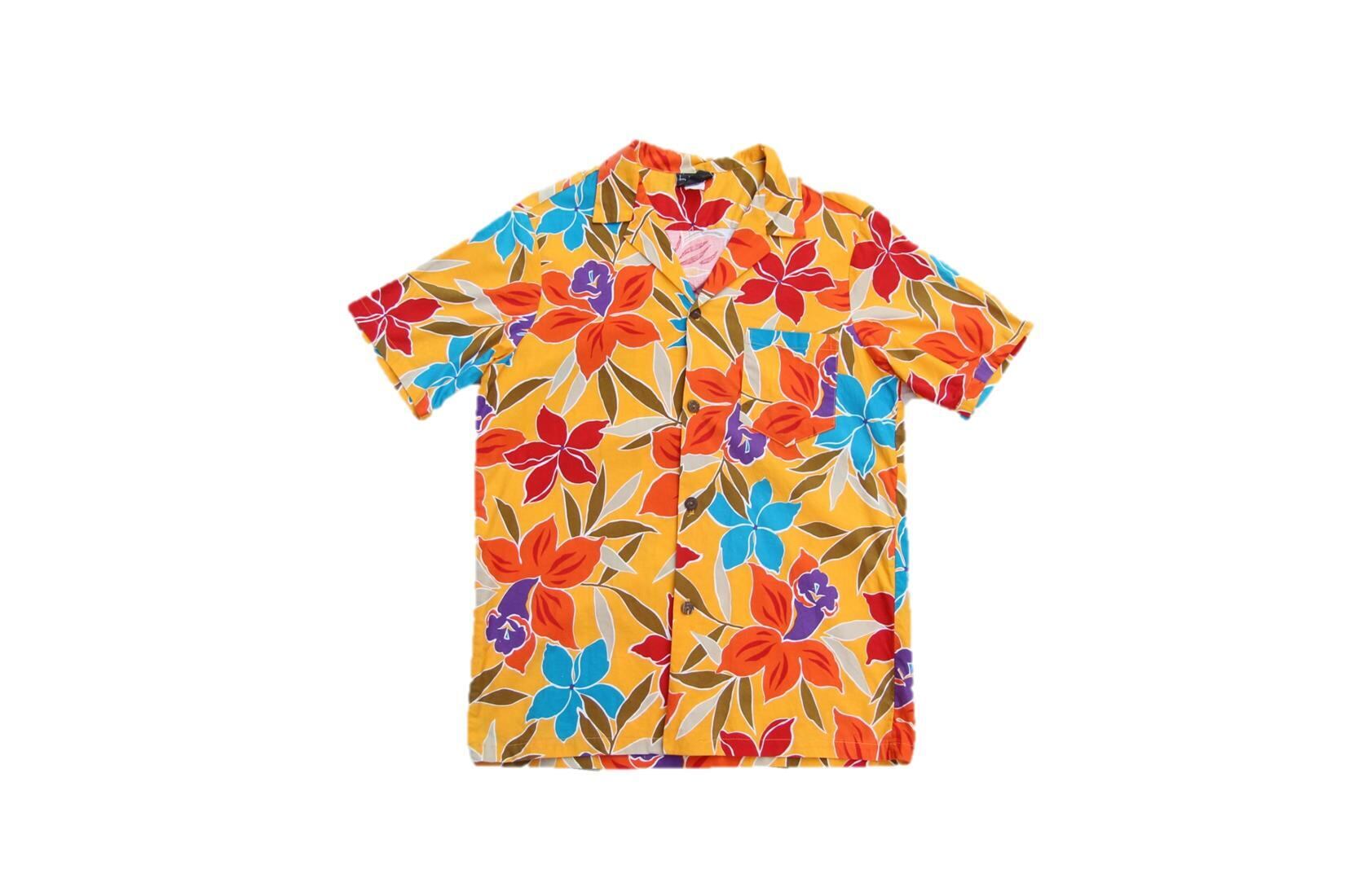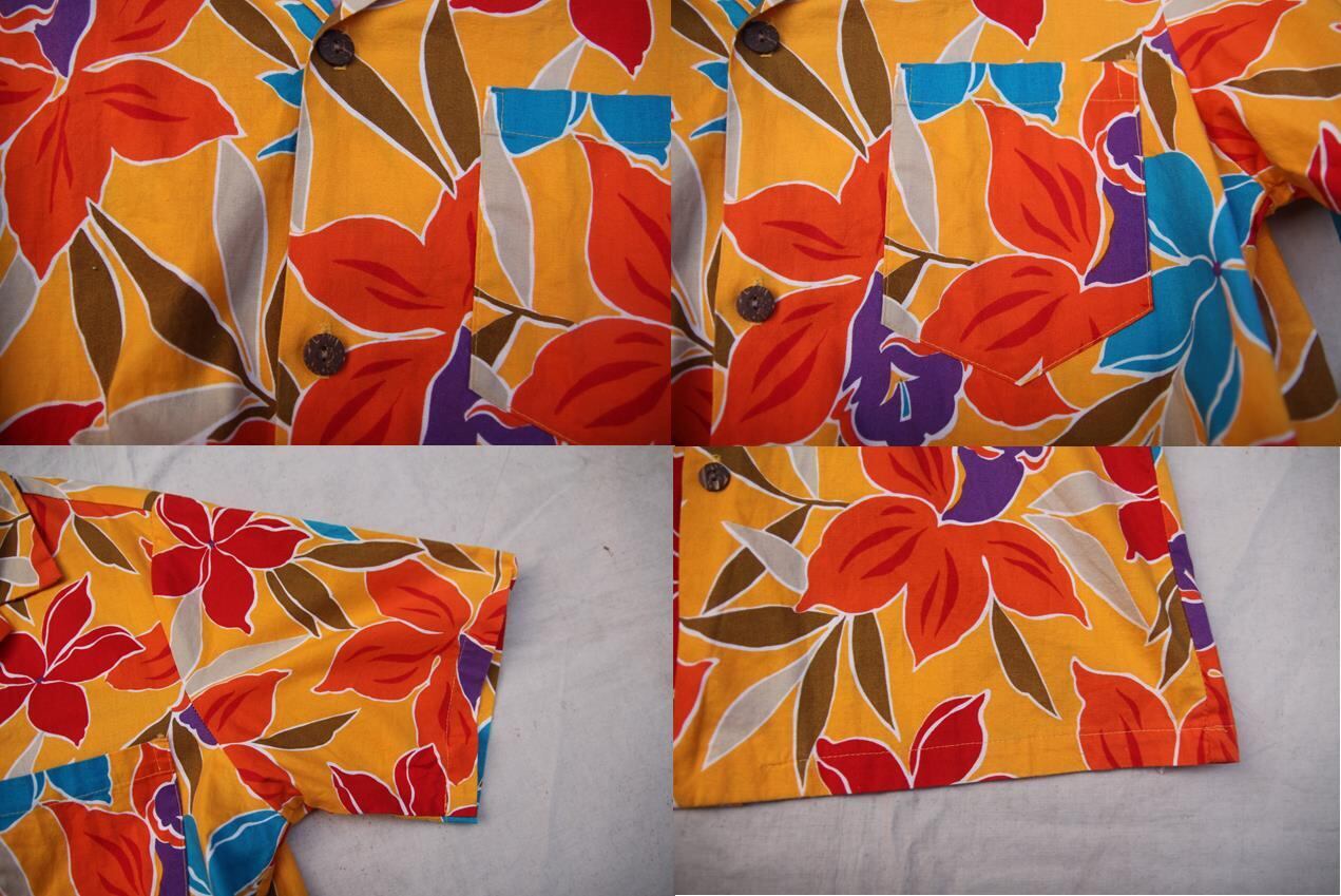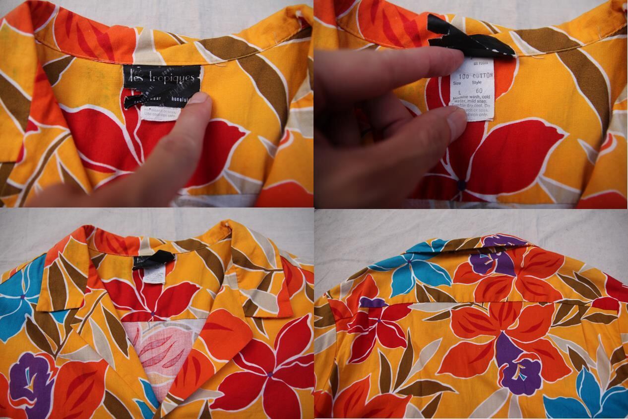 1980年代以降頃のLes Tropiques製のコットンハワイアンシャツとなります。鮮やかな配色パターンに花柄のオールオーバーパターンとこれぞハワイアンシャツと呼べる色、柄のシャツとなります。開襟にボックス型、左胸片ポケットでサイズ表記はLとなります。素材はコットン表記ですが、多少ストレッチ素材が混合しております。ザ・ハワイアンシャツのオールド物をお探しの方は是非ご検討下さい。