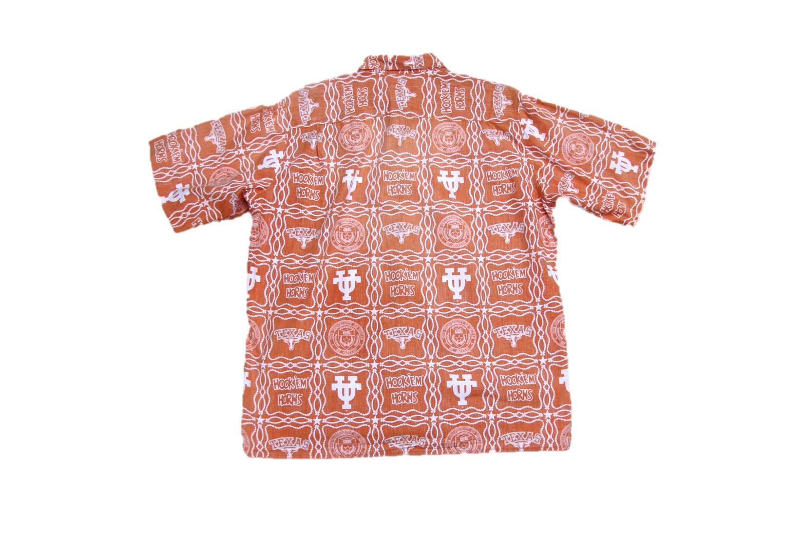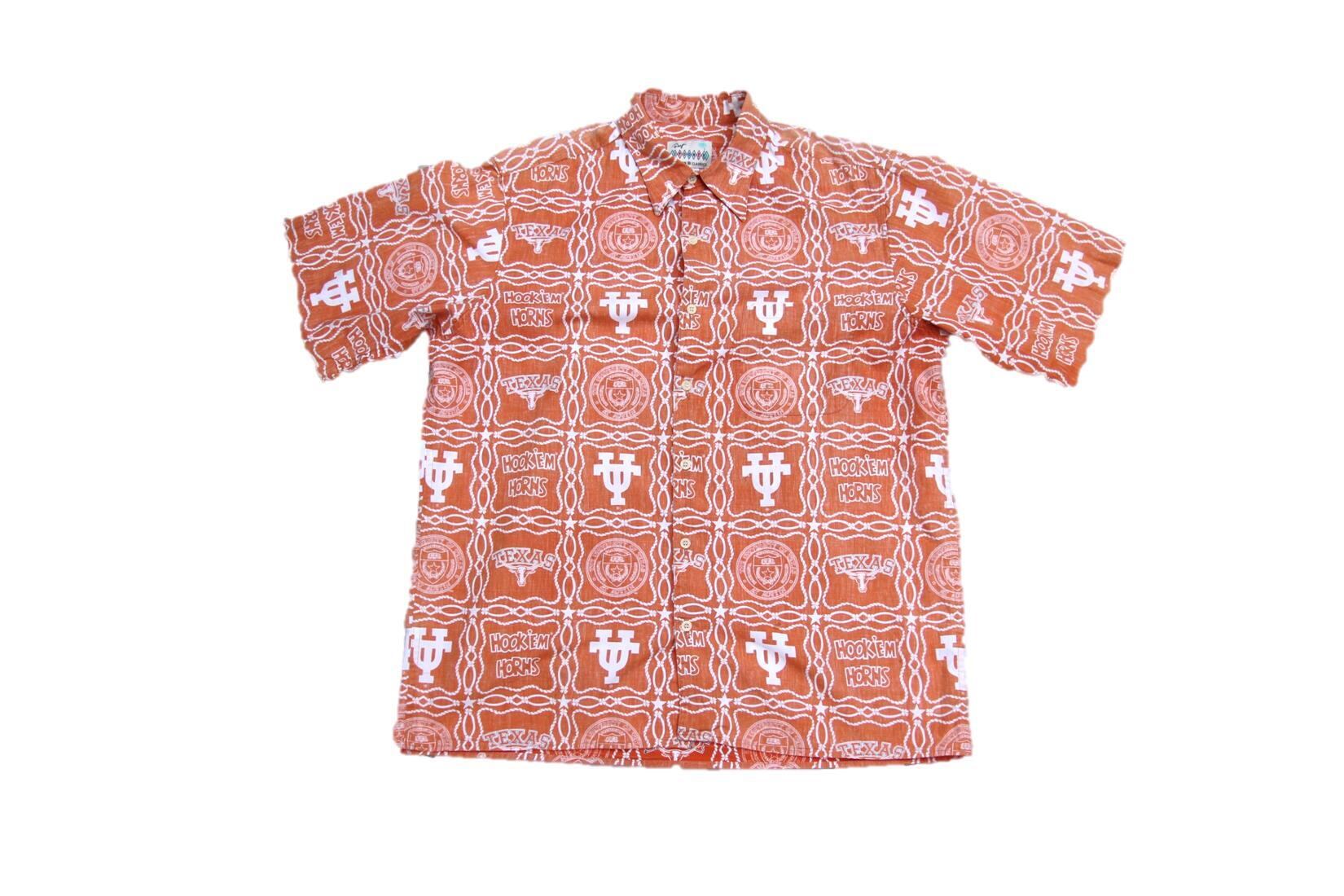 1980年代以降頃のレインスプーナー製半袖コットンシャツとなります。ハワイ発のブランドでハワイアンシャツのボディで見掛ける事が多いブランドですがこちらはハワイアンシャツでは無い点も珍しいかと思います。全体総柄でテキサス大学のTUロゴとロングホーン、大学のハンドサインでもあるHook En Hornsの文字や縄模様等テキサスらしい総柄となり、恐らく大学内もしくはスーベニアとして販売されていたシャツでしょうか。レインスプーナーらしく裏反転柄でサイズもMですが多少大き目なシルエットサイズとなります。鮮やかなオレンジベースですのでお好きな方は是非ご検討下さい。