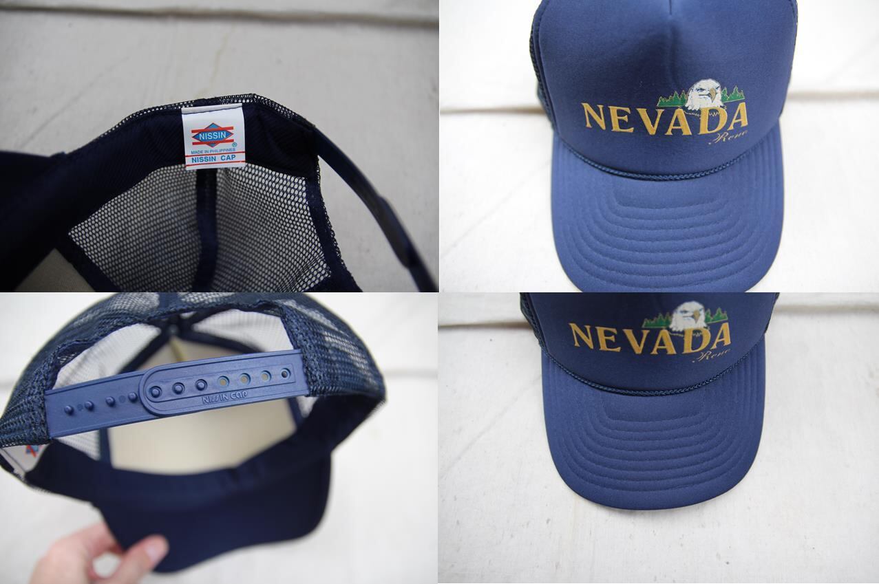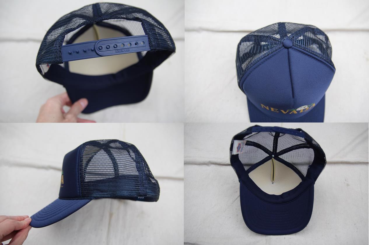 2000年以降頃のNissin製メッシュキャップとなります。ネイビーの単色でクラウン部分にNevadaとRenoとイーグルのプリントが入るアメリカらしいキャップとなります。アジャスターはアメリカンアジャスター仕様でプリントから恐らくRenoのお土産品等で作られたキャップでしょうか。適度な高さで状態も中々良いのでメッシュキャップ好きの方、探されていた方は是非ご検討下さい。