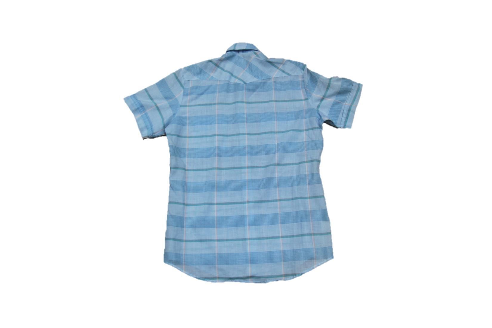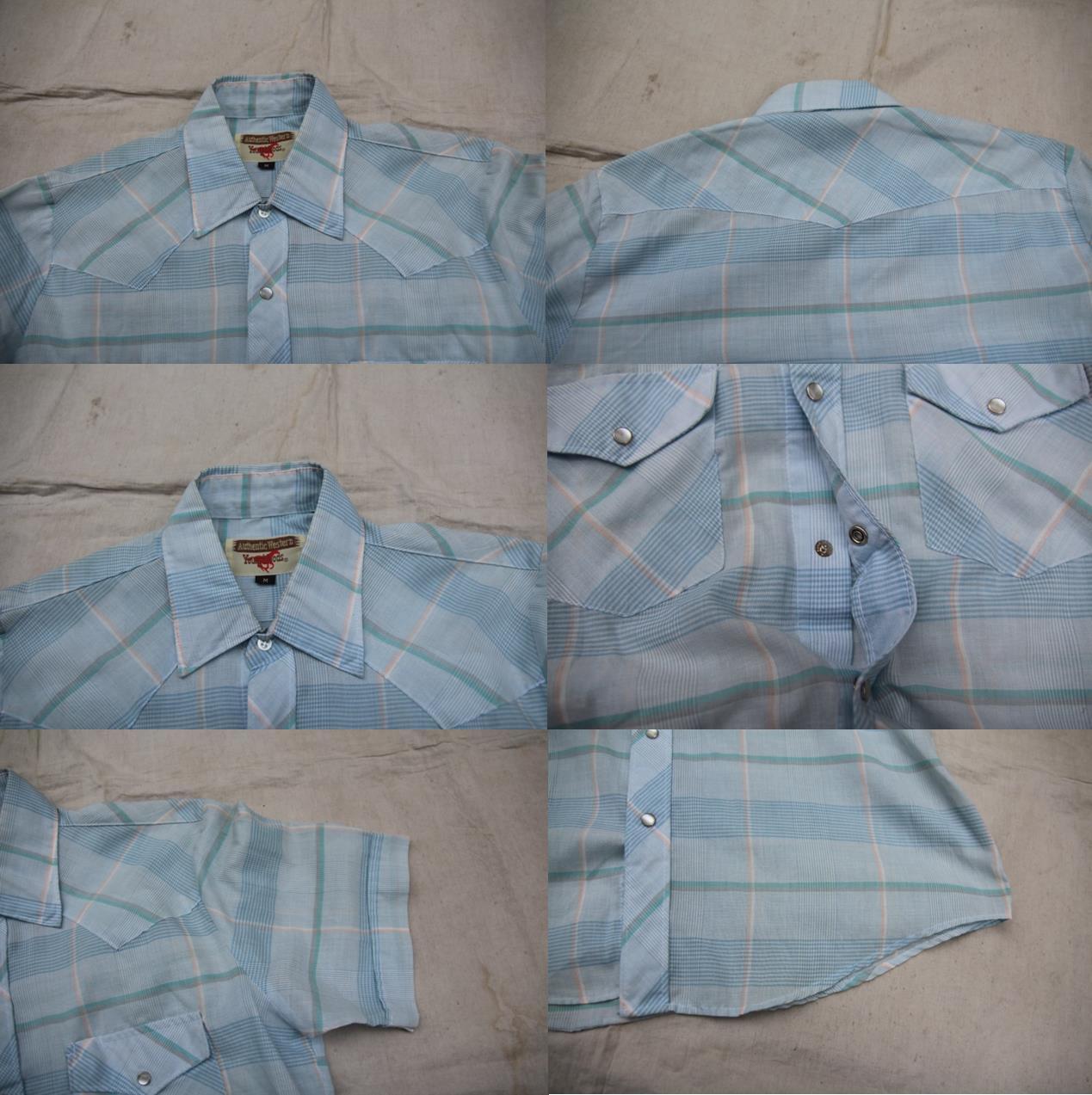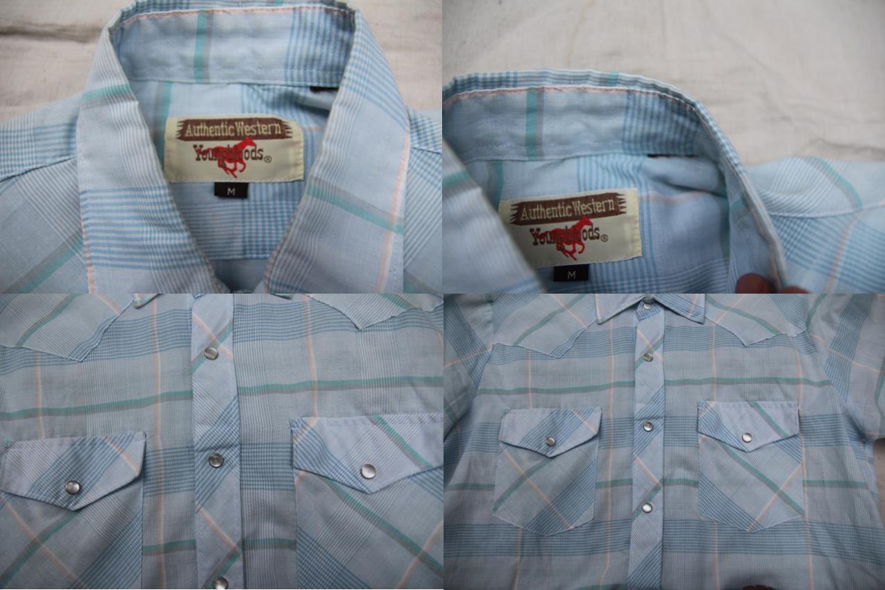 1980年代頃のYoungbloods製の半袖ウエスタンシャツとなります。淡いカラー配色のチェック柄でウエスタンヨークにフロント、胸がスナップボタン仕様、サイズ表記がMですが、ウエスタンシャツらしい着丈が多少長めな作りとなります。素材は表記は御座いませんが、触った感じでは恐らくコットンとポリエスターの混紡素材ですので柔らかくさらっとした着心地で着て頂けます。まだまだ注目されていないウエスタンシャツですがお好きな方も多いかと思いますので是非ご検討下さい。