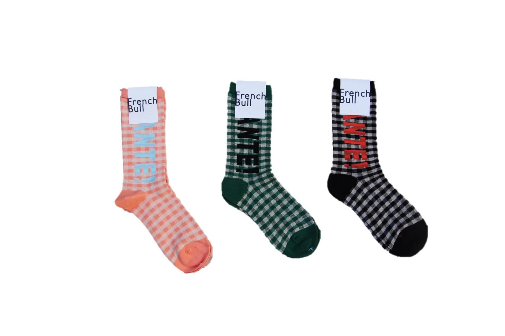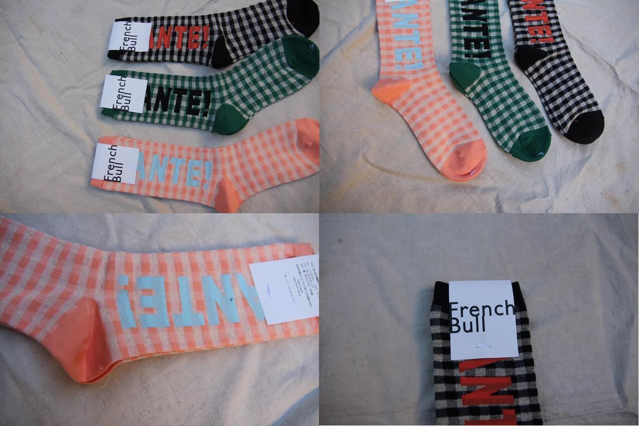 当店取扱いレディースブランドFrench Bullより新作ソックスです。テーブルに敷かれたギンガムチェック柄のクロスにフランス語で[SANTE!]の乾杯の掛け声が聞こえてくる宴のワンシーンをイメージした柄のソックスです。ベースは綿麻で、薄手に編まれているので履き易く、コーデの主役に出来る可愛い1足です。