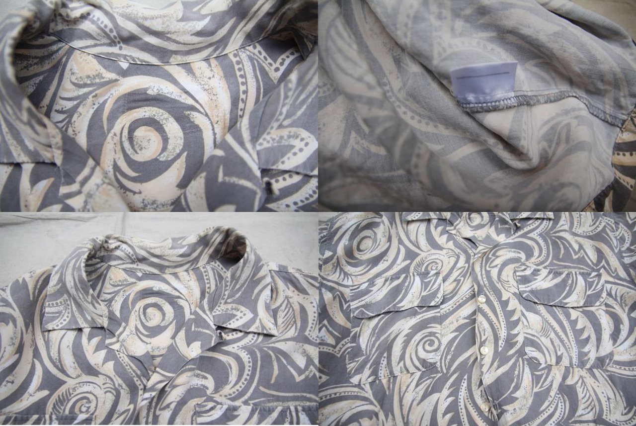1990年代以降のブランド不明長袖レーヨンシャツとなります。開襟にフラップ付きポケット、BOX型と50年代ヴィンテージシャツでディテールのこちらは幾何学の様な渦巻総柄のヴィンテージシャツやハワイアンシャツに見られる柄パターンとなります。素材も肌触りの良いレーヨン地で表記は不明ですが、実寸でMの大き目程度と大変良いサイズ感です。このデザインでヴィンテージ物になると数万以上や10万オーバーでも可笑しくないシャツですのでヴィンテージシャツに拘らずデザインがお好きな方は是非ご検討下さい。