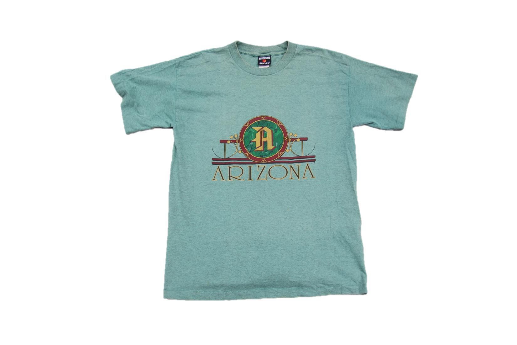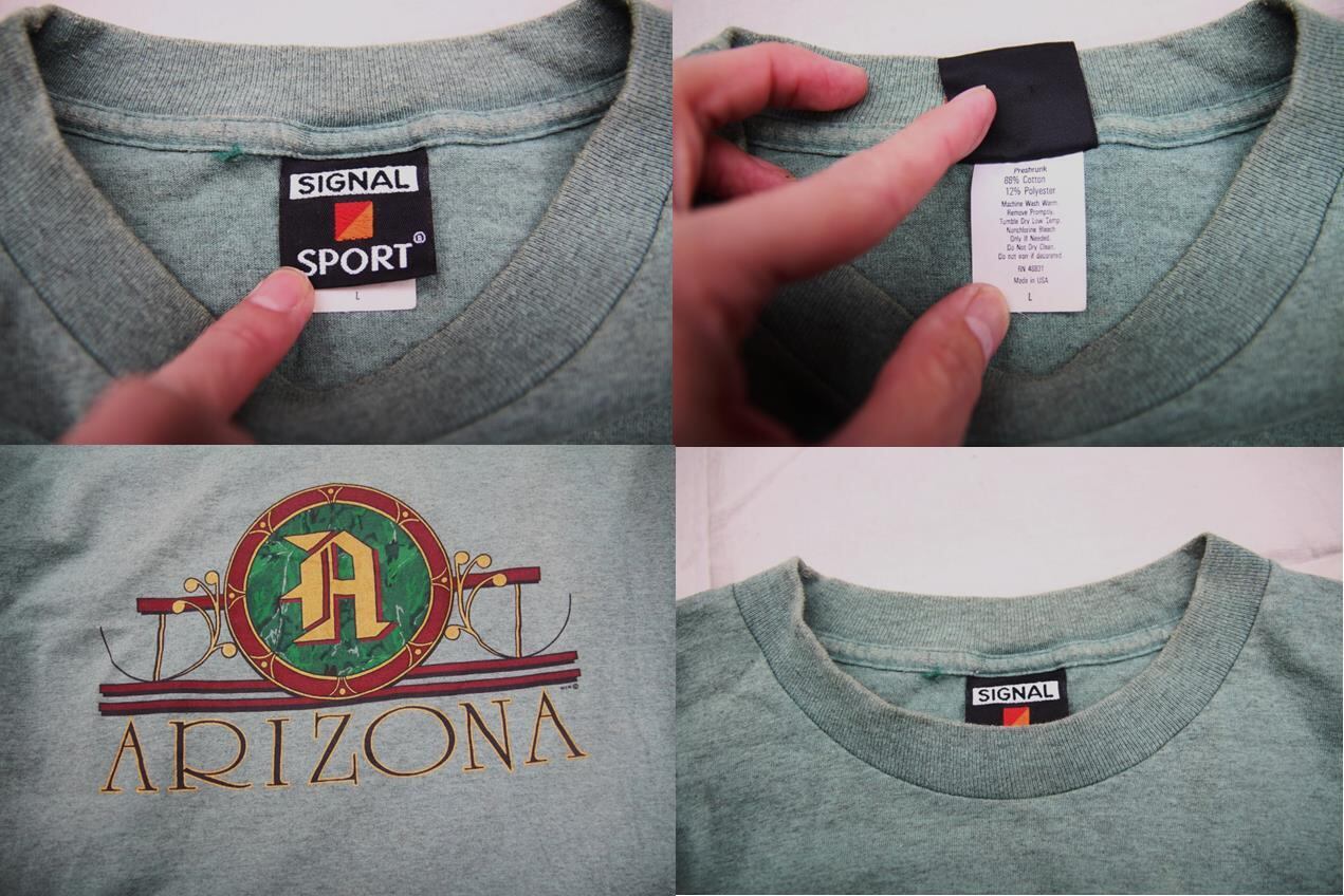 1990年代頃のSignal Sport製プリントTシャツとなります。霜降りオリーブベースのボディにフロントのみのプリントでロゴとARIZONAの文字が入る点から恐らくスーベニア用として生産されたTシャツでしょうか。プリントデザインも大変格好良く、サイズもLと人気サイズで希少なUSA製となります。袖もシングルステッチのオールド物ですのでお好きな方は是非ご検討下さい。