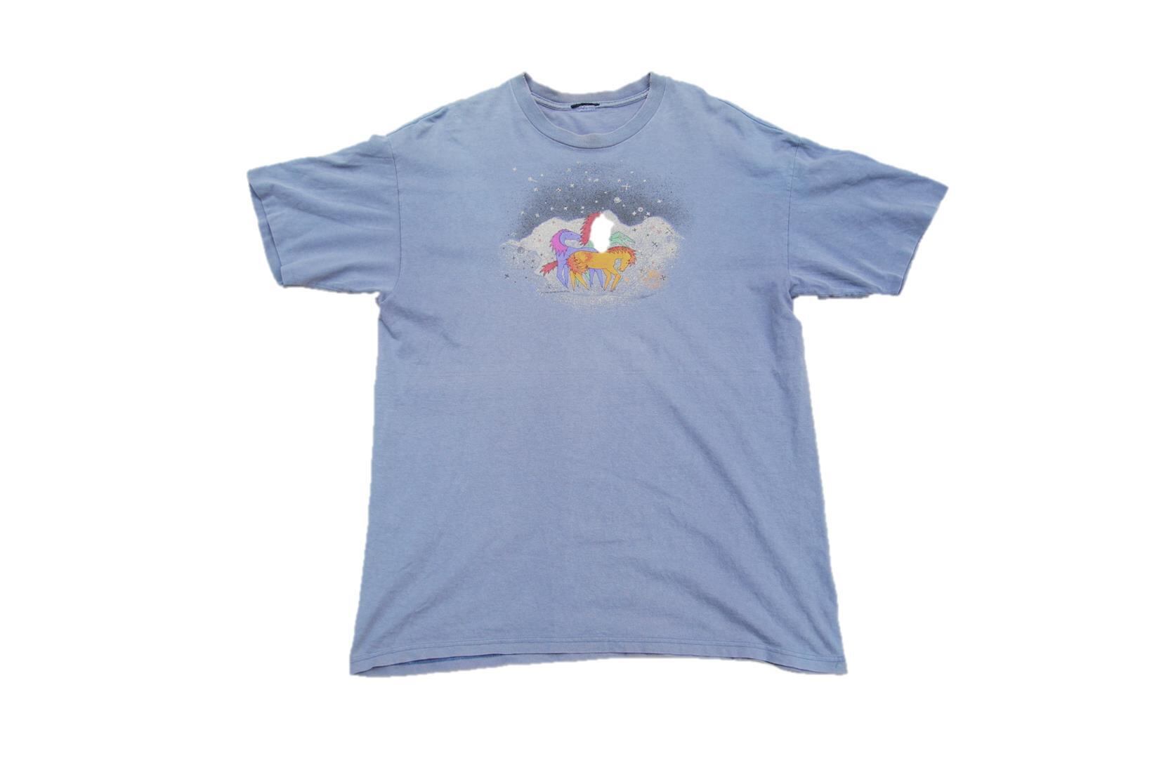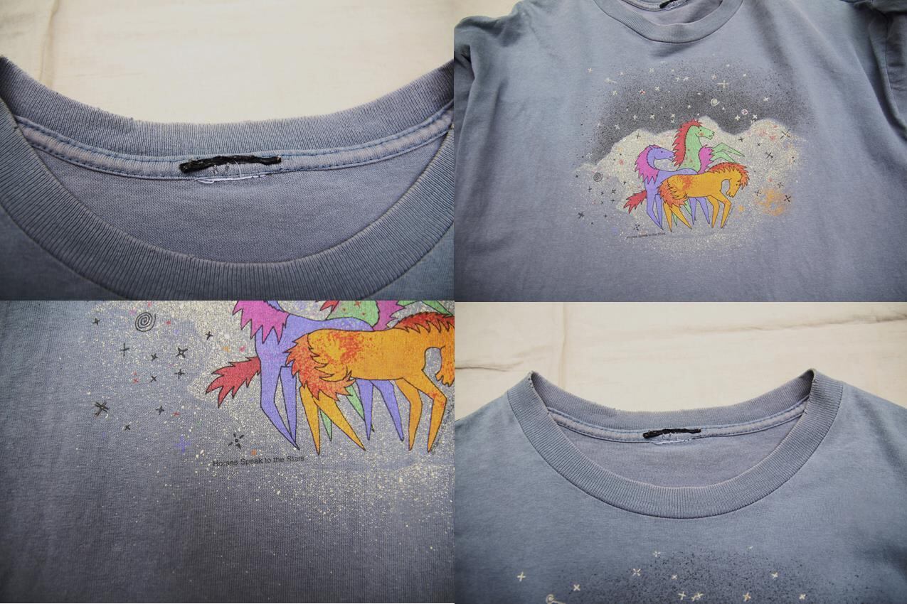 1980年代以降頃のブランド不明プリントTシャツです。グレーが大変雰囲気でフェードしており、独特な色味となっております。プリントはフロント上部のみでユニコーンの様な可愛いタッチで描かれた馬がプリントされております。お色も多色使いで良い雰囲気かと思います。袖はシングルステッチですのでオールド物になるかと思います。タグ欠損ですのでサイズは不明ですが、実寸ではL程度と大変良いサイズ感となります。この手のアニマル系プリントがお好きな方は是非ご検討下さい。