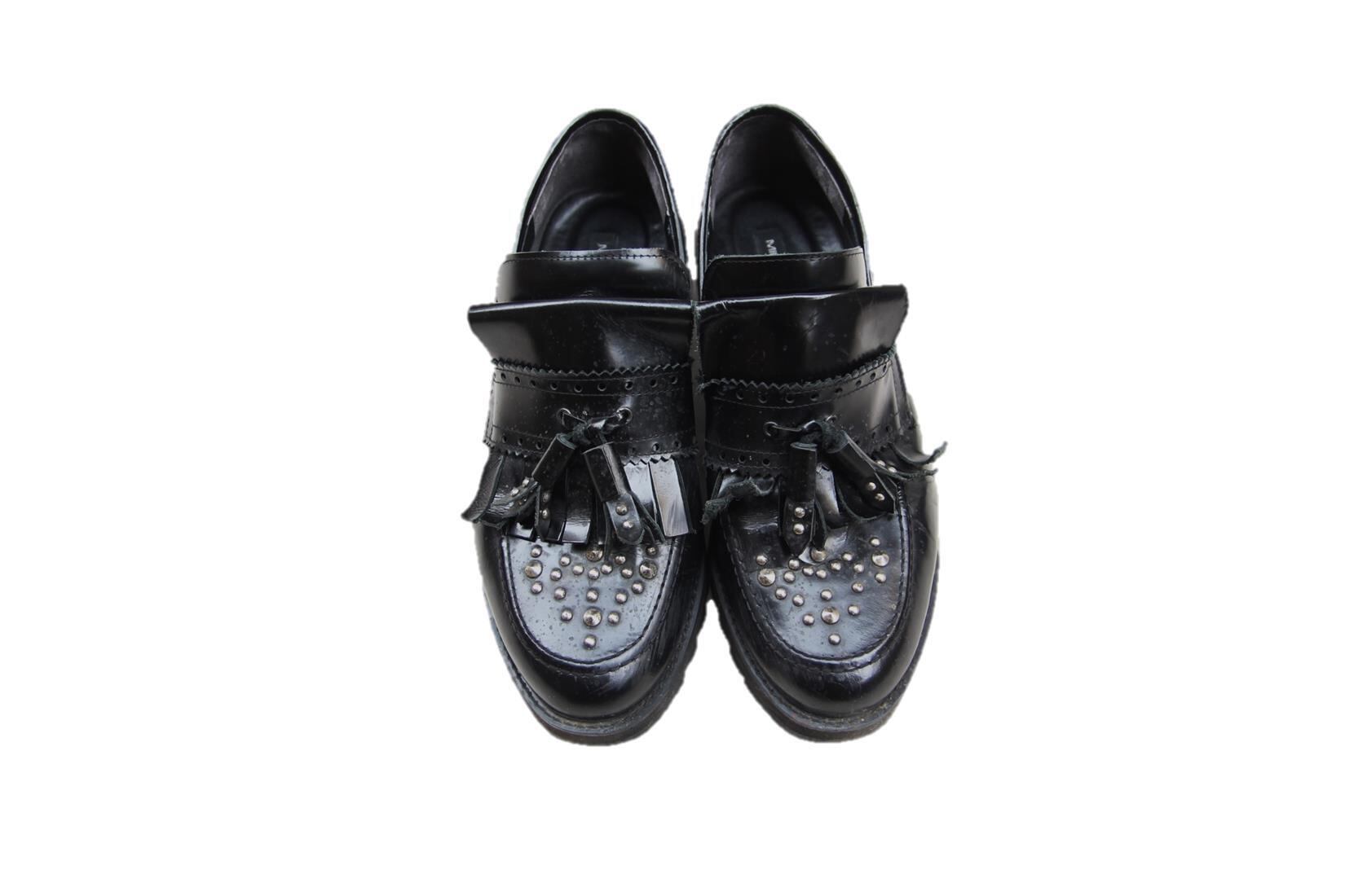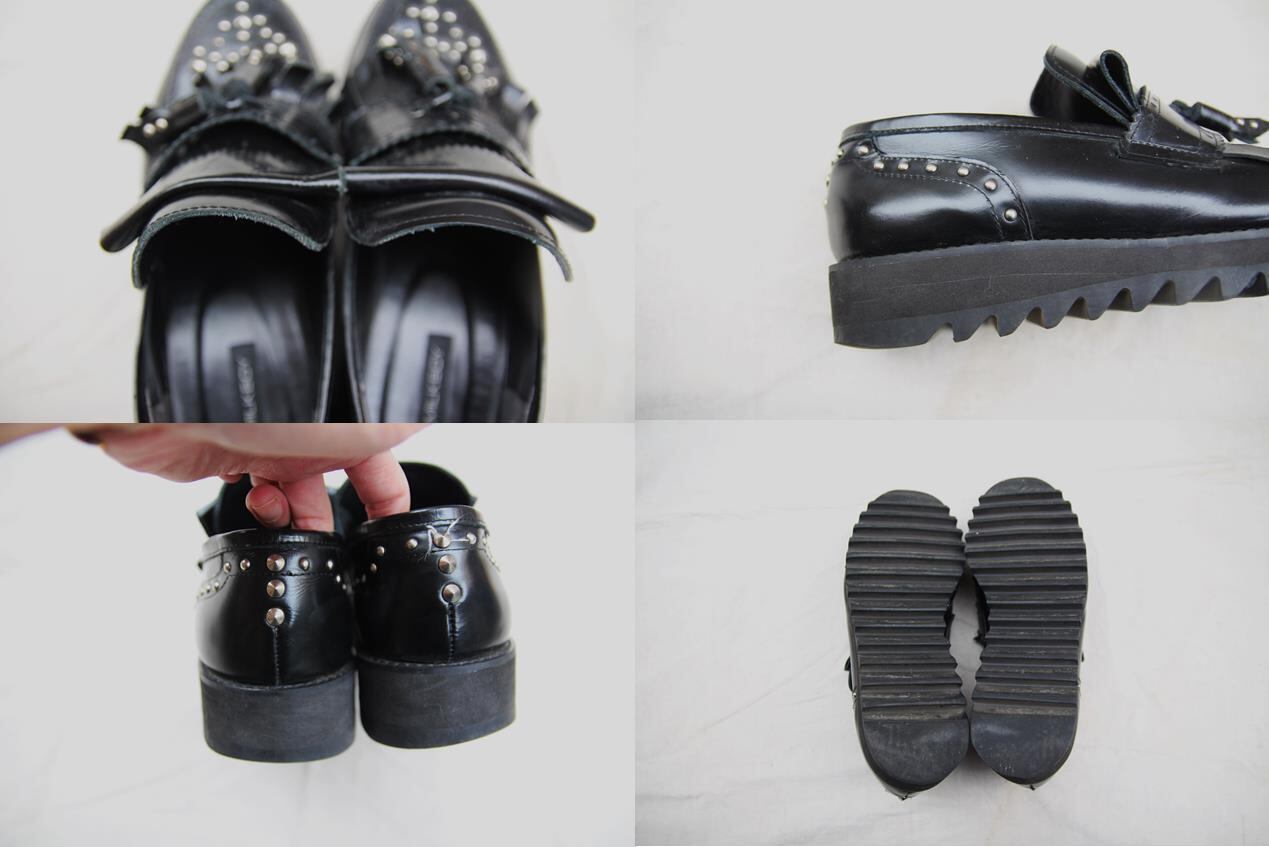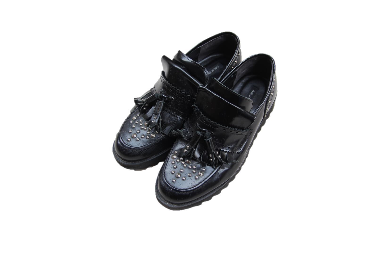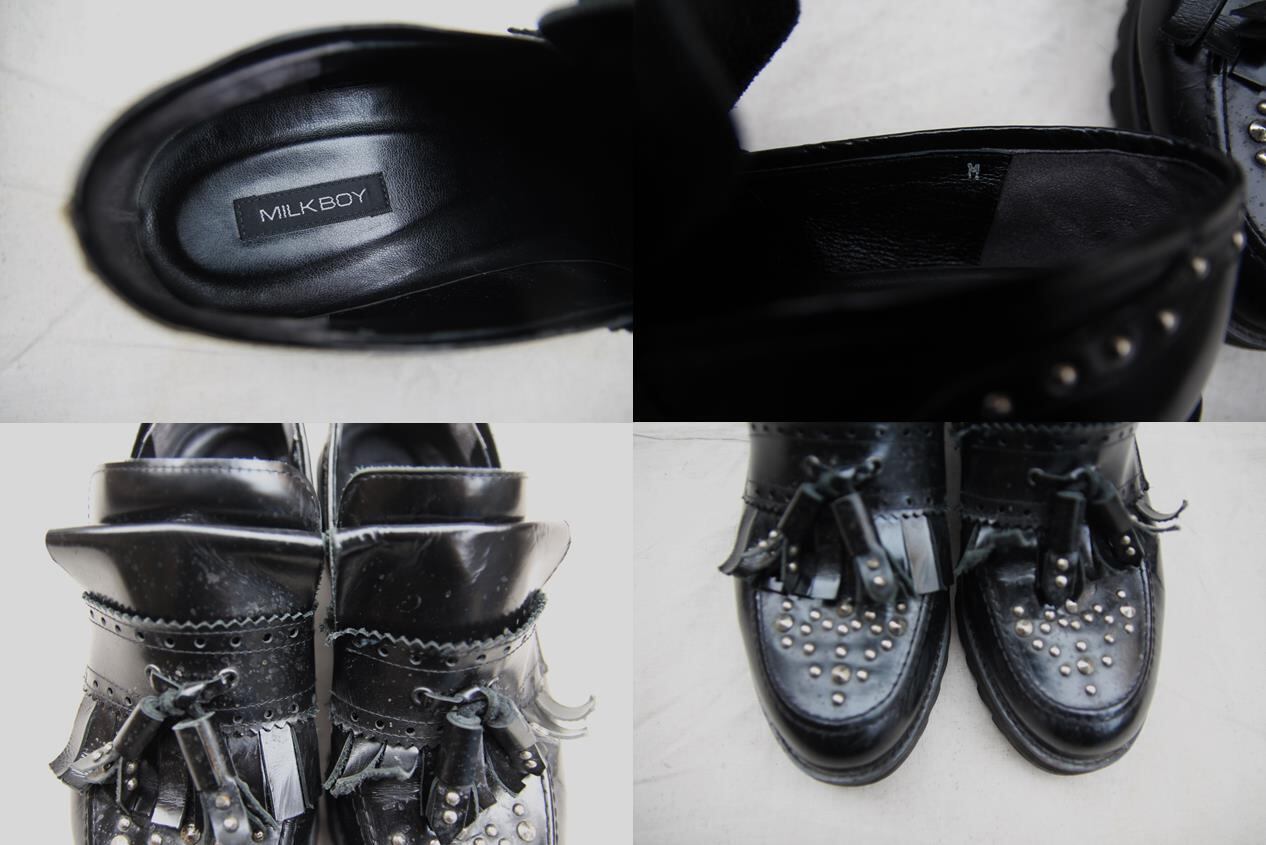 1974年代に設立され90年代から原宿を引率してきたブランドMILKのメンズラインでもあるMILKBOYのレザーローファーです。ブランドらしいトゥ部分からヒール、タッセル等にスタッズが撃ち込まれているパンクテイスト等にもハマるデザインとなります。ソールもシャークソールの様なデザインでボリューム感がある作りですので現在の厚底シューズ等の流行にも対応出来るフォルムです。サイズはM表記で26.5から27cm程度の方であれば履けるサイズ感ですのでブランドがお好きな方、デザインが好みの方は是非ご検討下さい。