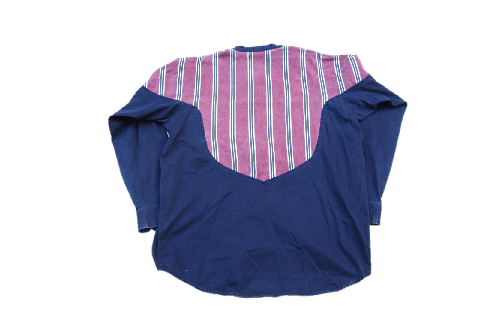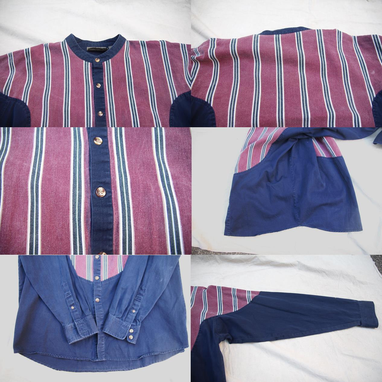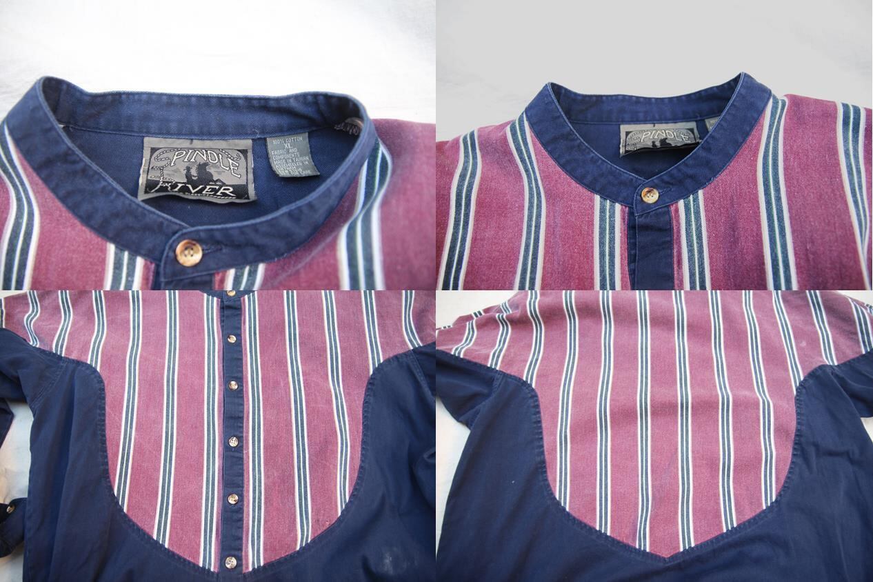 1990年代頃のSpindle River製のカラーレスシャツとなります。フロント、バック共に深めのヨーク切り替えが2トーンの様になっており、上部がストライプ柄、下部がネイビー単色の切り替えで大変POPで可愛いデザインとなります。サイズはXLと大き目サイズですのでビッグシルエットがお好きな方、お洒落なカラーレスシャツをお探しの方は是非ご検討下さい。
