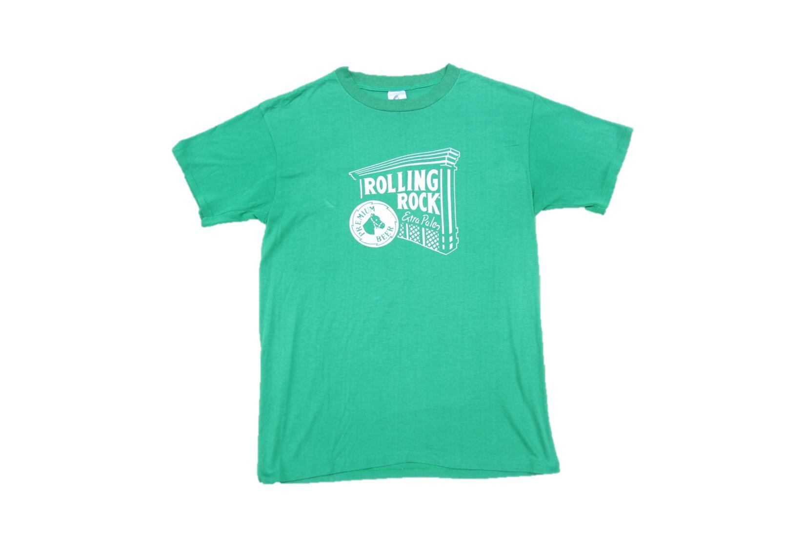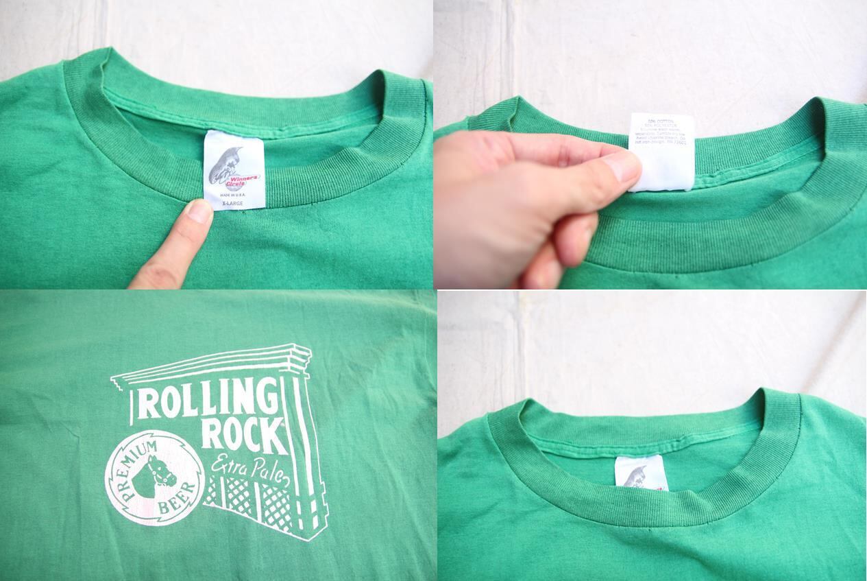 1990年代頃のWinners Circle製半袖プリントTシャツとなります。フロントのみのプリントでプリントは1939年から発売されているアメリカの老舗ビールメーカーRolling Rockのプリントが入ります。グリーンボディにラベルデザインのプリントが入る所謂ビールメーカー企業系プリントTシャツになります。BudweiserやCorona、Schlitz等はTシャツでも見掛ける事はありますが、Rolling Rockは中々見掛けないプリントですので気になる方は是非ご検討下さい。サイズはXL表記の大き目サイズとなります。
