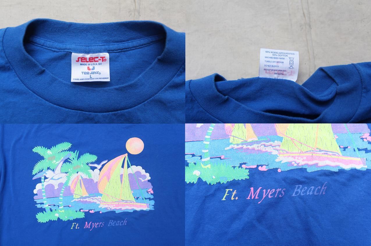 1980年代から90年代頃のTee Jays製プリントTシャツとなります。プリントはアメリカフロリダ州にあるFort Myers Beachの文字とヨットやカモメ、海のデザインが入る事からアメリカTシャツでも良く見られる現地のお土産品等で販売されていた物かと思われます。発色の良いブルーカラーが程良く退色し、サイズも人気のLサイズ、希少なUSA製で袖もシングルステッチとなります。サーフTシャツ乗りのプリントですので、この手のプリントがお好きな方は是非この機会にご検討下さい。