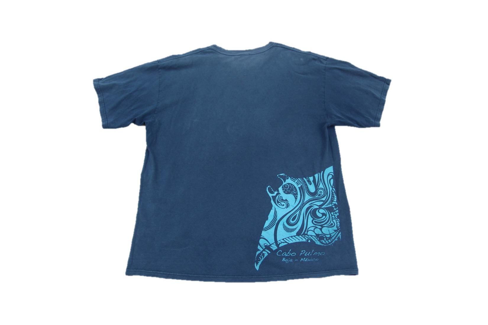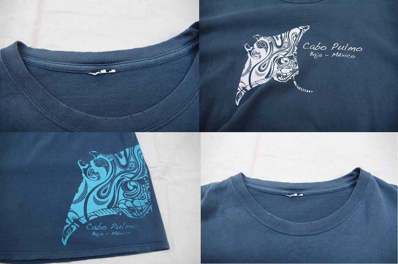 1990年代以降頃のブランド不明プリントTシャツとなります。退色したネイビーボディにフロント中央、バック右裾脇付近に両面プリントが入り、プリントからメキシコにあるリゾートビーチのCabo Pulmoの文字が入るのとデザイン性のあるエイがプリントされているので恐らく現地の当時お土産品として販売されていたTシャツかと思われます。サイズは実寸でXL程度の多少縮みあり程度と大変良いサイズ感です。アート的デザインのTシャツですのでお好きな方は是非ご検討下さい。