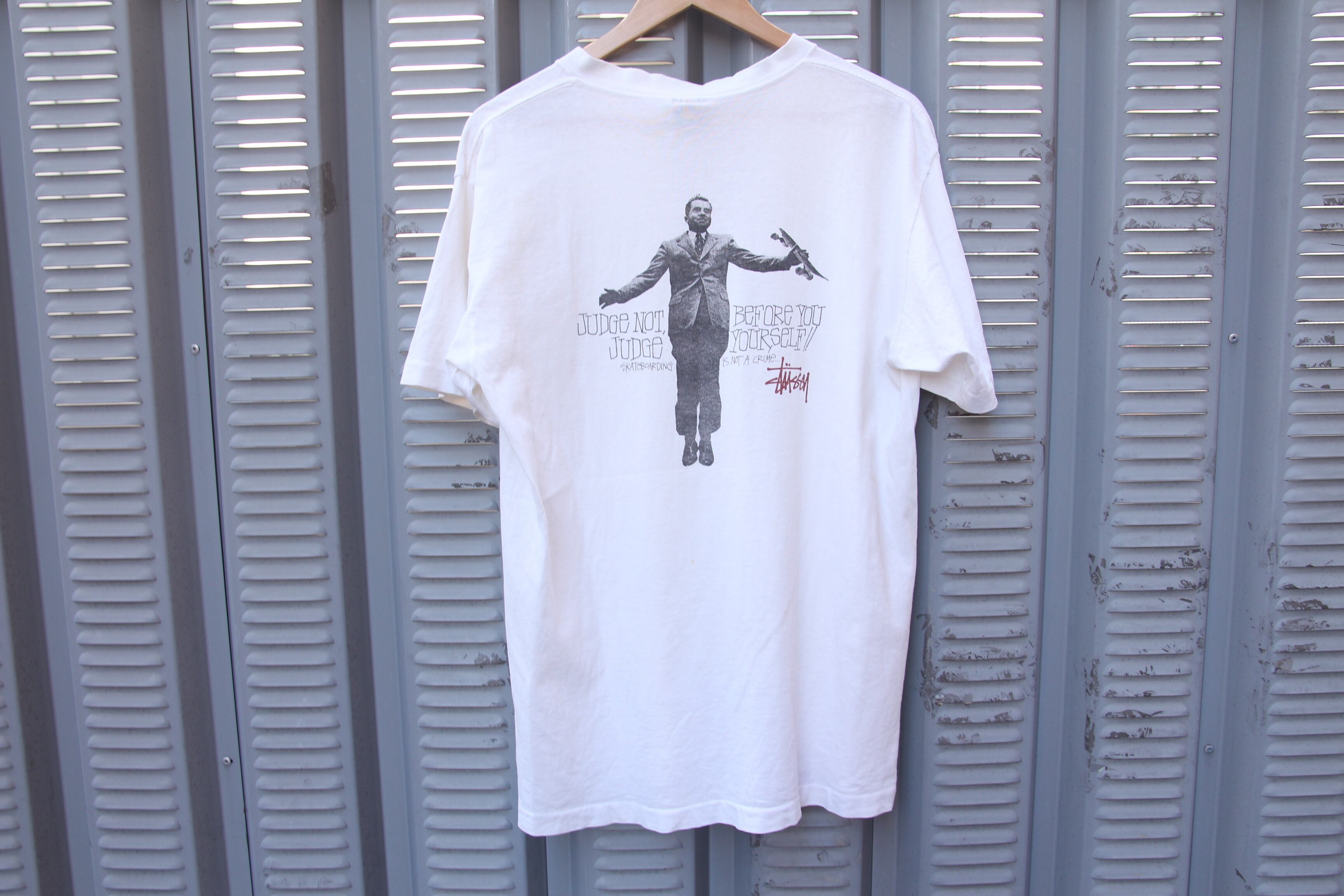 1980年代のSutussy製半袖バックプリントTシャツとなります。こちらはのアイテムは言わずと知れた超名作です。80年代の黒タグで、ファンの方からは激レアアイテムともいわれております。状態も良く、サイズもLサイズと男女問わず着用できます。豪華なバックプリントのデザインに惹かれるアイテムです。この手のアイテムは現在中々見る事の出来ないアイテムですので、お好きな方や気になる方は是非この機会にご検討の程宜しくお願い致します。