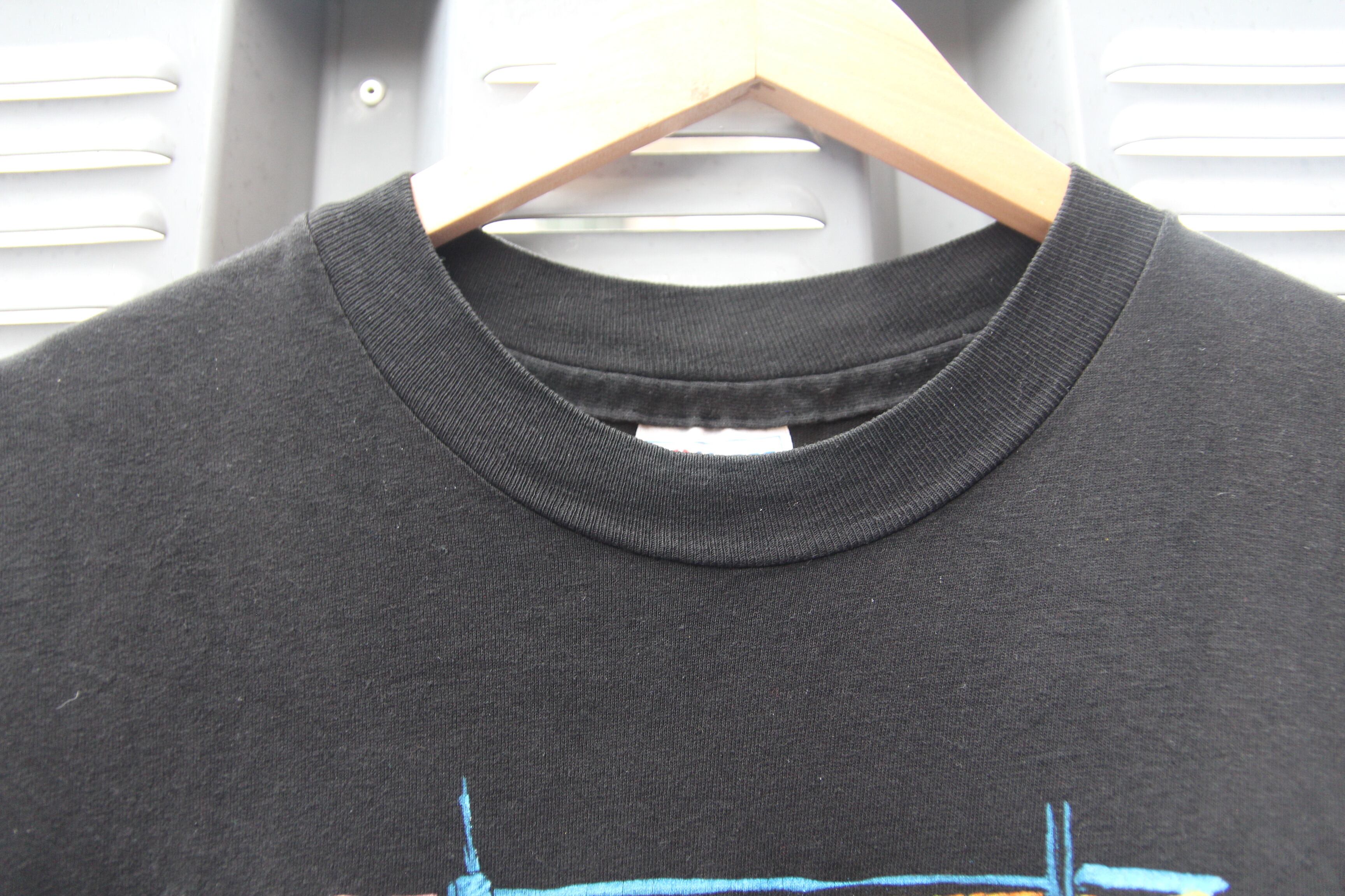1980年代のHanes製のクルーネックTシャツです。こちらのアイテムはフロントのプリントが特徴的で、摩天楼のような景色がよく見るとクレヨンで作られております。80年代のTシャツにしては状態も良いです。シンプルなTシャツも良いですが、少し派手なTシャツでもファッションの幅が広がり、様々なコーディネートが楽しめると思います。お好きな方や、気になる方は是非この機会にご検討のほど宜しくお願い致します。