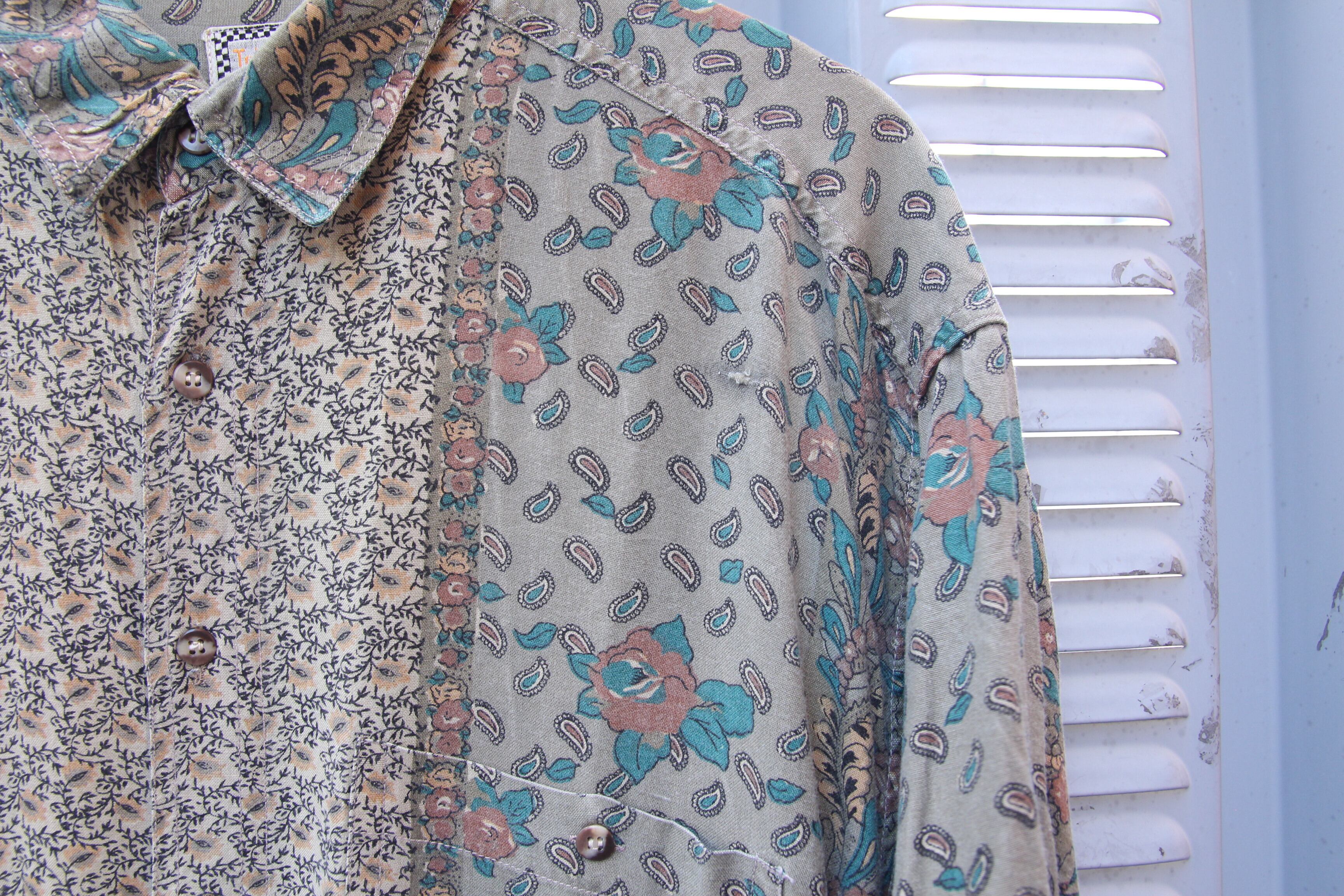 1990年代頃のTriple5製のレーヨンシャツとなります。こちらのアイテムはペイズリー柄を基調とした総柄のシャツです。サイズもXLと大き目で女性が着用しても男性が着用しても可愛く着こなせます。中にシンプルなロンティーを合わせても夏には一枚でもコーディネートが成り立つアイテムです。レーヨンなので生地も軽く着やすいアイテムです。状態も良いので、この手のアイテムがお好きな方や、気になる方は是非この機会にご検討の程宜しくお願い致します。