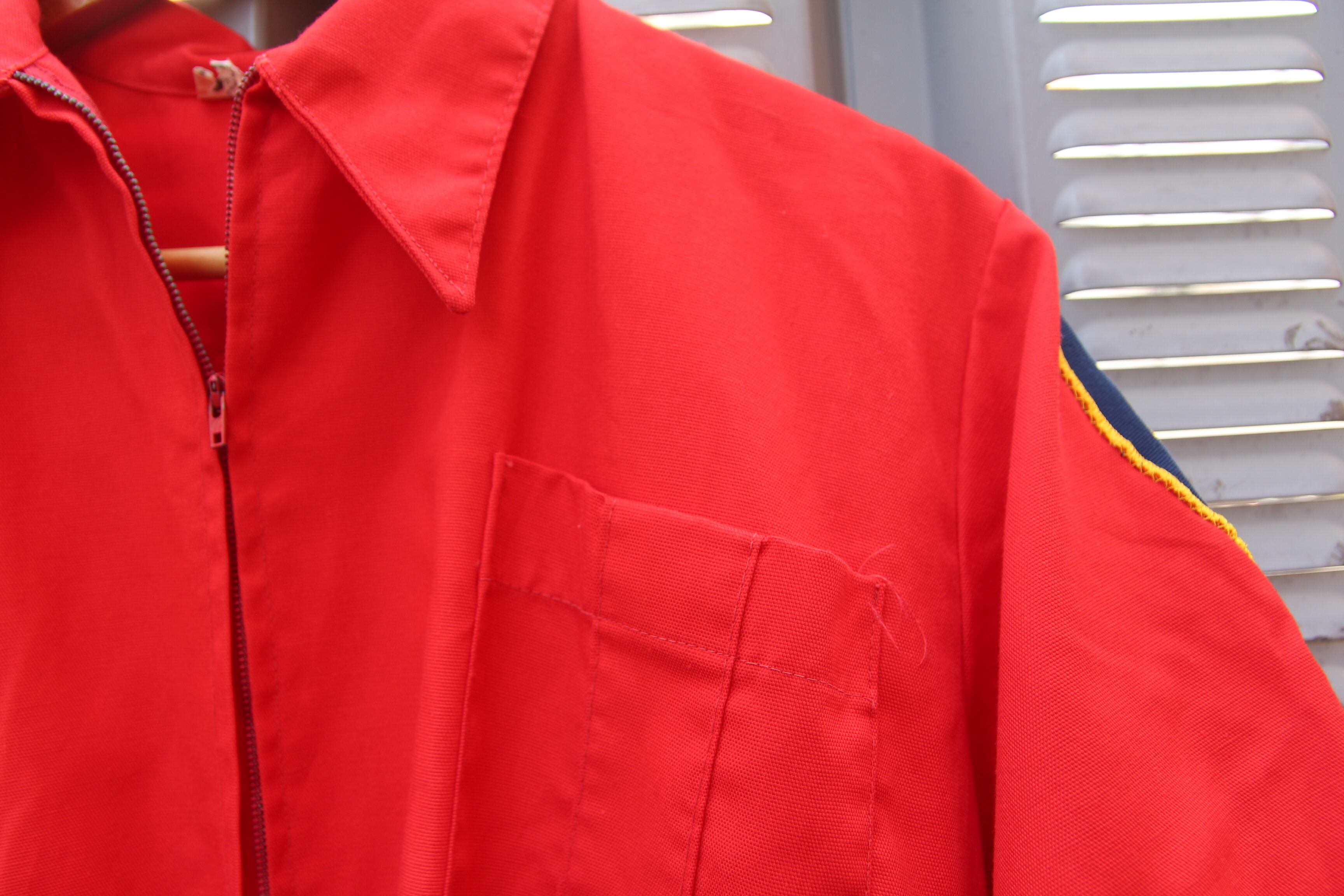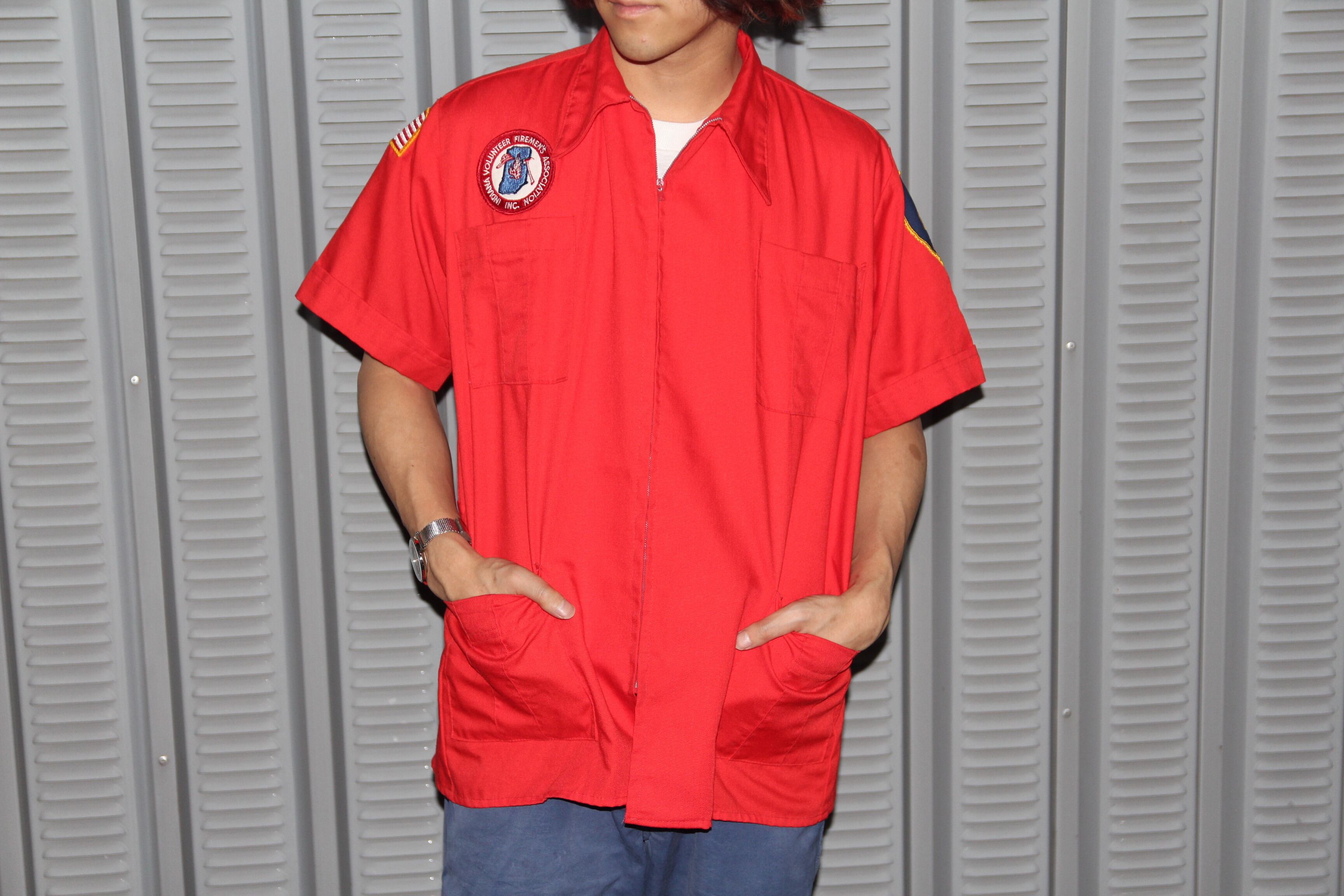 1970年代頃のファイヤーマンシャツです。消防団で着用されるアイテムです。消防系のアイテムは返納義務があるので、市場に出回ること自体が貴重なアイテムです。こちらのアイテムは鮮やかな赤色で、フロントには4つポケットが付いており、右肩や、両袖に所属していた消防団のワッペンが取り付けられております。バックにはレスキュー隊のプリントが入っております。サイズ表記はSサイズですが日本サイズでM~Lサイズ程度あります。この手のアイテムがお好きな方や、気になる方は是非この機会にご検討の程宜しくお願い致します。