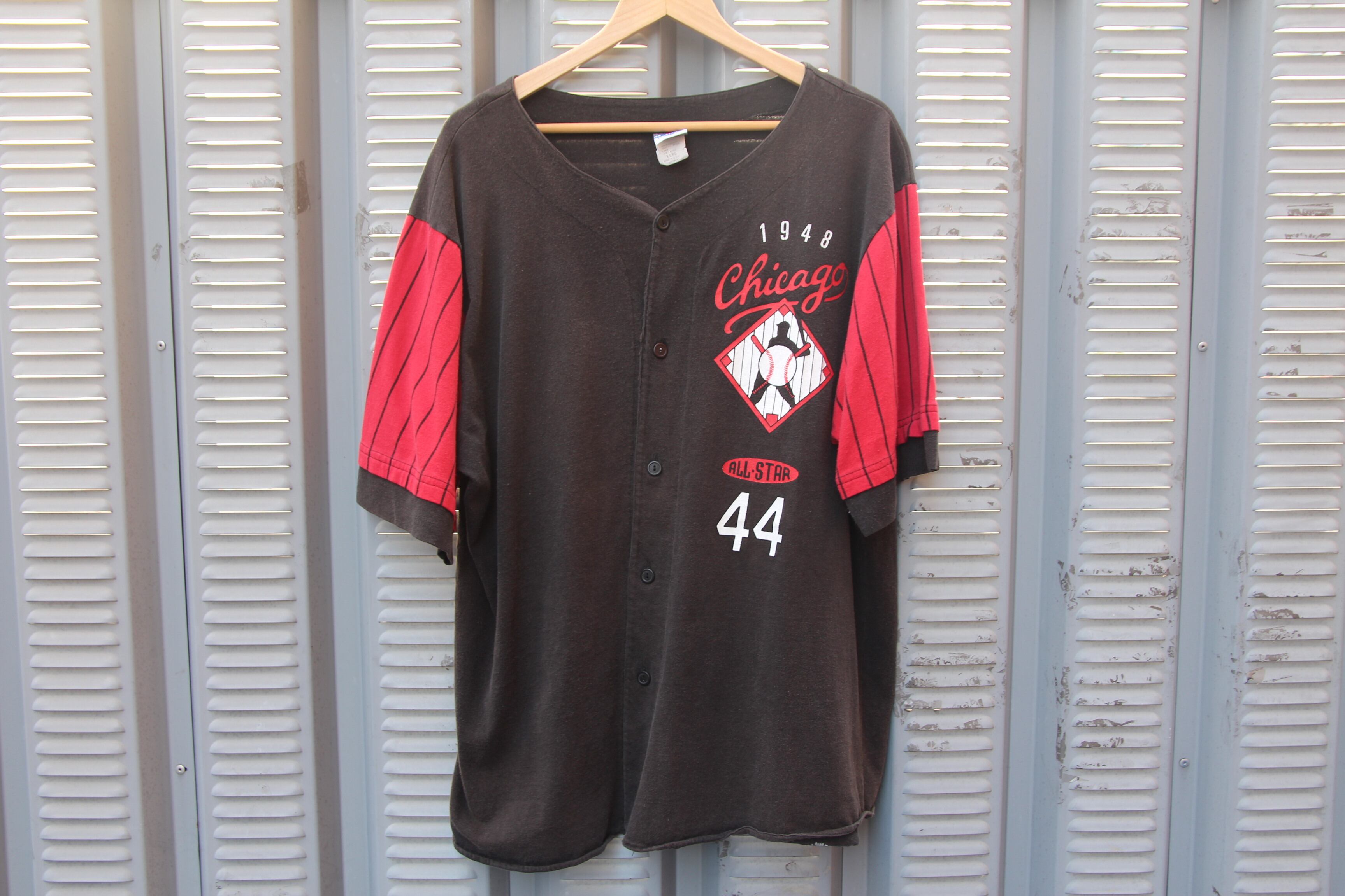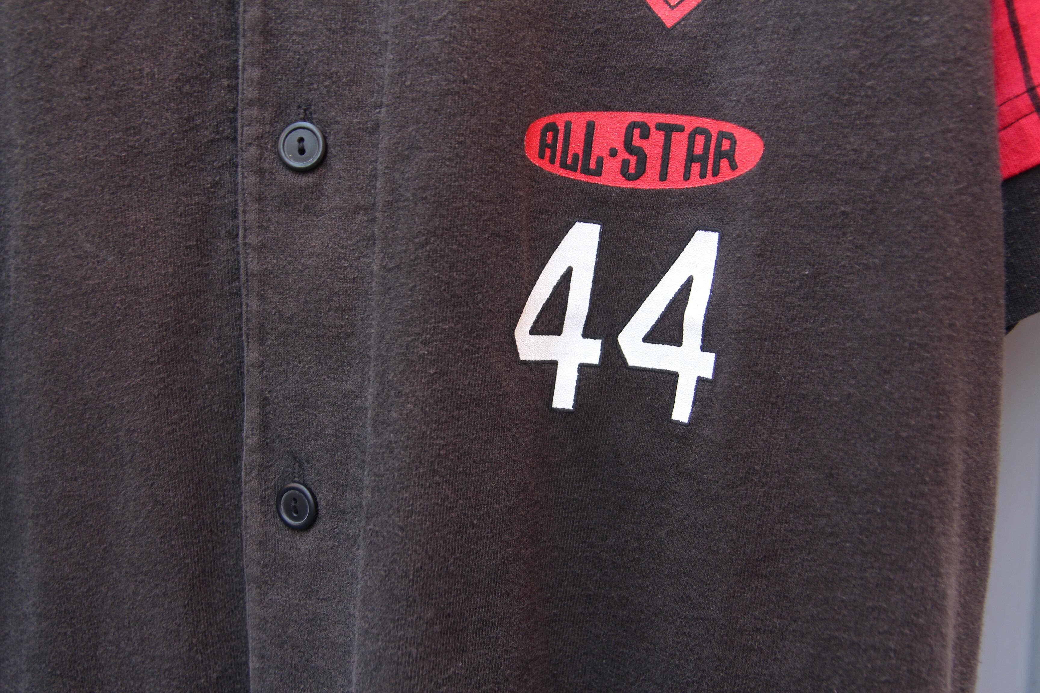 1980年代のPro spirit製のベースボールシャツとなります。こちらは1983年にシカゴで行われたオールスターゲームを記念して作られたものだと思います。赤と黒の配色が特徴的で、サイズもXLと大き目ですので羽織として着用しても良し、前を閉めて着用しても良しのアイテムです