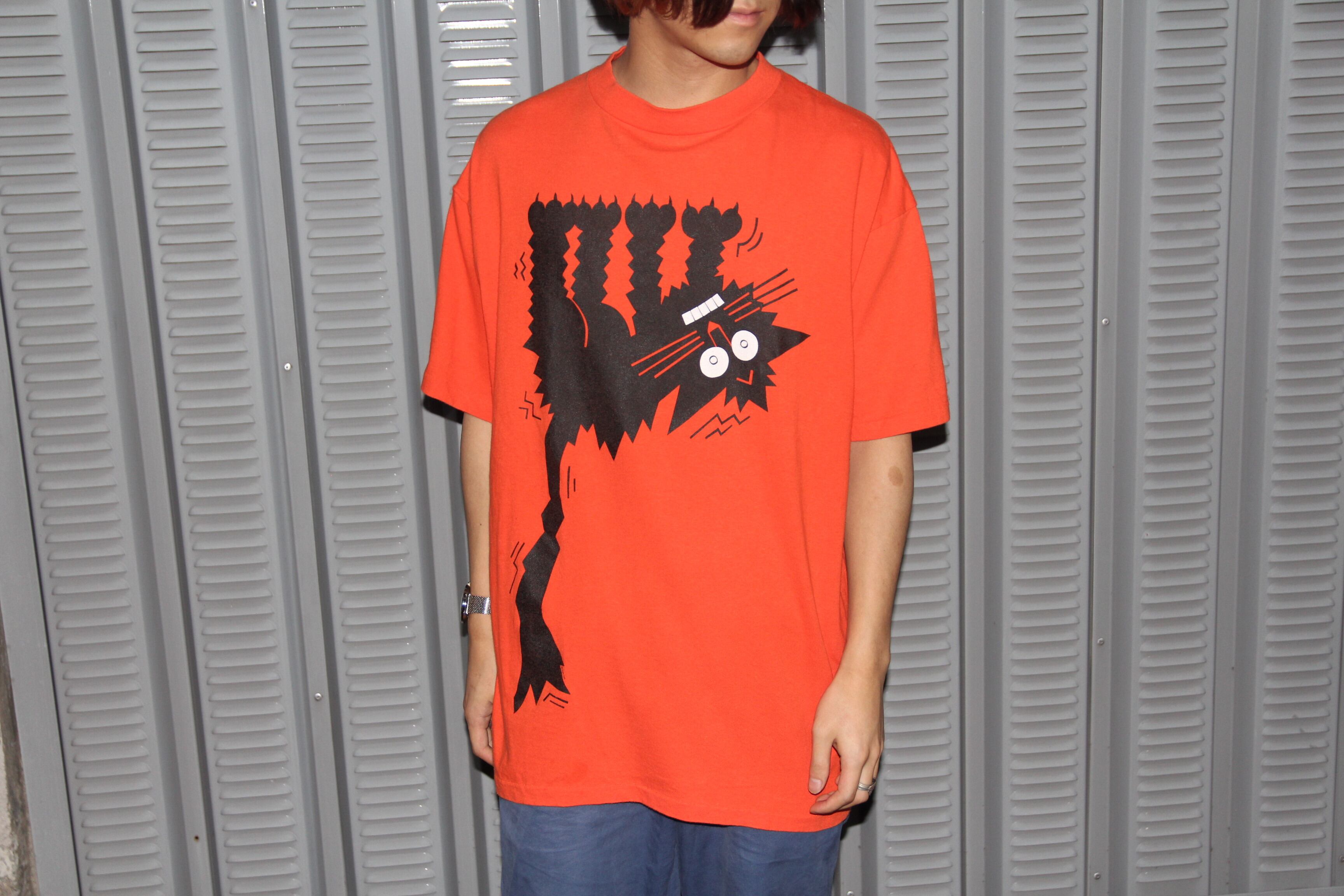 1990年代のDelta製のクルーネックTシャツとなります。近年バンドTシャツなどにっも多く使われるDeltaです。こちらのアイテムは鮮やかなオレンジ色に猫が逆さまになっているプリントが特徴的です。タグには当時付けられていたショップタグも付いております。このタグだけでも珍しいものだと思われます。この手のアイテムがお好きな方、気になる方は是非この機会にご検討の程宜しくお願い致します。