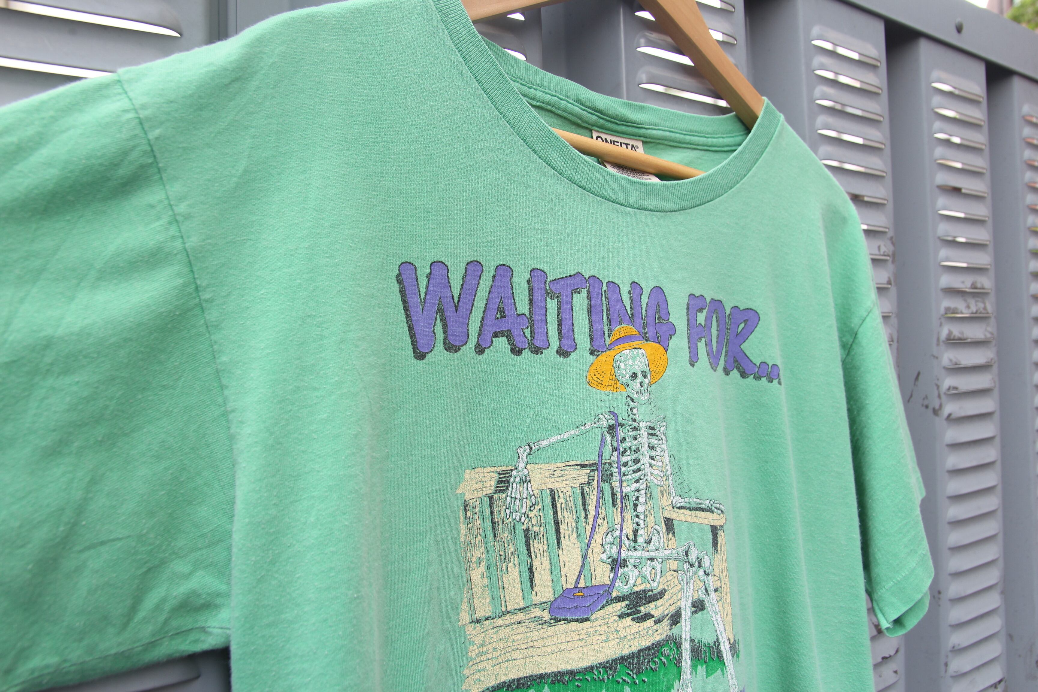 1990年代のOneita製のクルーネックTシャツとなります。1893年ニューヨークにて創業。古くはアスレティック・ボディ系ブランドとしてアンダーウェアを専門的に製造していました。後にTシャツ、パーカー、トレーナー等の製造も開始され、70~80年代からはファッション要素の高いバンドTシャツの製造も始まります。こちらのアイテムはスカルの女性がベンチに座っているデザイン性の高いプリントとコーディネートの差し色になるライトグリーンのボディが特徴です。サイズもLサイズと男女問わず着用して頂けるサイズです。ここの手のアイテムがお好きな方、気になる方は是非この機会にご検討の程宜しくお願い致します。