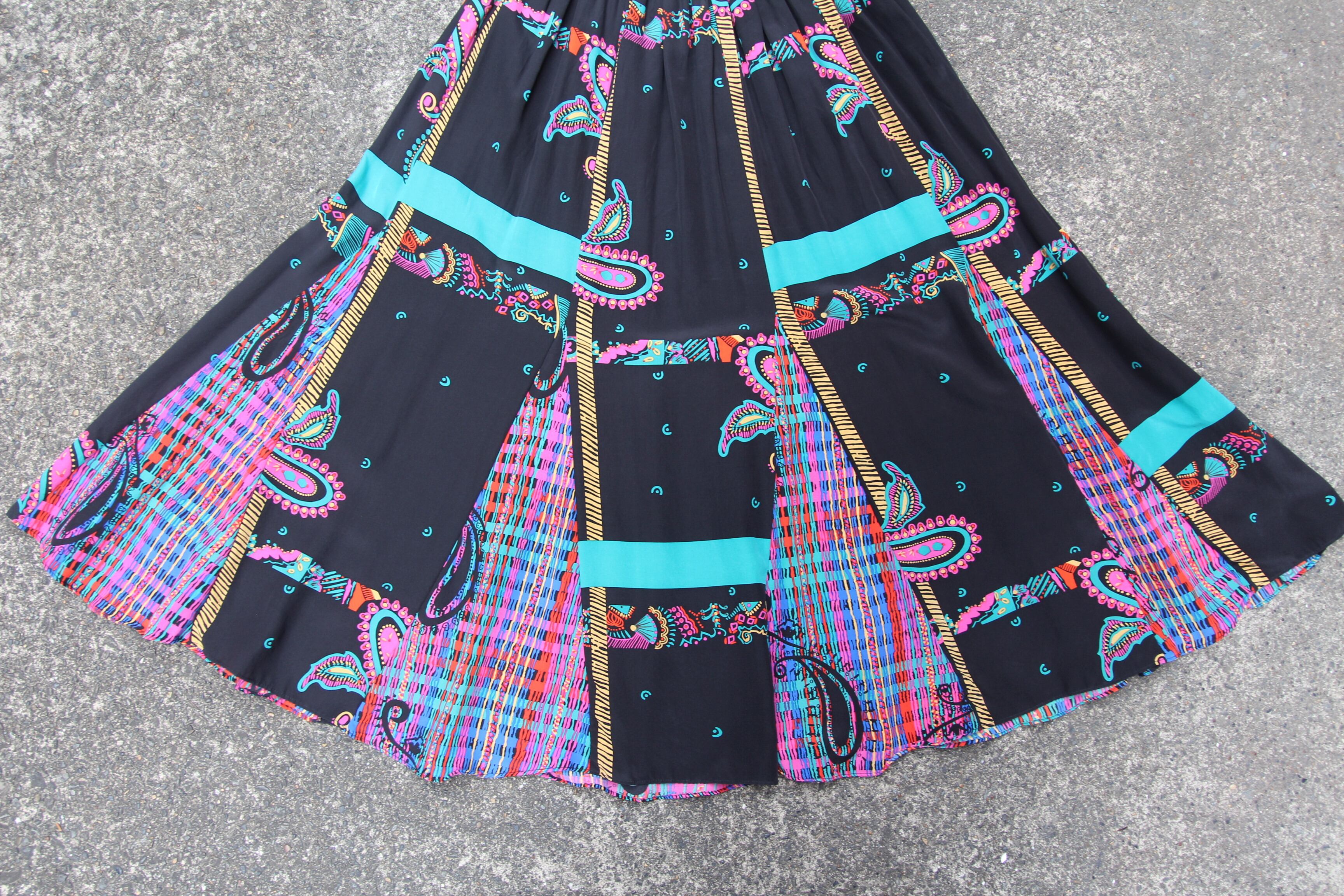 シルクのプリントロングスカートです。黒ベースのカラーにビビットな配色のペイズリーとチェック柄が施されています。フレア部分にプリントがあり、風になびくと華やかな印象に切り替わる斬新な構造をしています。見ても着ても楽しめること間違いなしです。気になる方は是非この機会にご検討の程宜しくお願い致します。